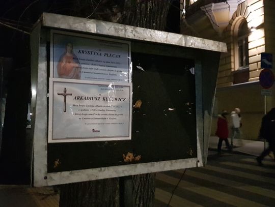Na tablicach informacyjnych zamieszczono klepsydry z następującymi nazwiskami: