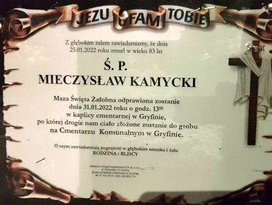 Msza św. żałobna odprawiona zostanie 31 stycznia 2022 r. o godz. 13.00 w kaplicy cmentarnej w Gryfinie.