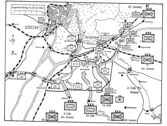 Wydarzenia te skwitował meldunek dowództwa Grupy Armii „Wisła” z 16 marca: „odcięte wczoraj w rejonie Gryfina w wyniku przełamania się wroga do brzegu Odry na południe od Daleszewa oddziały 1. Marine-Schützen-Division przebiły się nocą z 15 na 16 marca w rejonie na południe od Żabnicy do własnych linii, niszcząc przy tym 10 czołgów i 15 dział przeciwpancernych...” To jest ostatnia wzmianka o Gryfinie w niemieckich dokumentach bojowych.