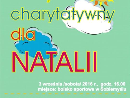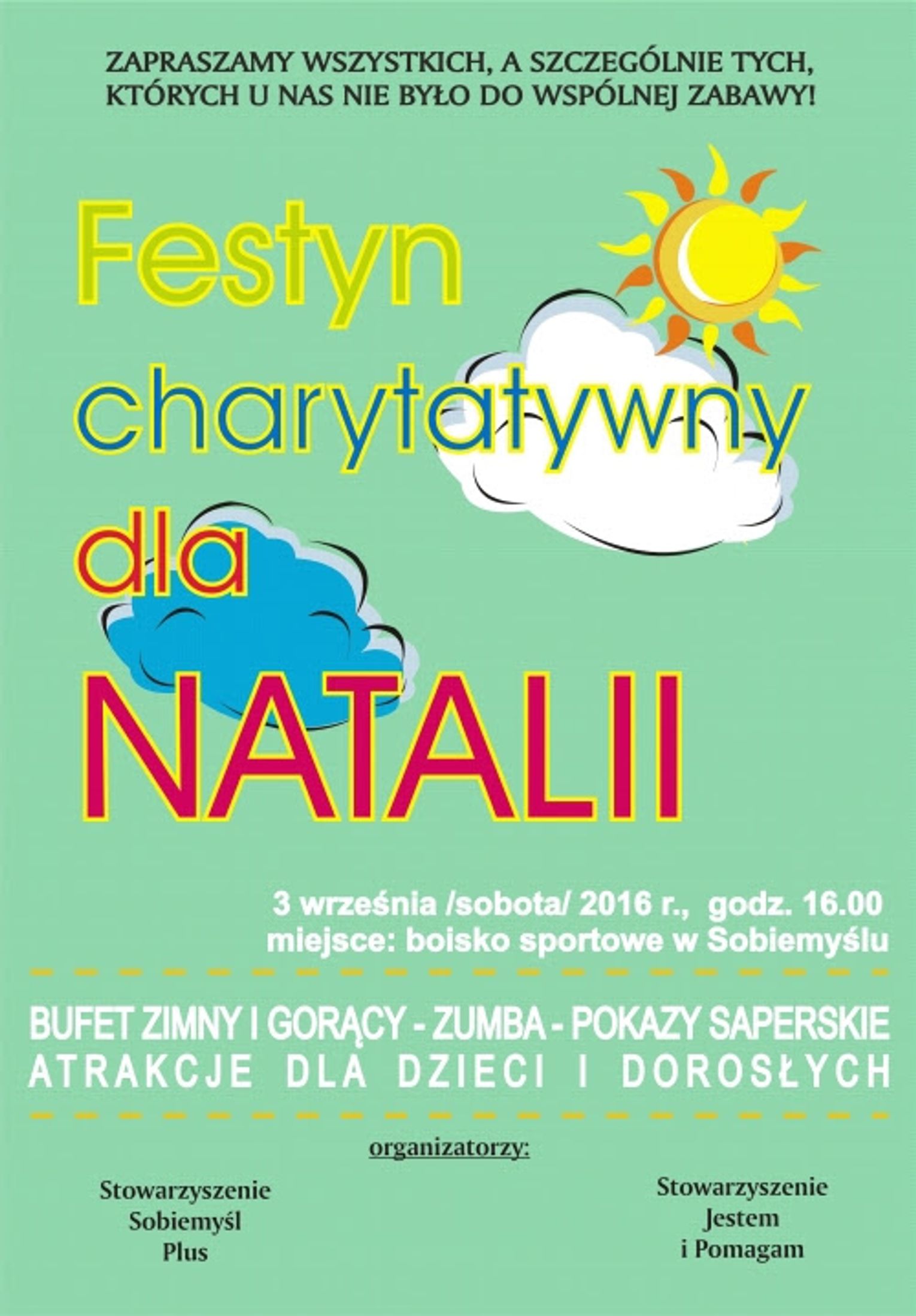 Stowarzyszenie Sobiemyśl Plus, Stowarzyszenie Jestem i Pomagam oraz Gryfiński Dom Kultury zapraszają 3 września 2016 o godz. 16 na boisko sportowe w Sobiemyślu. Zorganizowany tam będzie charytatywny festyn dla chorej Natalii.