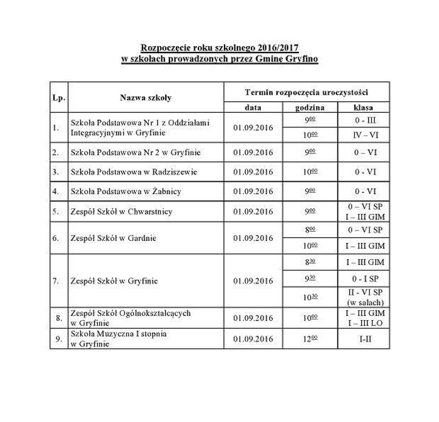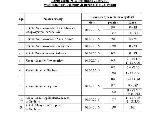 Rozpoczęcie roku szkolnego 2016/2017 w szkołach prowadzonych przez gminę Gryfino 1 września 2016 r.: