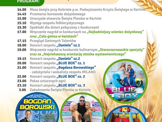 Podczas tegorocznego Święta Plonów na scenie prezentować się będą gwiazdy muzyki disco-polo: Danielo, BLUE - BOX i gwiazda wieczoru Bogdan Borowski – założyciel i wokalista zespołu „MILANO”, twórca i współtwórca utworów: „Jasnowłosa”, „O Tobie kochana” czy „Kasiu Katarzyno”.