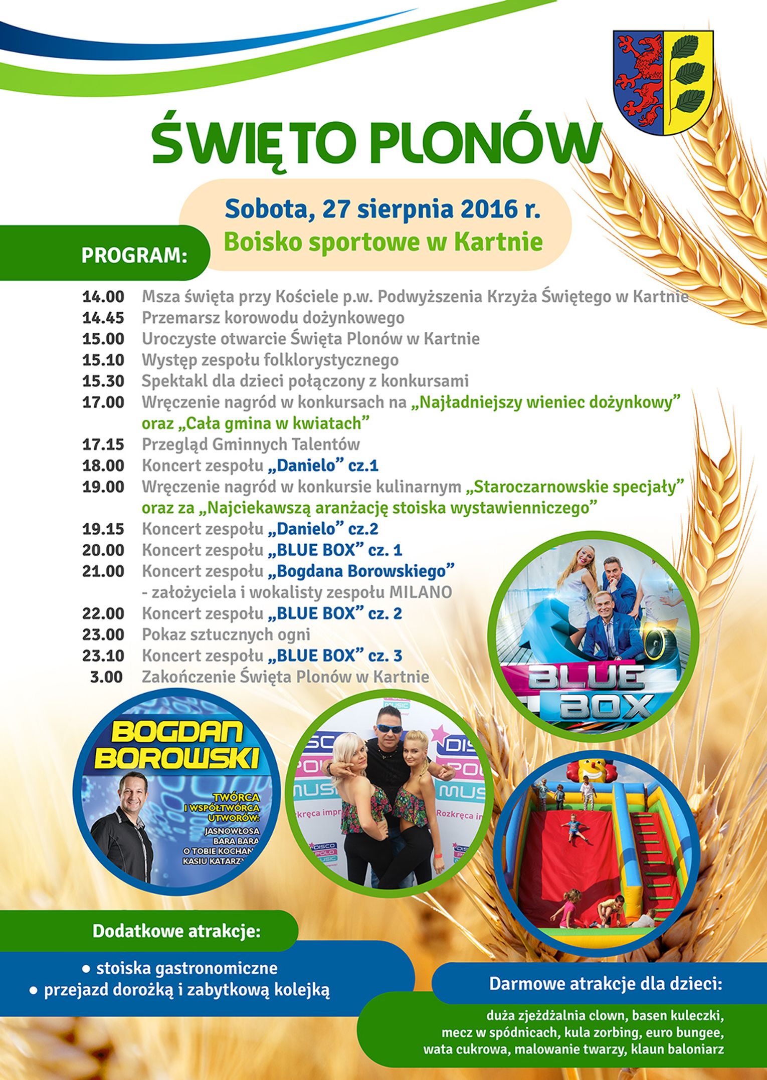 Święto Plonów w Kartnie to doskonała okazja na „rodzinny wypad” na wieś, aby wspólnie spędzić słoneczną sobotę. Na najmłodszych uczestników dożynek czekać będą bezpłatne: wata cukrowa, dmuchane zjeżdżalnie, euro bungee, kula zorbing, basen kuleczki czy „mecz w spódnicach”. Nie zabranie także malowania twarzy, klauna baloniarza, spektaklu teatralnego oraz licznych konkursów, a wyjątkową przygodą będzie przejażdżka odrestaurowaną kolejką „Glinna Express” oraz dorożką.