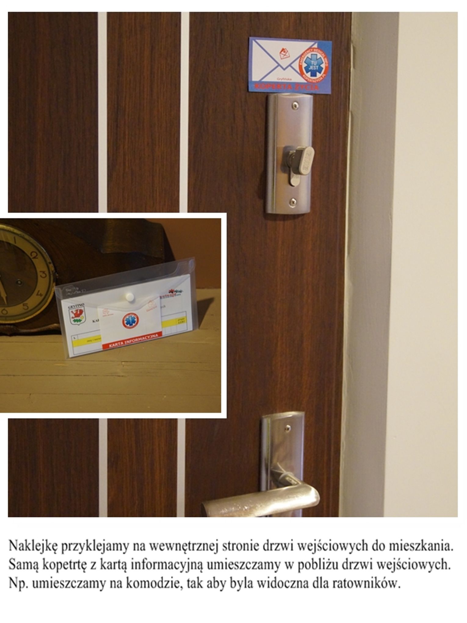 Pacjenci dostaną kopertę która zawiera kartę informacyjną z informacjami o posiadaczu koperty i naklejkę z informacją ; „ tu jest koperta życia”. Naklejkę należy przykleić po wewnętrznej stronie drzwi wejściowych do mieszkania. Natomiast samą kopertę w której jest karta informacyjna o pacjencie , należy umieścić w pobliżu drzwi wejściowych np. przykleić przy domofonie, postawić na komodzie itp. Jednakże tak aby była widoczna dla ratowników.