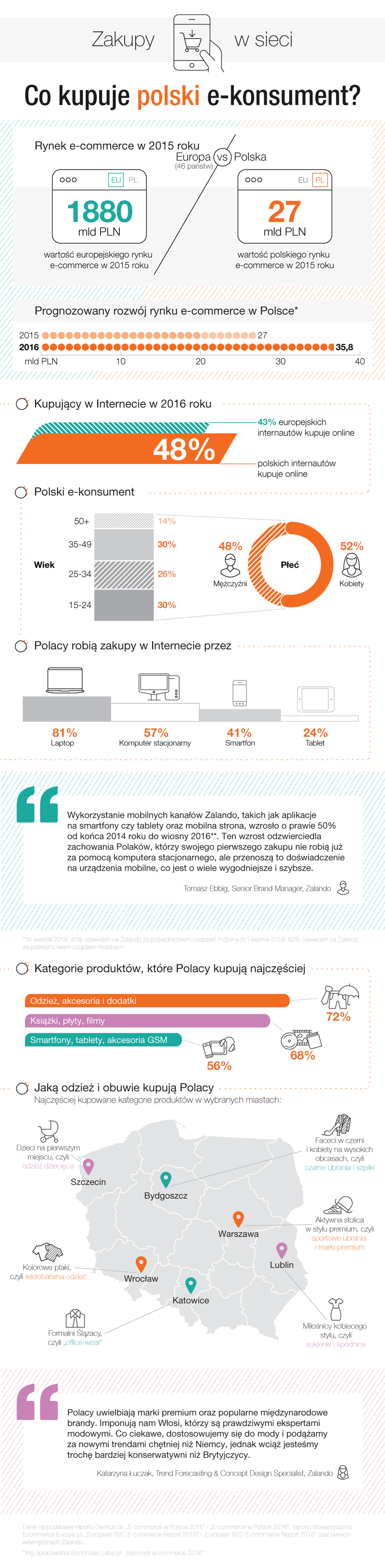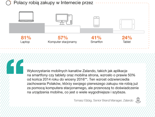 -Polska to najszybciej rozwijający się rynek e-commerce w Europie. Po czterech latach istnienia platformy modowej Zalando.pl widzimy, że dla Polaków zakupy online są czymś zupełnie naturalnym i nie budzą już takich obaw jak kilka lat wcześniej – mówi Tomasz Ebbig, Senior Brand Manager w Zalando. – Coraz więcej osób próbuje e-zakupów, a kanały mobilne odgrywają coraz większe znaczenie wśród konsumentów. Liczba wizyt na naszej stronie przez urządzenia mobilne wynosi obecnie 62%, a od końca 2014 roku do wiosny 2016 wykorzystanie kanałów mobilnych wzrosło o prawie 50%.