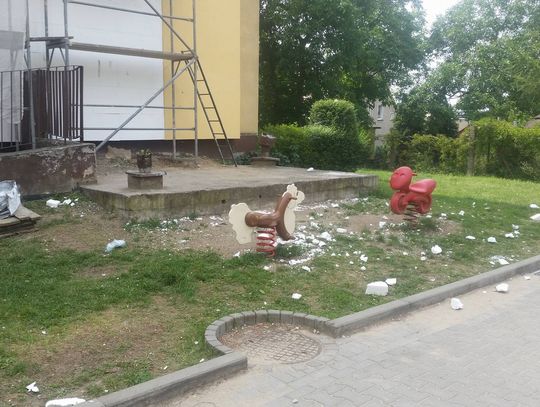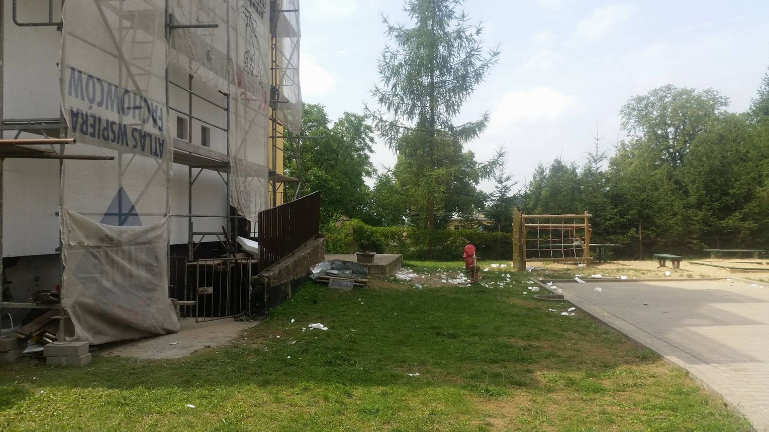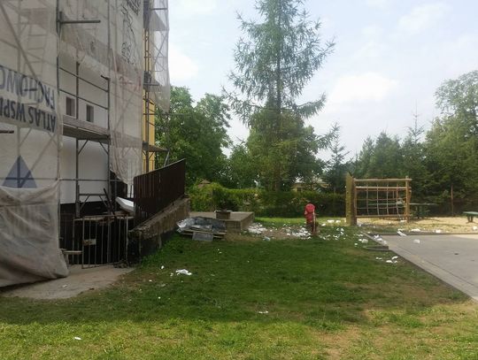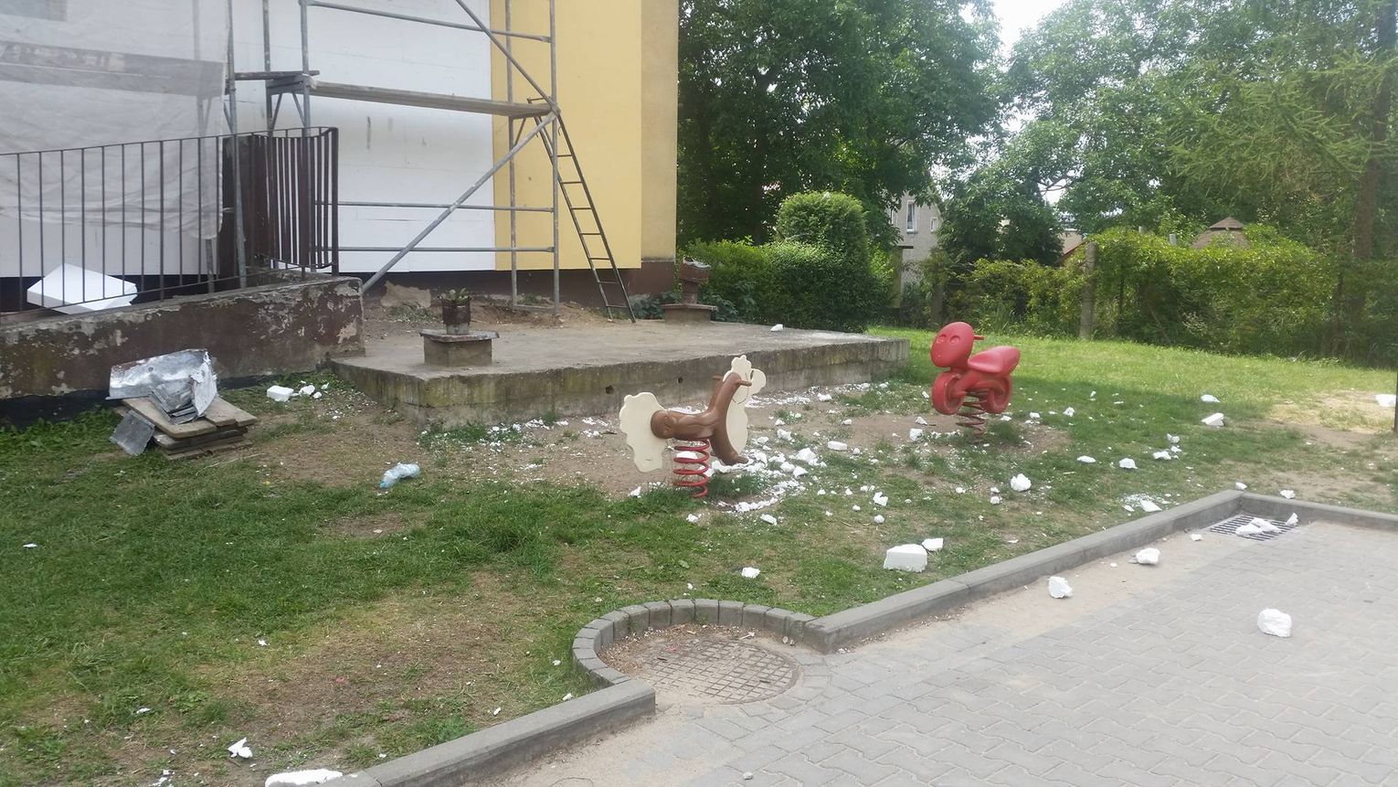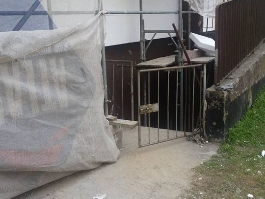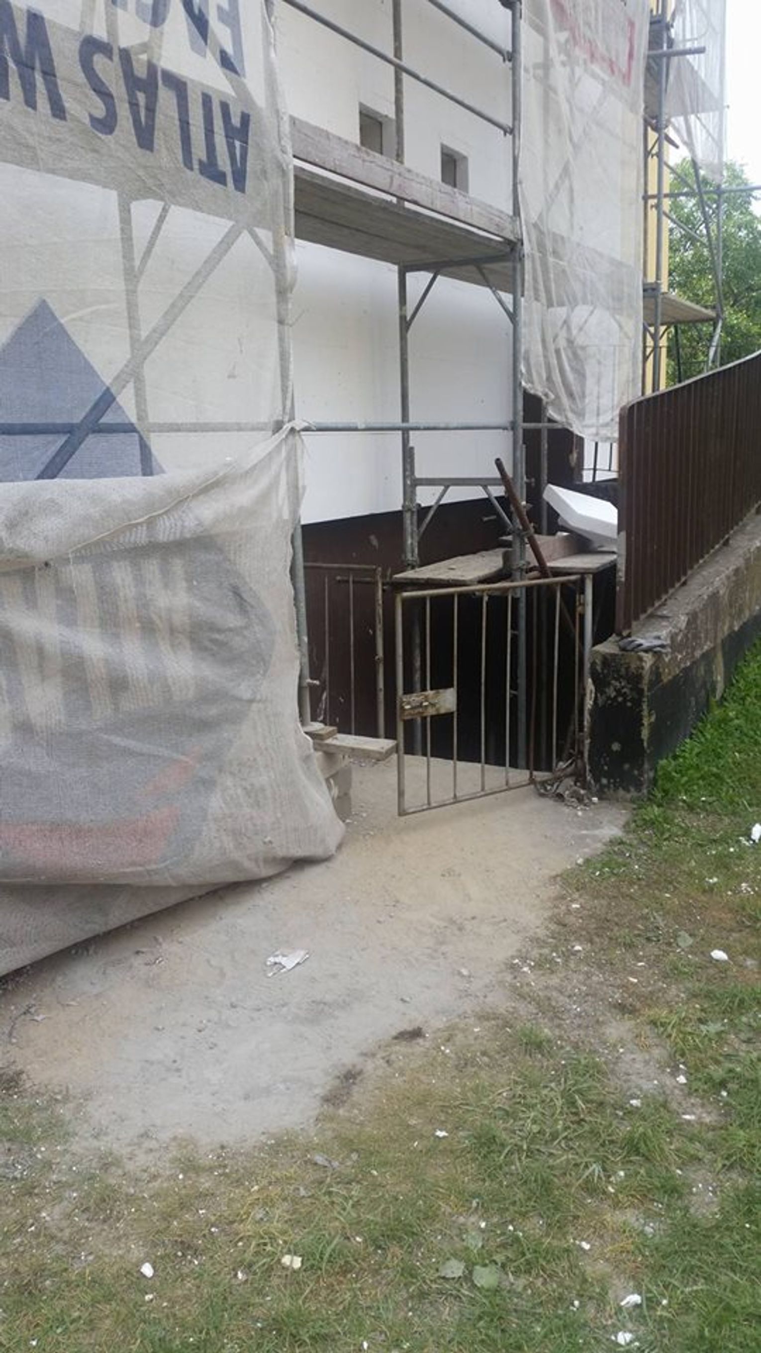 Piszę do Państwa w sprawie ocieplenia budynku przy ulicy Mieszka I w Gryfinie. Prace idą sprawnie, wszystko byłoby dobrze. Poza jednym „ale”, a nawet dwoma. Po pierwsze styropian służący do ocieplenia nie został zabezpieczony w żaden sposób. Wrzucono go za barierkę (zejście do PECu), której nawet nie zamknięto (widoczne na zdjęciach). Ponadto ostre elementy dachowe leżą tuż przy placu zabaw dla dzieci! Przecież ktoś za to odpowiada! Kto będzie winny, jeśli dziecko się przewróci i skaleczy o tę blachę? Na dodatek na placu zabaw fruwa pełno kawałków styropianu, a dzieci mają świetną zabawę w jego rozwalaniu.