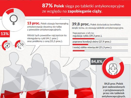 Jak pokazują wyniki badania, główny cel stosowania tabletek jest oczywisty – najważniejsze dla respondentek okazało się ich działanie antykoncepcyjne. Zdecydowana większość badanych kobiet (87 proc.) sięga po tabletki antykoncepcyjne ze względu na zapobieganie ciąży. Pozostałe uczestniczki badania (13 proc.) stosują hormonalną antykoncepcję doustną z innych powodów niż tylko zapobieganie ciąży. Wśród tych powodów najczęściej wymieniano nieregularny cykl (44,1 proc.) oraz problemy z cerą (31,5 proc.). Choć główny powód stosowania pigułek nie uległ zmianie przez kilka ostatnich lat, to porównanie wyników z kilku ostatnich lat pokazuje, że zwiększa się odsetek pań wybierających tabletki z powodów pozaantykoncepcyjnych - w minionych latach aż 96 proc. badanych kobiet deklarowało, że stosuje tabletki po to, by zapobiec ciąży.