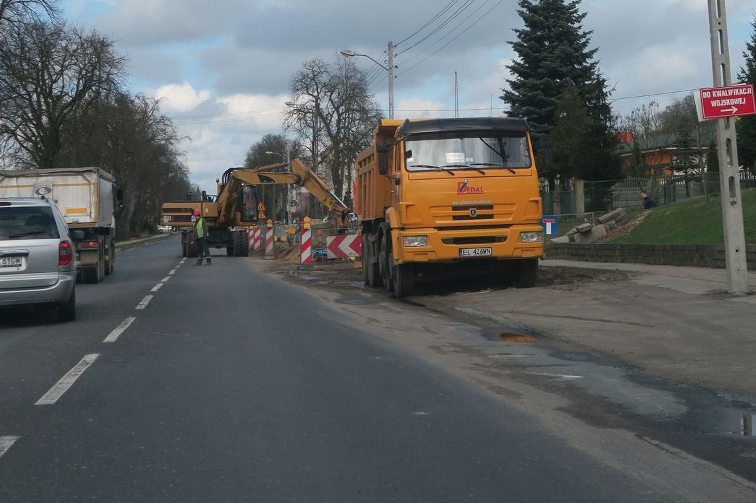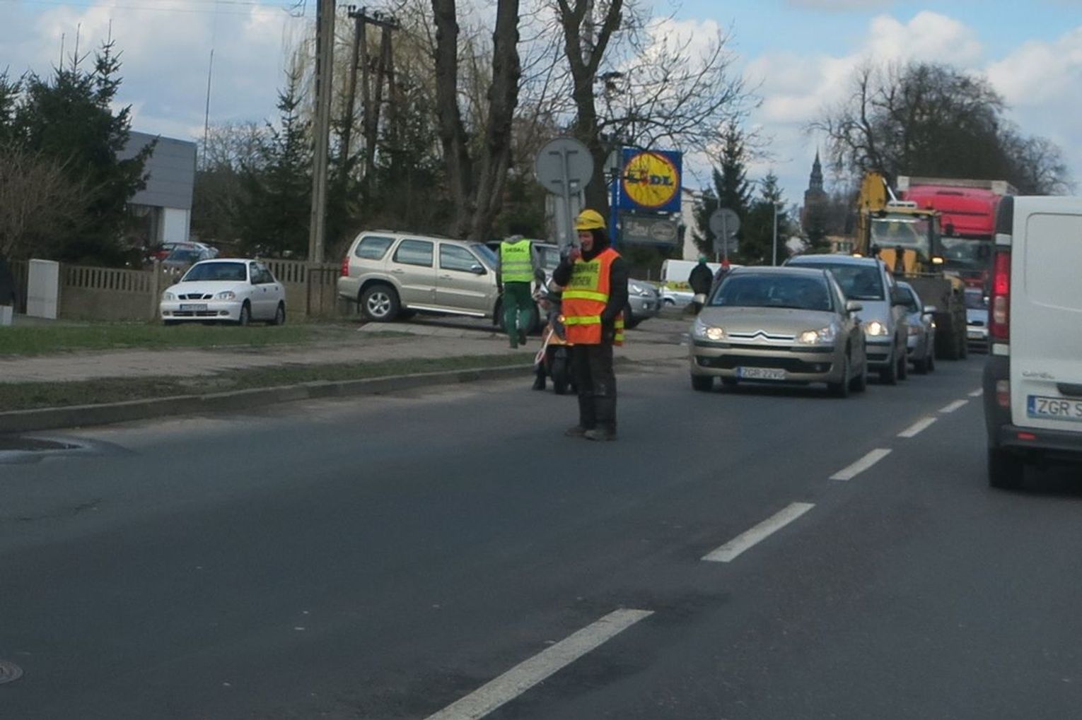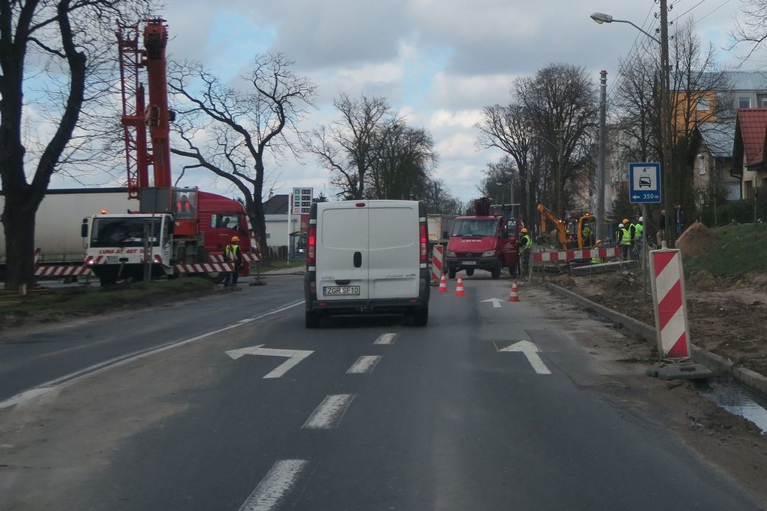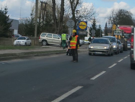 Kolejna ekipa stawia nowe słupy, ale to nie ma bezpośredniego wpływu na płynność ruchu na ulicy Łużyckiej w Gryfinie.