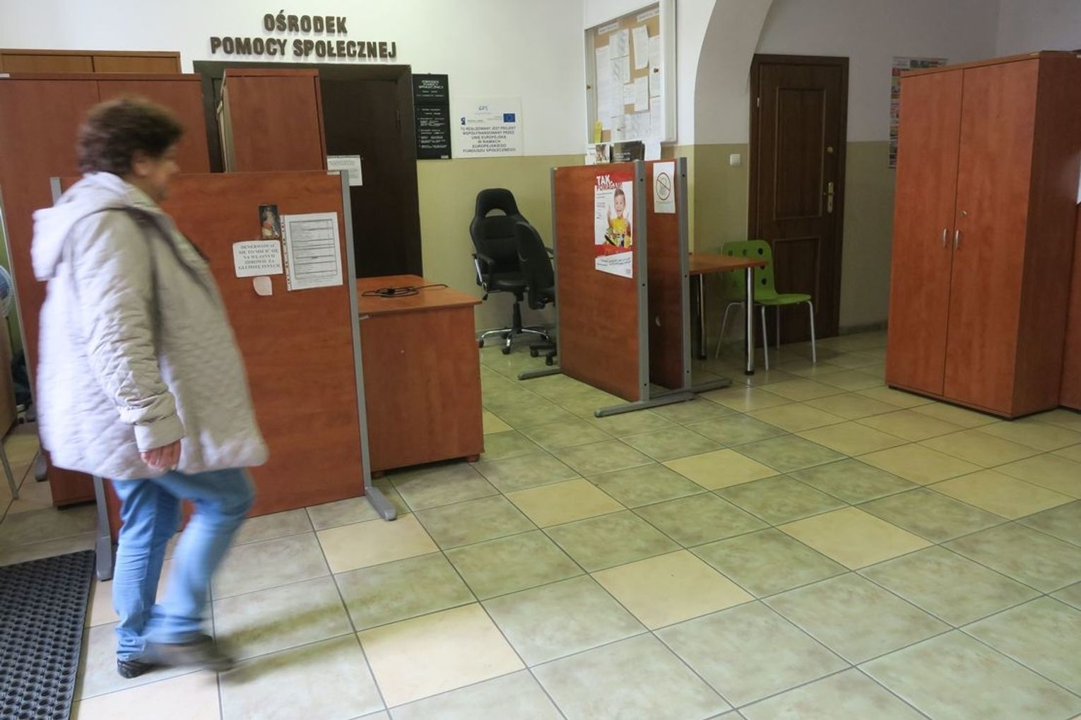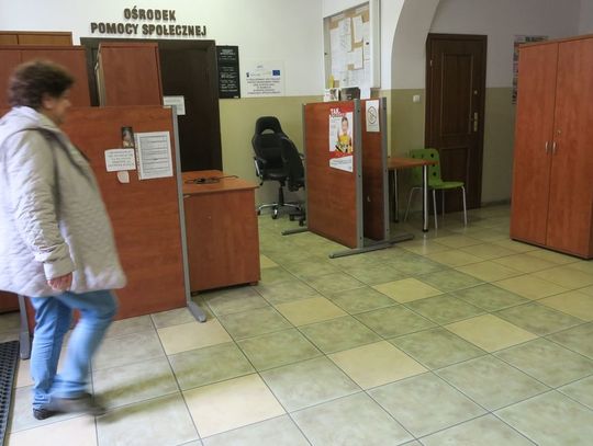 Meble wyciągnięto do holu, ponieważ w pomieszczeniach Ośrodka Pomocy Społecznej wykonano nową wylewkę posadzki. OPS będzie miał nową podłogę...