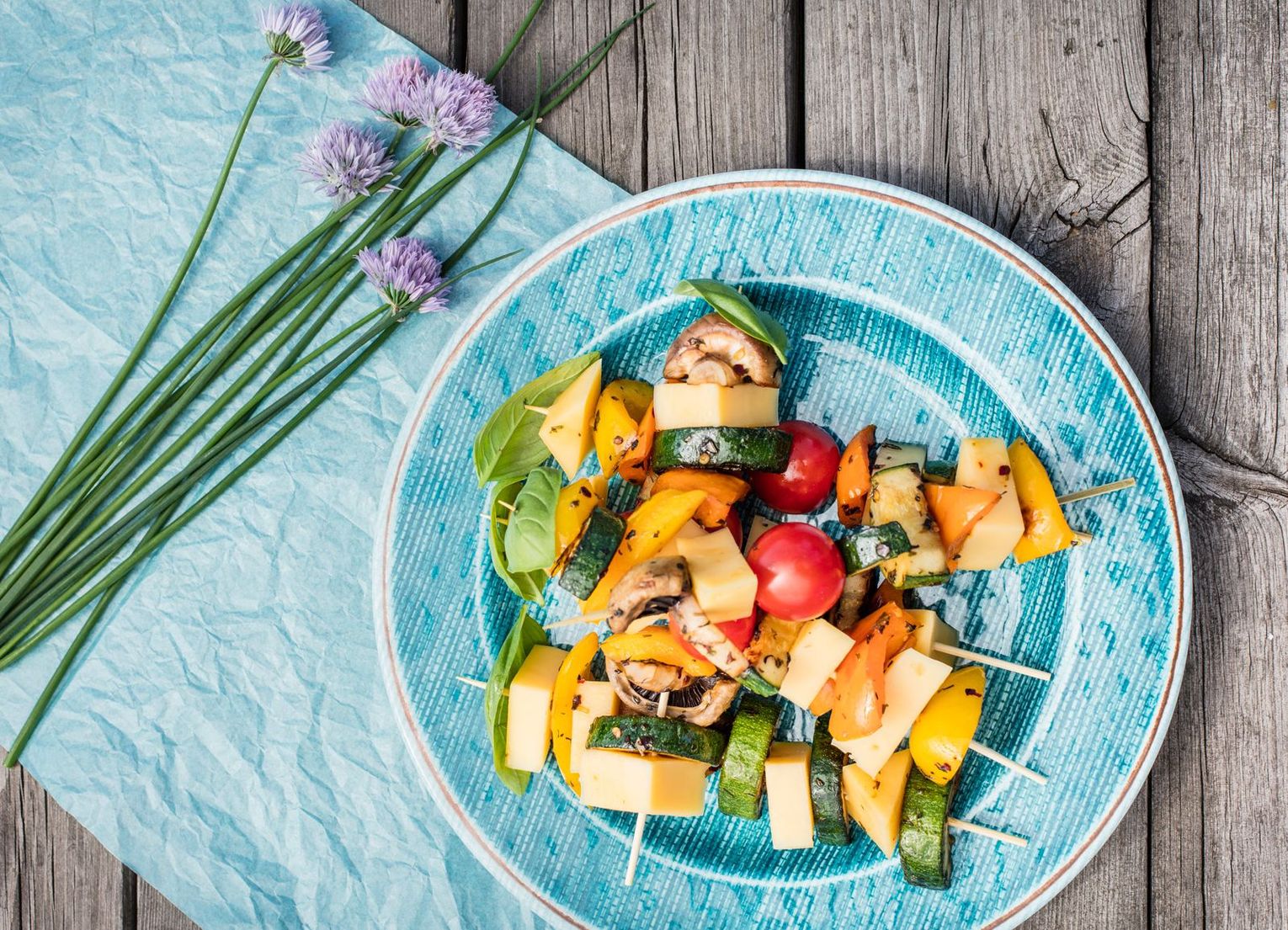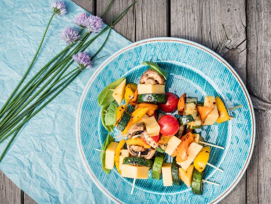 Szaszłyki z serem edamskim i grillowanymi warzywami