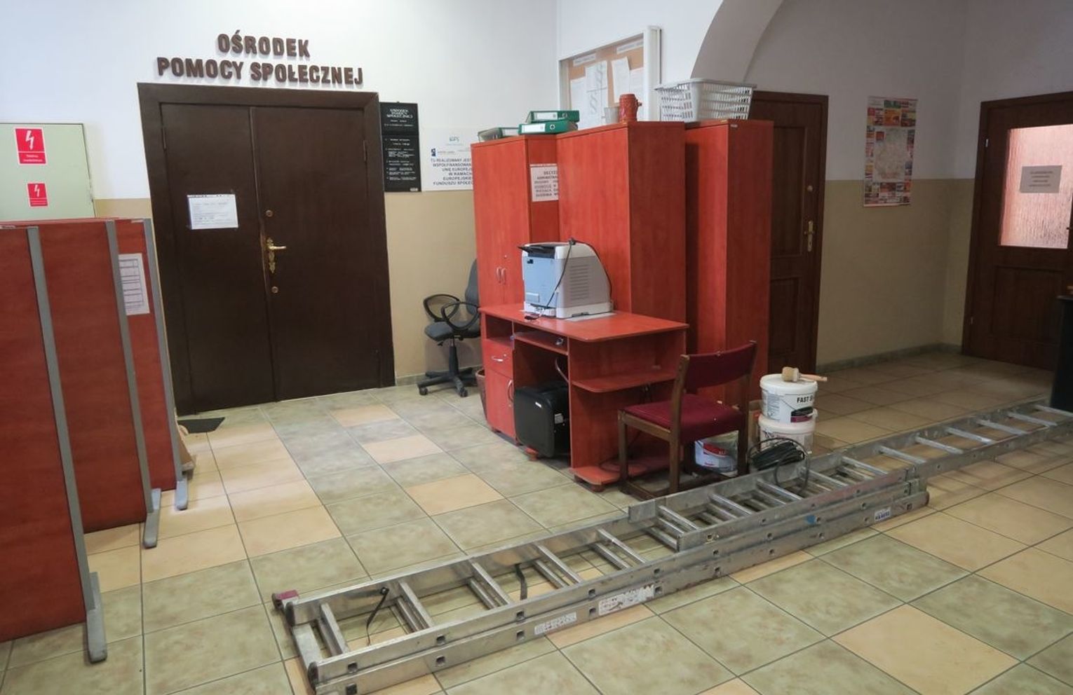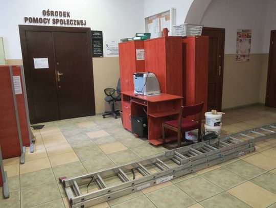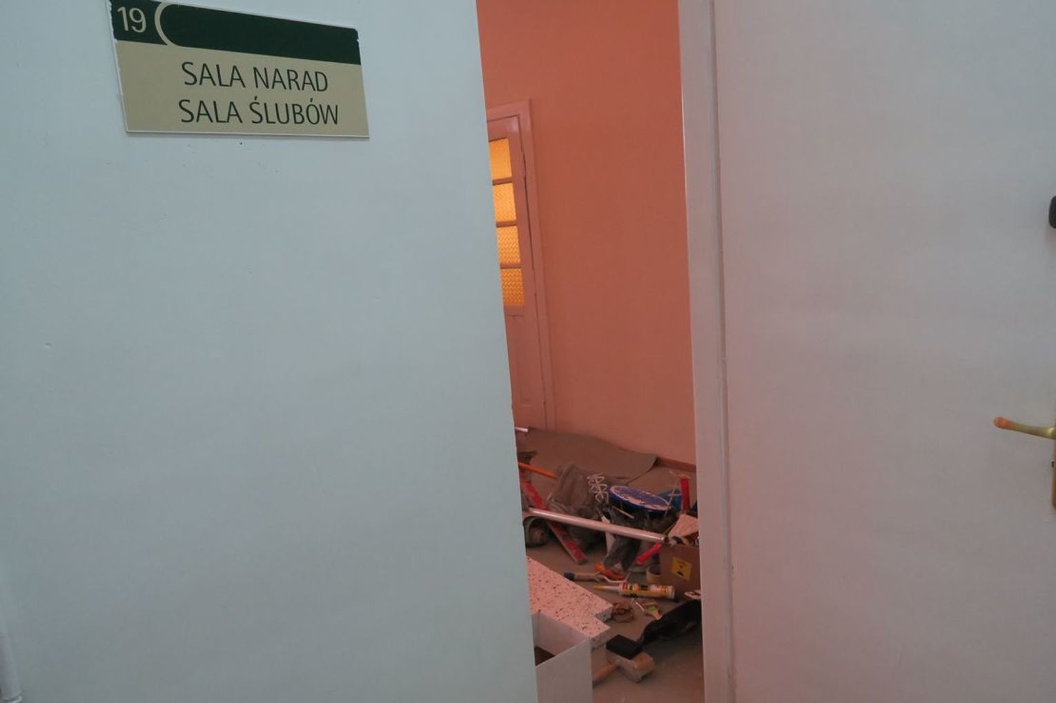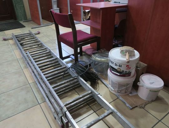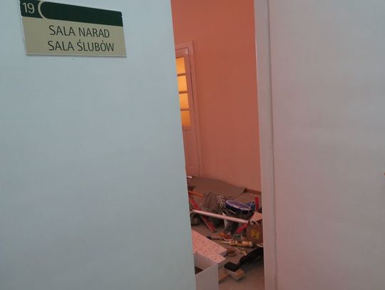 Już wchodząc do budynku Urzędu Miejskiego w Mieszkowicach można było dziś, 13 kwietnia 2017 r. nadziać się na drabinę. Bałagan jest na parterze i na piętrze, gdzie znajduje się sala ślubów. W związku z tym dzisiejsza sesja Rady Miejskiej w Mieszkowicach odbyła się w domu kultury.