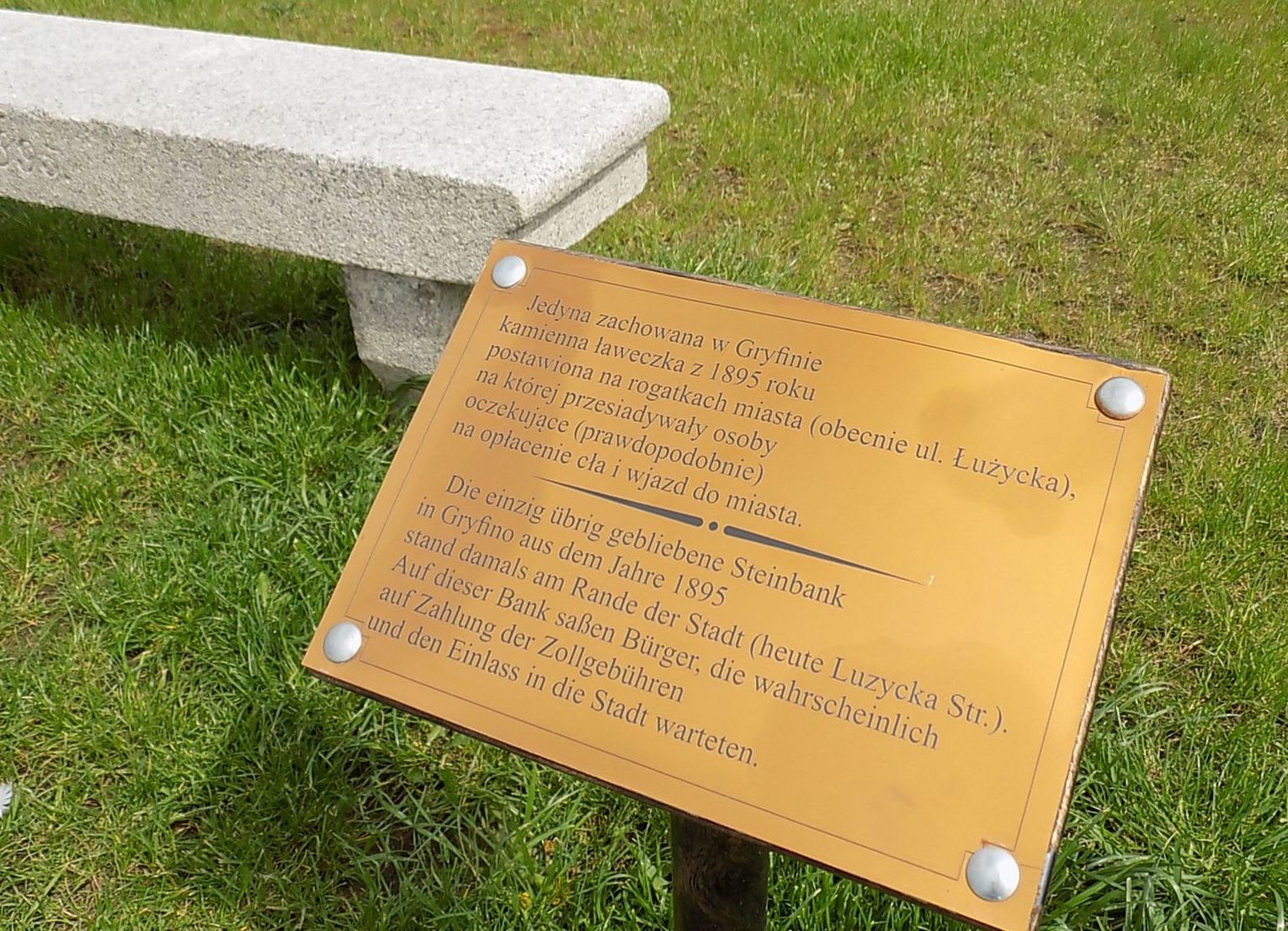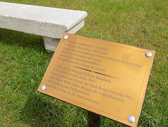 Wielu naszych czytelników interesowało się losem kamiennej ławeczki i martwiło się, co się z nią stało. Otóż została ona odrestaurowana i postawiona na nabrzeżu. To jedyna zachowana w Gryfinie kamienna ławeczka z 1895 roku postawiona na rogatkach miasta (obecnie ul. Łużycka). Na takich ławeczkach przesiadywały osoby oczekujące (prawdopodobnie) na opłacenie cła i wjazd do miasta.