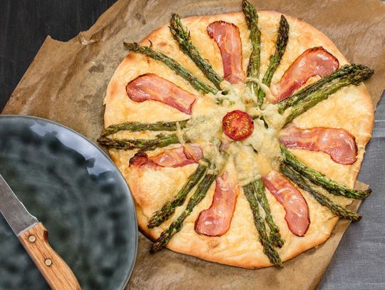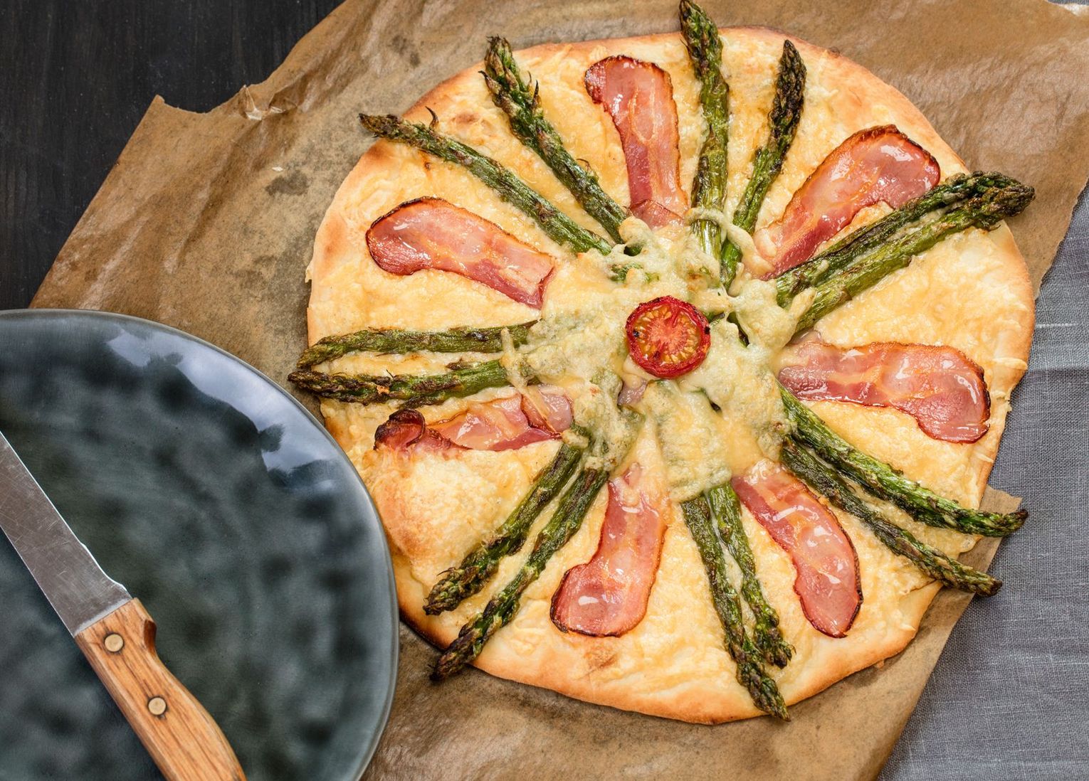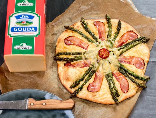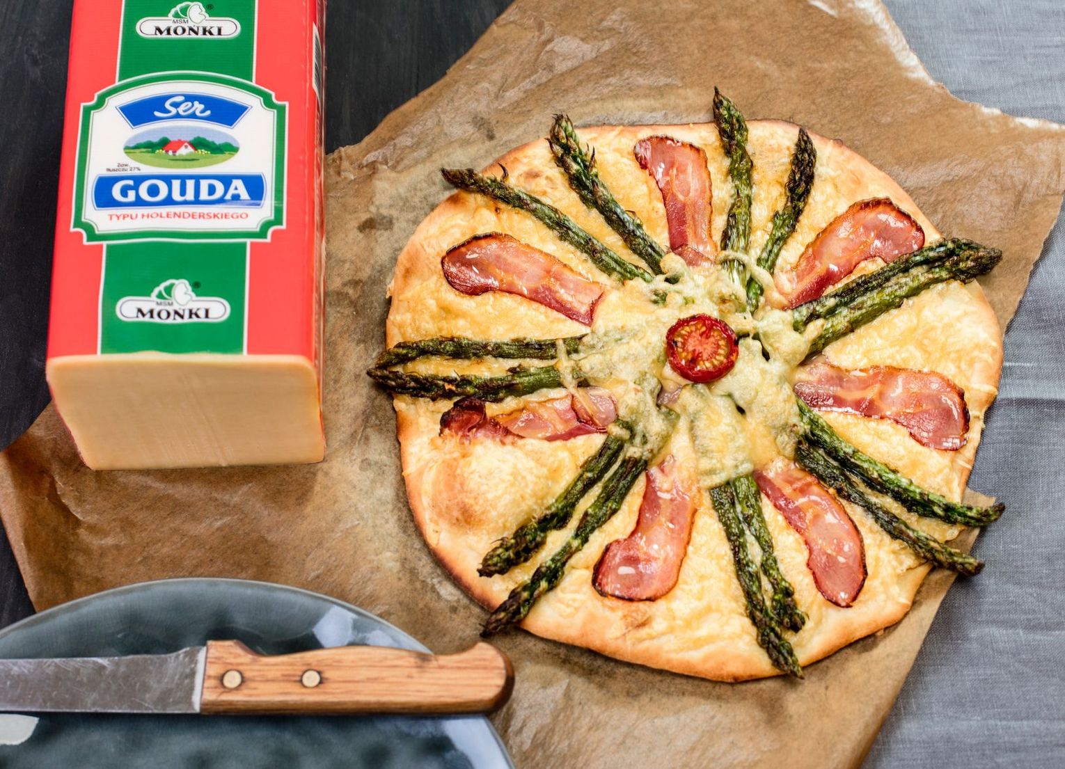 Szparagi z serem gouda i boczkiem na cieście drożdżowym