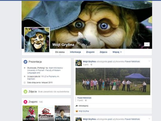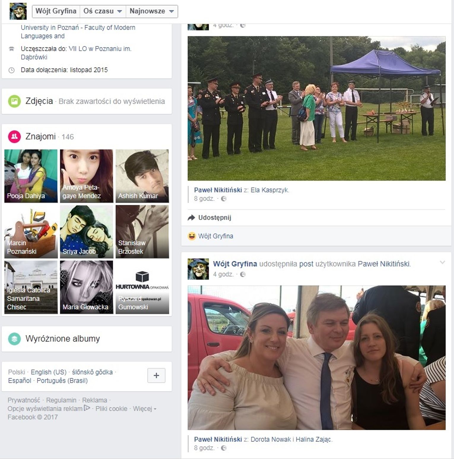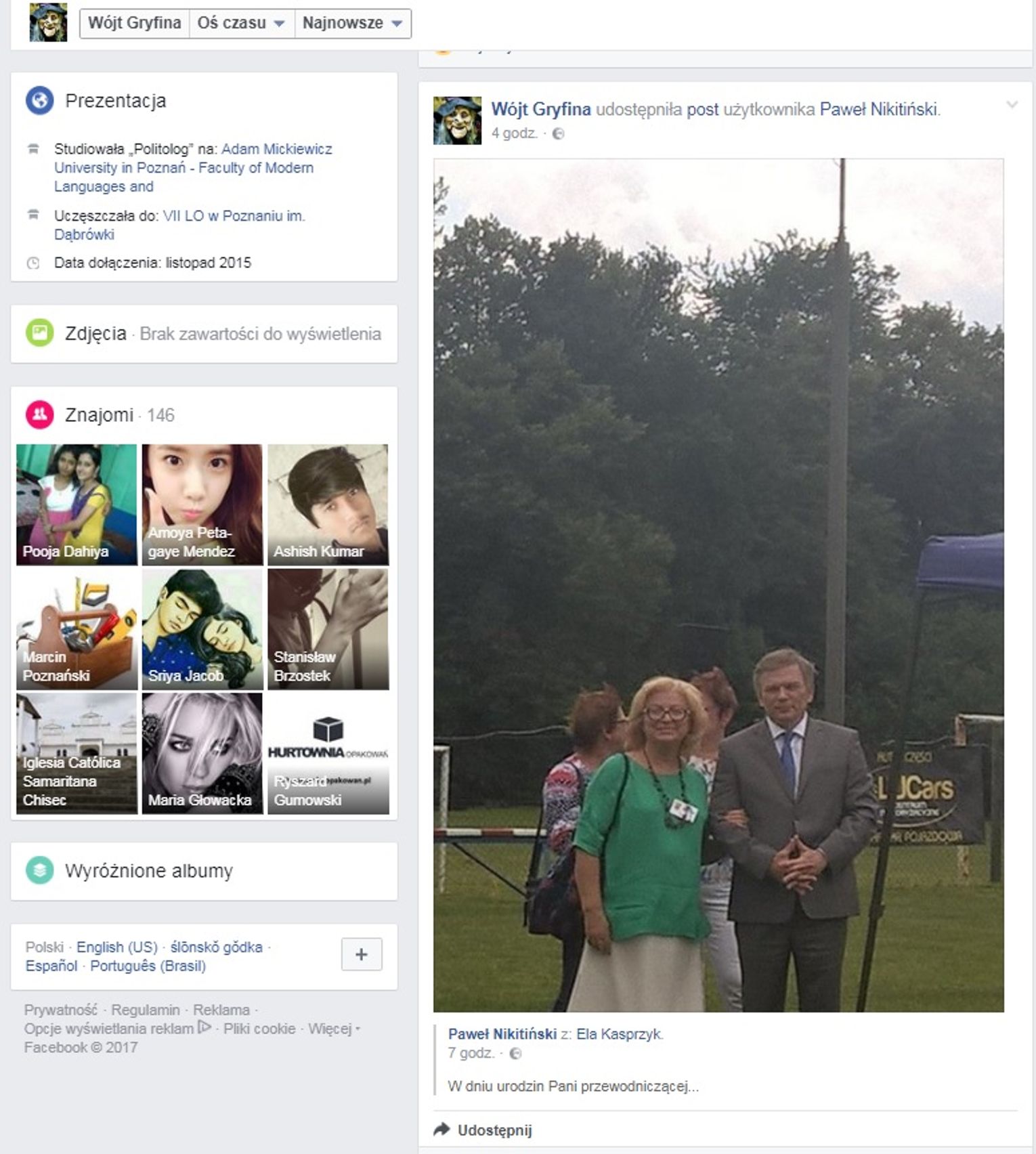 Podaje, że ma ukończone studia politologiczne na Uniwersytecie w Poznaniu. Mieszka w Gryfinie, a pochodzi z Gori. Na profilu można znaleźć pobrane posty z pobytu gryfińskiej delegacji w Raciechowicach. Sprawa jest bardzo aktualna, bo do zaprzyjaźnionej gminy nasi przedstawiciele wybrali się 6 lipca 2017 r.