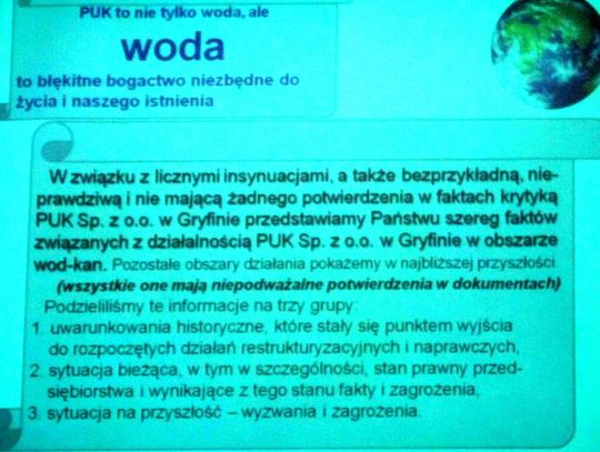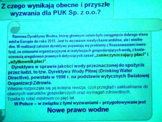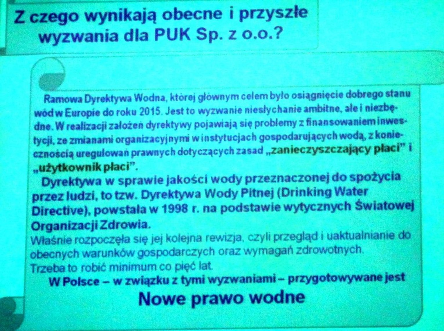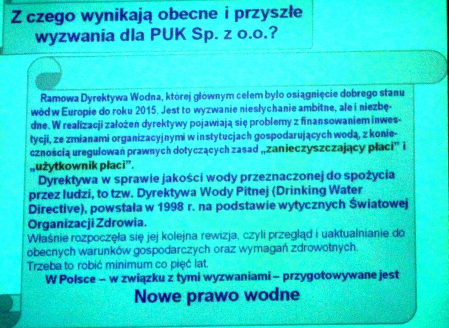 Musicie państwo również pamiętać o tym, że gmina Gryfino jest dosyć rozległą gminą, w związku z tym mamy około 200 km instalacji, co w tak średnich miastach nie jest wcale typowe, bo te miasta są zwykle trochę bardziej zwięzłe. My mamy dosyć duży obszar i w związku z tym musimy mieć więcej przepompowni wody i tego co po wodzie powstaje. Chcieliśmy państwu to pokazać ponieważ są liczne insynuacje i bezprzykładna, zupełnie nieprawdziwa i nie mająca żadnego potwierdzenia w faktach krytyka PUK-u w Gryfinie. Musimy pokazać państwu prawdę absolutną. Wszystkie te rzeczy, które potwierdzam, mają niepodważalne potwierdzenie w dokumentach. Podzieliliśmy to na uwarunkowania historyczne, bardzo dużo na ich temat już powiedziałem, sytuacja bieżąca, w tym w szczególności stan prawny przedsiębiorstwa, wynikające z tego stanu fakty i zagrożenia i sytuacja na przyszłość, czyli wyzwania i zagrożenia, oczywiście pamiętamy, że wyłącznie w aspekcie obszaru wodociągi i kanalizacja. Co nas utrzymuje w sensie prawnym? Jeśli idzie o wodę – ramowa dyrektywa wodna Unii Europejskiej o jakości wody przeznaczonej do spożycia. Dzisiaj słyszałem, że Polska próbuje zabiegać o obniżenie standardów tej wody w Unii Europejskiej. Raczej się to nie uda. Ona powstała w 1998 roku i minimum co 5 lat muszą być przeprowadzane audyty i są u nas przeprowadzane co 5 lat audyty całego majątku zgodnie z tą dyrektywą, którą tutaj państwo mają, można w każdej chwili się odnieść do Drinking Water Directive, ona również uzyskała certyfikację Światowej Organizacji Zdrowia.