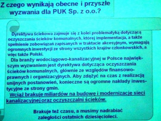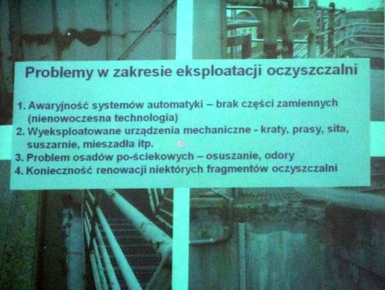 Chcę przejść krótko do problemów, które mamy i do wyzwań, które nas czekają w przyszłości. Oczyszczalnia ścieków oczywiście ze zdjęcia satelitarnego wyglądała wspaniale, ale w rzeczywistości wygląda tak. To jest oczyszczalnia, w której od 2004 roku żadnych istotnych nakładów inwestycyjnych nie poczyniono. Nie poczyniono ich dlatego, że PUK musiał sobie radzić z potężną akcją inwestycyjną w zasadzie nie do końca właściwej współpracy z gminą, czyli gmina żądała od PUK-u więcej niż PUK mógł dać. Mówię to jasno, otwarcie i mogę to udowodnić, z tym, że to może być nudne. W tej chwili ta współpraca jest trochę inna, ponieważ gmina nas czasem słucha. Jeżeli coś się nie obsługuje przez 13 lat, to będzie to wyglądało tak, jak państwo widzą. Awaryjność systemów automatyki, ponieważ one już mają swoje lata, ta oczyszczalnia jest całkowicie zautomatyzowana, ona ma nawet kokpit menadżerski, czyli na jednym ekranie widać wszystkie parametry procesów, które się tam dzieją. Szczególnie mechaniczne urządzenia takie jak kraty, prasy, sita, suszarnie i mieszadła są mocno wyeksploatowane. To jest związane z jakością zrzutów, jakie mamy, z duża ilością zrzutów przemysłowych. Oczywiście mamy problem osadów pościekowych, mamy również problem śmierdzący, jeżeli będą pytania to o tym powiemy i mamy konieczność renowacji niektórych fragmentów oczyszczalni.