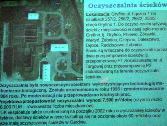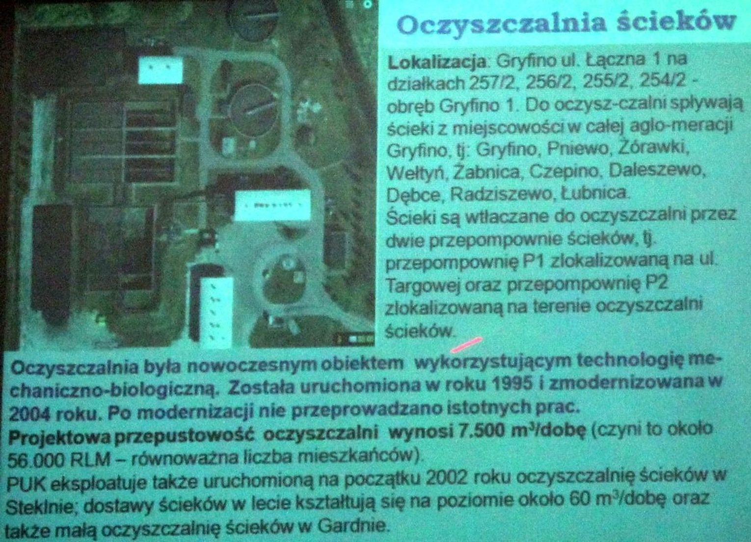 To jest jedna z dwóch oczyszczalni ścieków, które my eksploatujemy, ta oczyszczalnia ścieków w Gryfinie na ul. Łącznej. Ta oczyszczalnia była, bo już nie jest, nowoczesnym obiektem, wykorzystujących technologię mechaniczno-biologiczną, dość dobrą technologię, mamy oczywiście określone problemy ze względu na zrzuty przemysłowe, które na przykład potrafią nam niszczyć kolonie bakterii, dlatego, że te zrzuty jeżeli nie są przestrzegane normy, a nie są niestety, zawierają zbyt dużo substancji chemicznych, które po prostu zabijają te dobre bakterie i my musimy za własne pieniądze doprowadzać do kolejnej hodowli, znacznie częściej musimy wymieniać ten wsad bakteryjny niż tam jest. To jest właśnie ta część biologiczna, a część mechaniczna to taka jak zawsze.