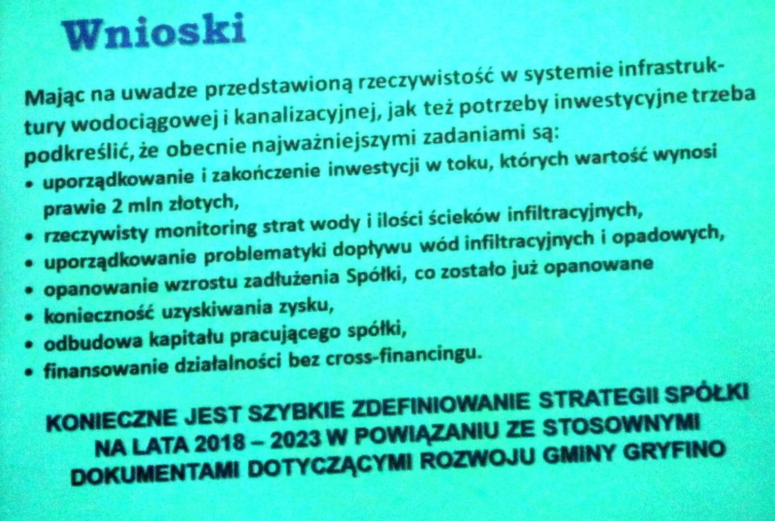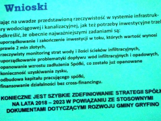 Chcemy prosić gminę o to, aby jak najszybciej zdefiniowano strategię rozwoju spółki na lata 2018-2023 i ta strategia spółki powinna zostać powiązana z dokumentami strategicznymi gminy, bo my przecież nie żyjemy dla siebie, tylko żyjemy dla tej gminy. To jest praktycznie wszystko co przygotowaliśmy. Tego i tak było bardzo dużo, bo jakbyśmy do tego dołożyli te pozostałe aktywności, to zmieścilibyśmy się w dwóch godzinach, ale myślę, że ja albo moi następcy przedstawią państwu za parę miesięcy, bo to też trzeba przebadać ogromną ilość dokumentów, ogromną ilość informacji przerobić, skojarzyć, złączyć, żeby można było dzisiaj państwu to przedstawić.