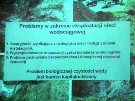 Jak wygląda nasz majątek wodociągowy? Wcale nie lepiej, ponieważ tutaj w dużej części jest to instalacja, PUK szedł w kierunku rozbudowy nowej instalacji i nie miał pieniędzy, bo pokrywał z amortyzacji pieniądze, które powinien reinwestować w starzejący się majątek. To są zdjęcia z awarii, których ostatnio nam przybywa i te awarie są dosyć kosztowne. Ostatnia awaria kosztowała nas 50.000 zł, bo trzeba było od wewnątrz uszczelnić rurociąg, nie wody i to kosztuje bardzo duże pieniądze, bo nie możemy naruszać powierzchni, trzeba wszystko zrobić od wewnątrz, to są technologie niekoniecznie tanie. Problemy w zakresie eksploatacji sieci wodociągowej to awaryjność, bo ta sieć jest bardzo rozległa, w dużej części wyeksploatowana instalacja, problem zachowania bezpieczeństwa i biologicznej czystości instalacji.