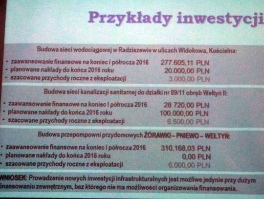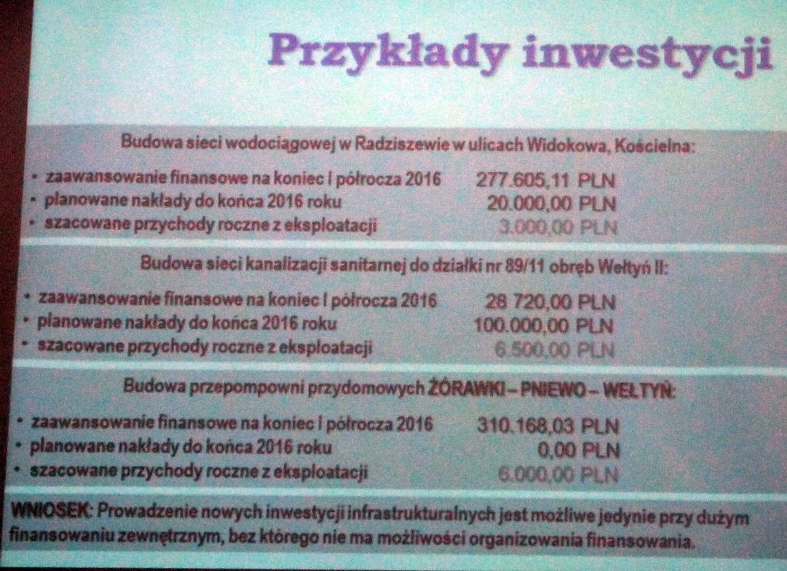 Więc też trzeba spojrzeć na firmę nie wyłącznie jako spółkę z o. o. która ma kreować jakieś wyjątkowe zyski, ale to jest firma, która ma również ten pierwiastek społeczny i to jest trudne połączyć wymagania kodeksu handlowego, czyli wymagania do kreowania zysku do prawidłowego zarządzania z tym czego żąda od nas społeczność lokalna. To jest naprawdę bardzo trudne. Tak naprawdę prowadzenie nowych inwestycji infrastrukturalnych możliwe jest jedynie przy dużym finansowaniu zewnętrznym bezzwrotnym, bez którego nie ma możliwości zorganizowania akceptowalnego społecznie rozwiązania finansowego. To są oczywiście tylko trzy inwestycje, wybrane, nie celowo, bo możemy pokazać jeszcze gorsze, np. nie pokazujemy tej, która przyłącza 0, natomiast musicie państwo zrozumieć, że my musimy takie inwestycje robić. Staramy się walczyć, ale nie zawsze możemy.
