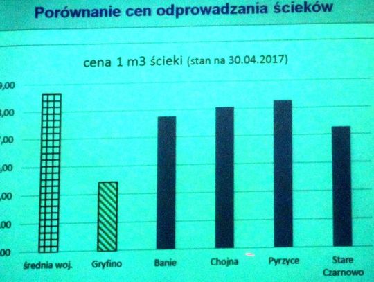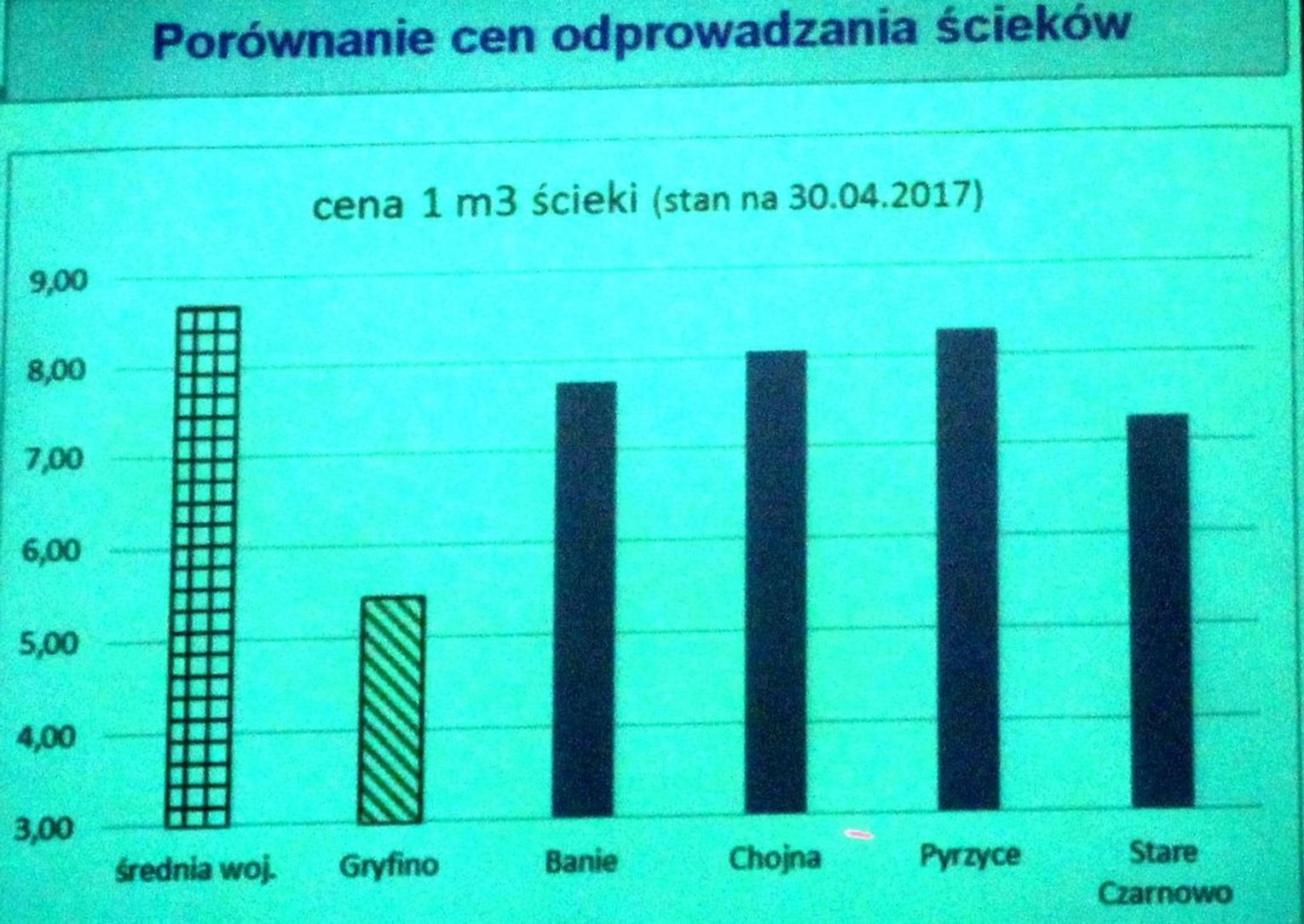 Jeśli chodzi o porównanie cen odprowadzania ścieków to wybrałem trochę inną formę, a mianowicie wolałem państwu pokazać to na tle kilku miejscowości, z którymi państwo macie kontakty, to jest Banie, Chojna, Pyrzyce, Stare Czarnowo. Gryfino ma jedną z najniższych taryf odprowadzania ścieków. To powoduje, że mamy pewne kłopoty, tylko musicie państwo pamiętać o jeszcze jednej rzeczy – istnieje zakaz cross-finansowania, czyli my nie możemy np. uzyskując przychody i zyski z innej działalności tych pieniędzy kierować na gospodarkę wodno-ściekową, bo jest to przestępstwo w rozumieniu ustawy karno-skarbowej, bo to będzie ręczne sterowanie wynikiem firmy. Nie wolno tego robić. Dzisiaj przedstawimy panu burmistrzowi sprawozdanie z badania sprawozdania finansowego dokonanego przez jedną z najlepszych firm, które sprawdzają tego typu rzeczy. To jest na szczęście firma szczecińska. Dotychczas poprzednio to były firmy z Warszawy albo z Poznania. Nigdy nie miałem przyjemności spotkania się z tymi firmami, natomiast tutaj firma siedzi, jest to jedna z najlepszych w tej chwili, wydaje mi się, firm w Polsce. Jej właścicielką jest przewodnicząca związku księgowych województwa zachodniopomorskiego, pani, która chętnie by tu przyszła, ale pewnie ze trzy godziny opowiadałaby o różnych rzeczach. Ja oczywiście krótko powiem, jakie tam są problemy, ale tylko w dwóch zdaniach. Jeśli chodzi o ceny wody, to mamy w sumie niskie, ale jeśli chodzi o odbiór ścieków, to naprawdę mamy wyjątkowo niskie.