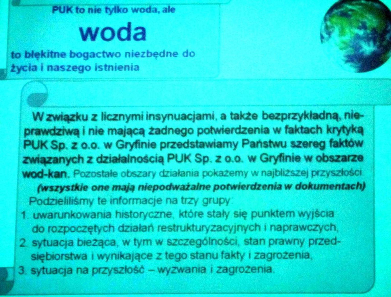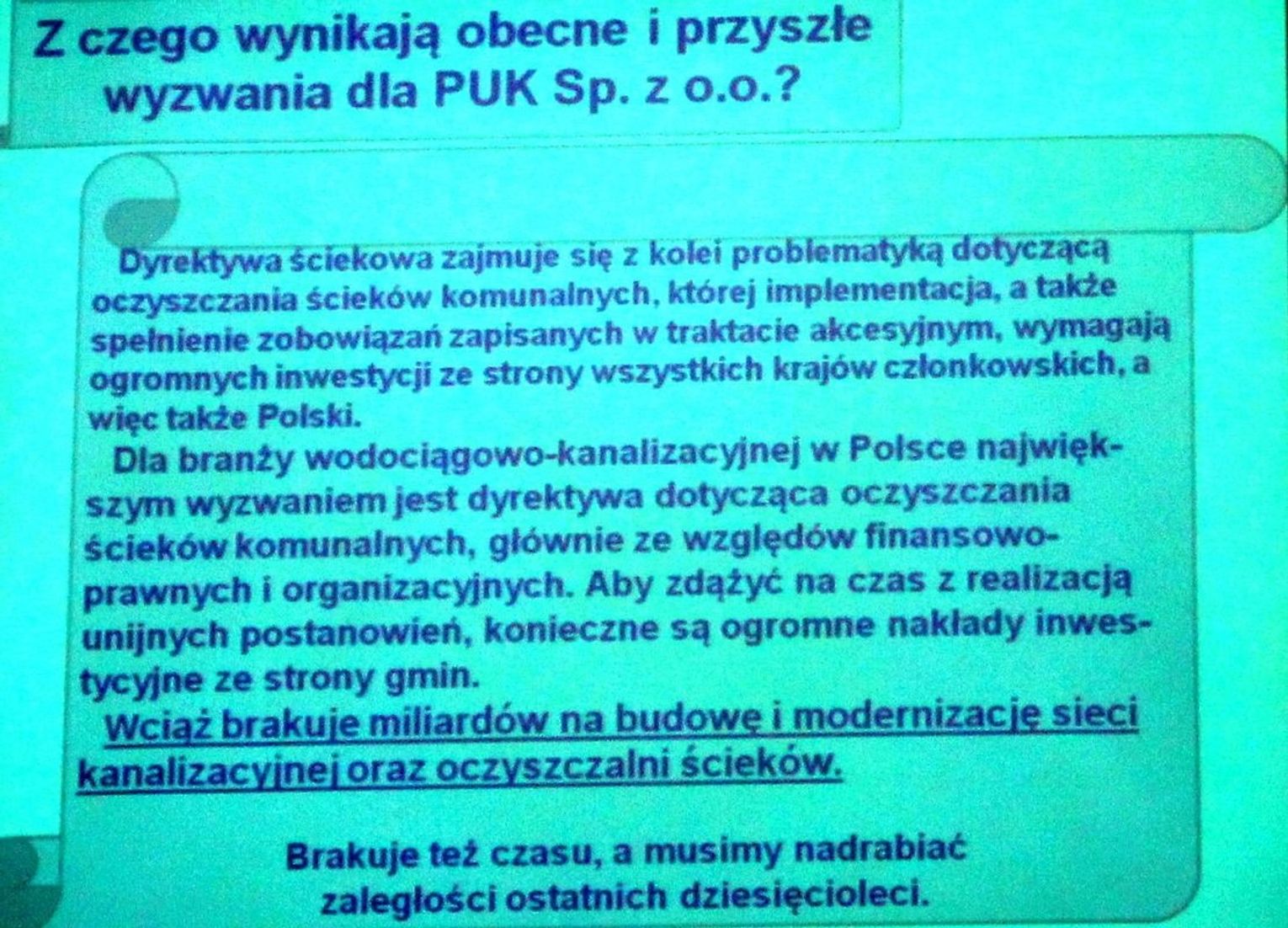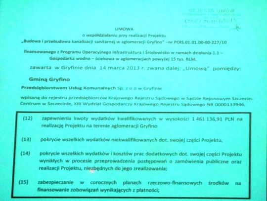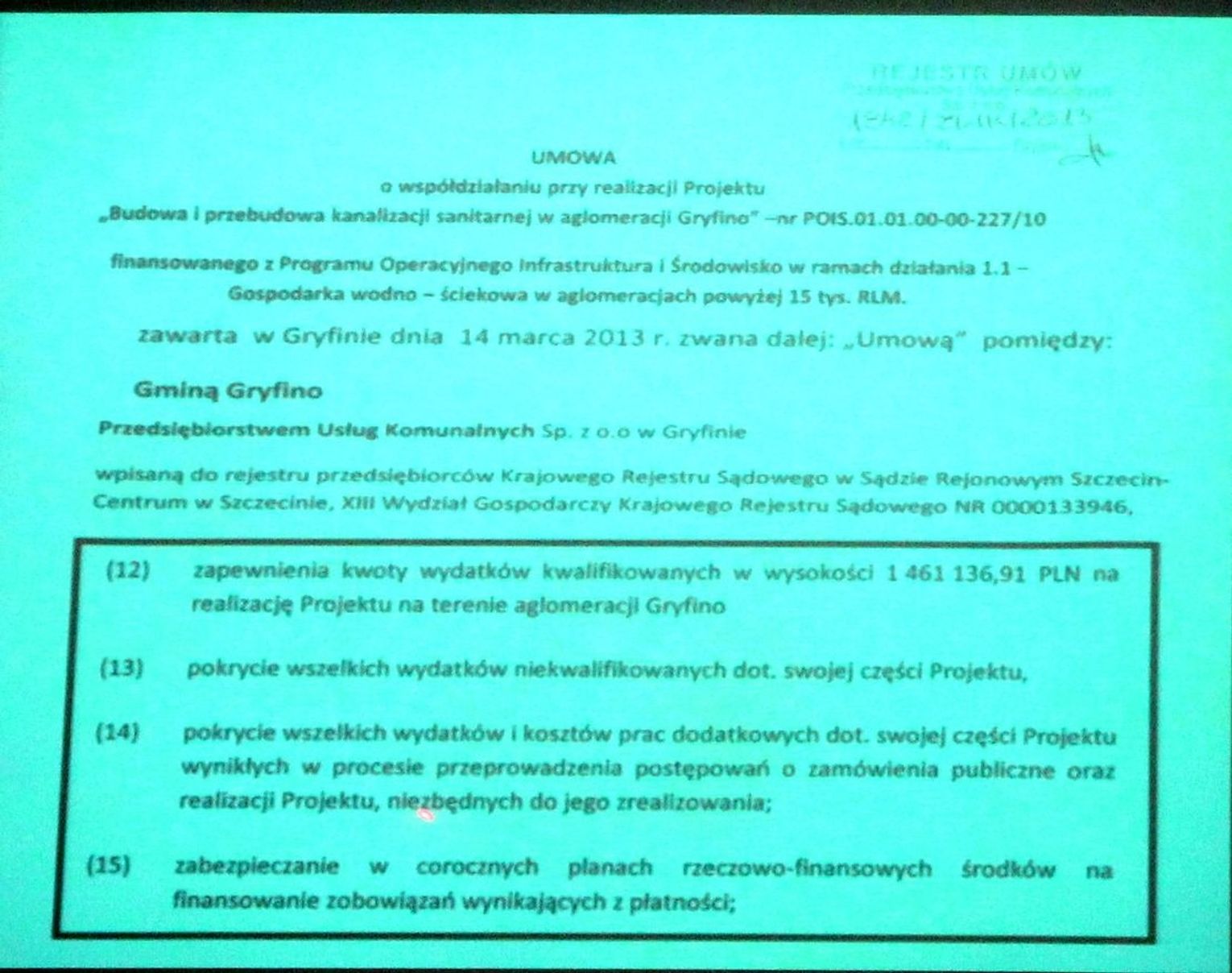 W 2013 roku (to jest oczywiście tylko fragment umowy o współdziałaniu przy realizacji projektu budowa i przebudowa kanalizacji sanitarnej w aglomeracji Gryfino – Program Operacyjny Infrastruktura i Środowisko z marca 2013 roku) gmina podejmuje decyzję o inwestycji budowy i przebudowy kanalizacji sanitarnej w aglomeracji Gryfino. Dzięki takiemu rozwojowi wypadków, że gmina Gryfino wchodzi formalnie w skład Związku Gmin Dorzecza Parsęty, dzięki temu następuje przekroczenie masy krytycznej projektu, projekt dostaje finansowanie i przystępujemy do ogromnej inwestycji budowy i przebudowy kanalizacji sanitarnej w aglomeracji Gryfino, projekt ponad 6 mln zł. To jest umowa, którą dysponujemy, ona ma 16 stron, jest znakomicie napisana prawnie, ale ja wybrałem tylko jeden fragment, który jest tutaj najistotniejszy w tej sprawie, mianowicie w ramach obowiązku PUK-u, PUK zapewniać ma: kwotę wydatków kwalifikowanych w wysokości prawie 1,5 mln zł na realizację projektu na terenie aglomeracji Gryfino. To jest kwota wynikająca z udziału własnego, ponieważ żadne pieniądze unijne w tym przypadku nie dają stu procent dofinansowania, ponieważ gmina w tym czasie jest po uszy zadłużona i nie może tych pieniędzy pozyskać, w związku z tym ceduje to na PUK. Nie tylko to ceduje na PUK. Ceduje na PUK również pokrycie wszelkich wydatków niekwalifikowanych dotyczących tej części projektu, którą zarządza PUK, pokrycie wszystkich wydatków i kosztów prac dodatkowych dotyczących swojej części projektu i wynikłych w procesie przeprowadzania postępowań, jak również zabezpieczenie w corocznych planach rzeczowo-finansowych środków na finansowanie. Ta inwestycja trwa do roku 2014, ona wymaga od PUKu zaangażowania ogromnych środków jak na tę firmę.