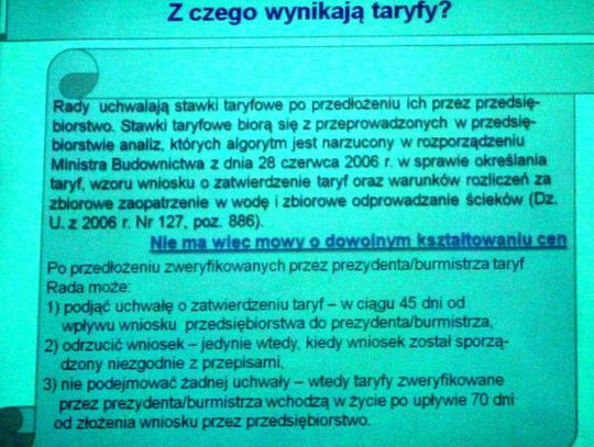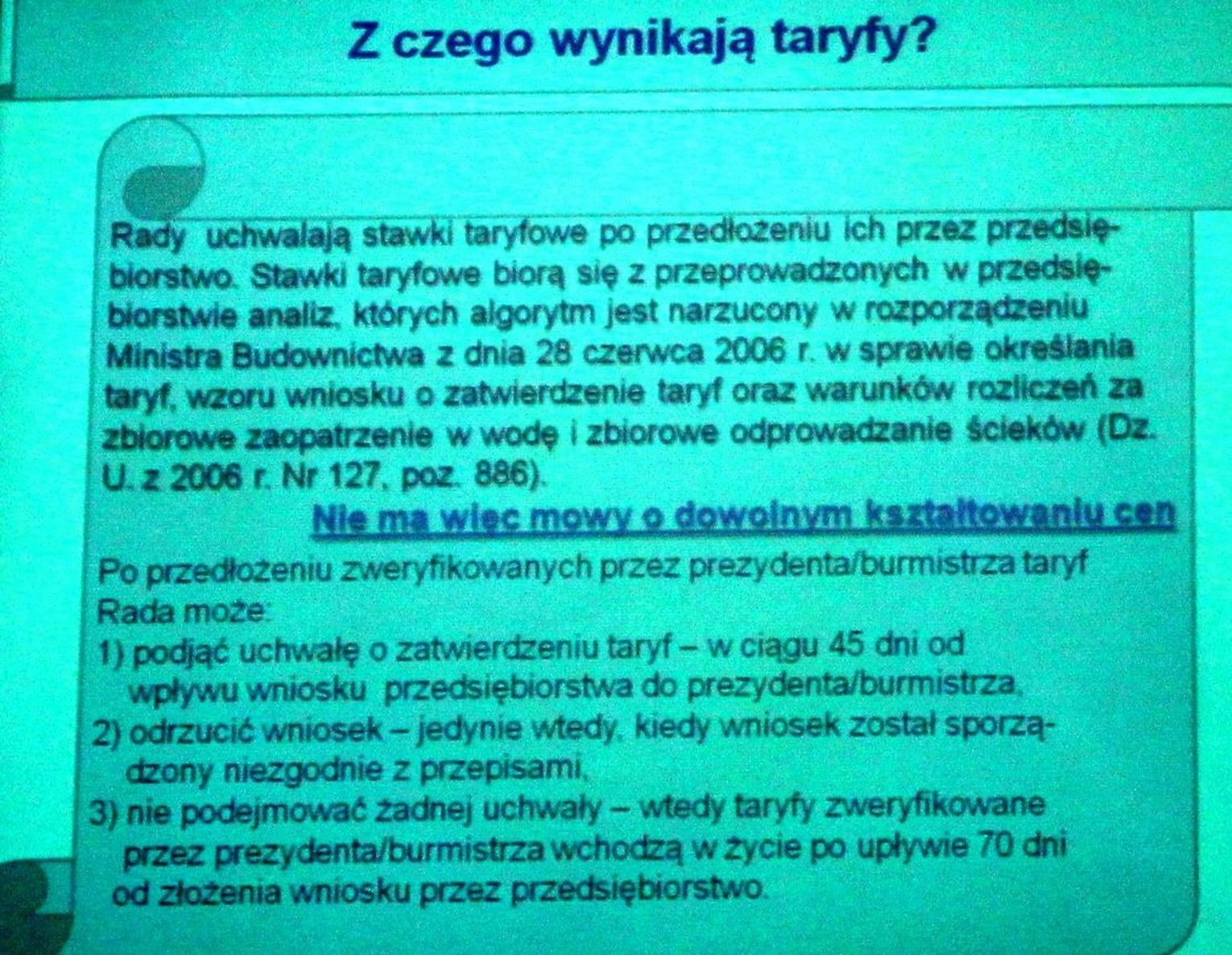 Rady uchwalają stawki taryfowe po przedłożeniu ich przez przedsiębiorstwo, stawki biorą się z przeprowadzonych w przedsiębiorstwie analiz, czyli stawki na rok następny są realizowane jako pochodna wyników z roku poprzedniego, czyli na prawdziwych danych. Nie ma żadnych wydumanych danych, tylko na prawdziwych danych. Algorytm, którym musimy się posługiwać jest narzucony w rozporządzeniu Ministra Budownictwa z dnia 28 czerwca 2006 r. w sprawie określania taryf, wzoru wniosku taryfowego, następnie ta taryfa trafia na biurko burmistrza, prezydenta miasta, który może ją weryfikować, potem przedkłada to radzie. Rada ma 45 dni na podjęcie uchwały o zatwierdzeniu taryf wodno-ściekowych na dostarczanie wody i odprowadzenie ścieków. Może odrzucić wniosek, ale tylko wtedy, kiedy wskaże, że wniosek został sporządzony niezgodnie z przepisami, może wreszcie nie podejmować żadnej akcji i wtedy taryfy weryfikowane przez prezydenta, czy burmistrza wchodzą w życie po upływie 70 dni od złożenia wniosku przez przedsiębiorstwo.