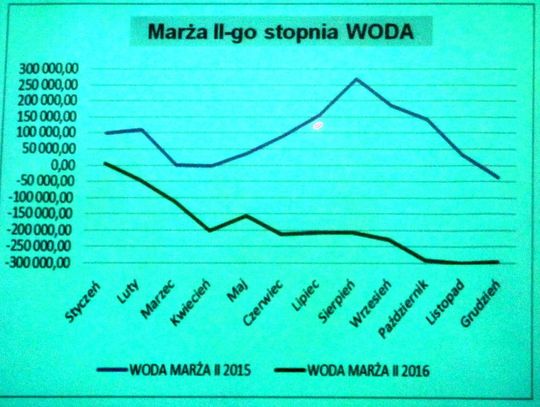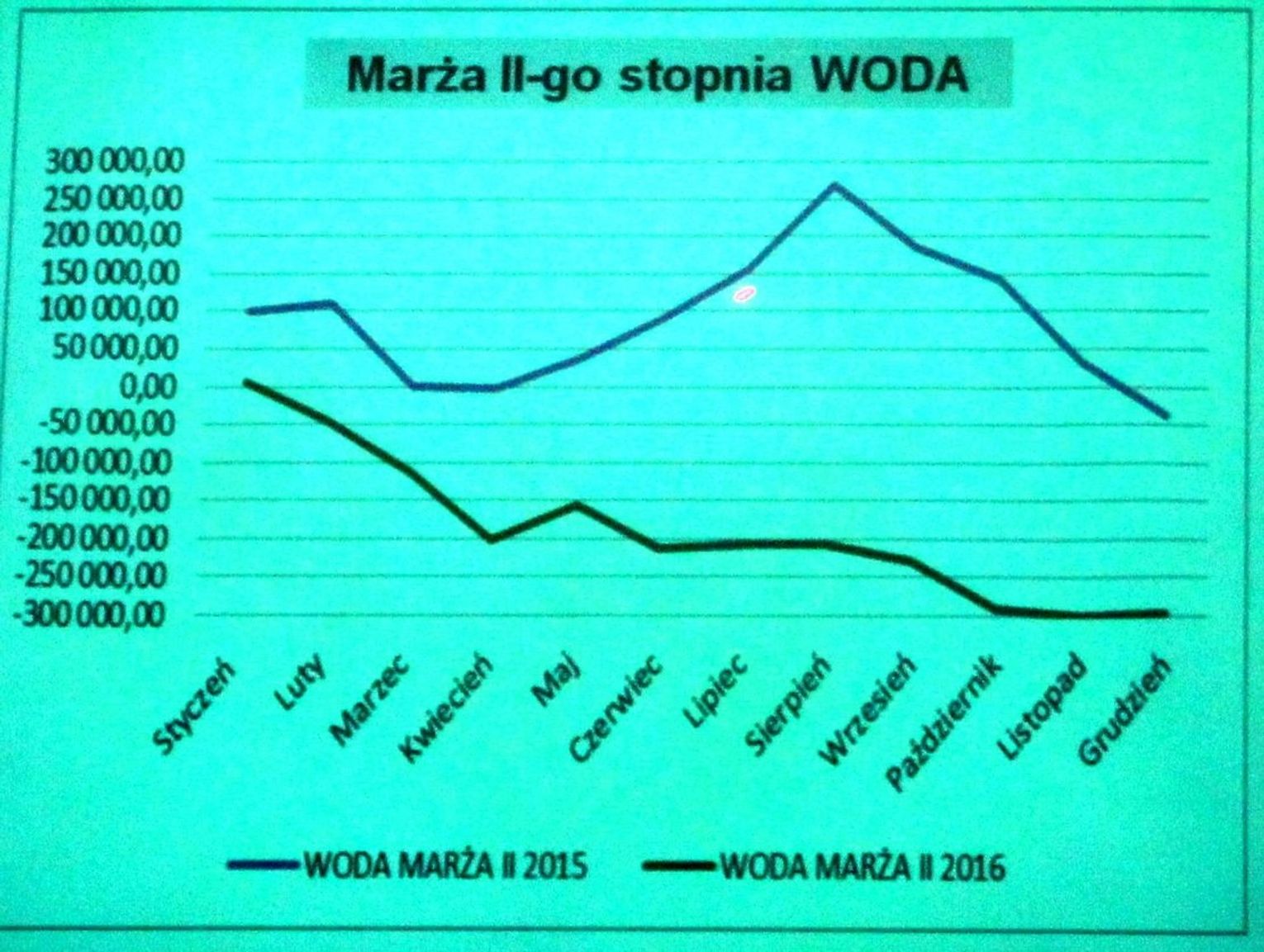 Chcę państwu pokazać opłacalność wody. Nie opłacalność ścieków, tylko opłacalność wody. Mówimy o marży drugiego rzędu. To jest tak naprawdę przychody ze sprzedaży wody minus koszty ich wytworzenia bezpośrednie minus koszty pośrednie. Na tym powinniśmy wychodzić mniej więcej na zero. Tak wygląda marża drugiego stopnia w roku 2015 to jest ta krzywa, w sierpniu jest pierwszy efekt zmniejszenia taryf wody na 2015 rok. My mamy taryfy od lipca do czerwca przyszłego roku. W lipcu została przygotowana taryfa, która zmniejszała stawkę taryfową dostawy wody i marża zeszła w dół, jest kontynuacja w roku następnym, mamy minus 200.000 zł w kwietniu, podnieśliśmy wtedy, bo nie było innego wyjścia, musieliśmy podnieść taryfę i w tej chwili pod koniec roku 2016 zahamowaliśmy dalszy spadek tej marży. Mamy nadzieję, że poza tą taryfa, którą zgłosiliśmy teraz nie będziemy musieli państwa denerwować. Mogą być jakieś wzrosty, choćby wynikające z inflacji, ale tutaj my ratujemy firmę. My nie mamy skąd wziąć pieniędzy. Skoro mamy taką sytuację, to musimy jej przeciwdziałać. Mamy następujące wnioski – zostało nam uporządkować i zakończyć inwestycje w toku, których wartość dzisiaj wynosi około 2 mln zł. Ona wynosiła 7.800.000 zł jeszcze rok temu i była związana oczywiście z tą ogromną inwestycją. Ona została zamknięta, ale jeszcze około 2 mln zł takich drobnych inwestycji, jak podłączenie dwóch, trzech domów. To wszystko chcemy skończyć, następnie chcielibyśmy uruchomić rzeczywisty monitoring strat wody.