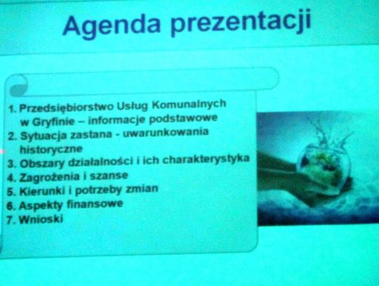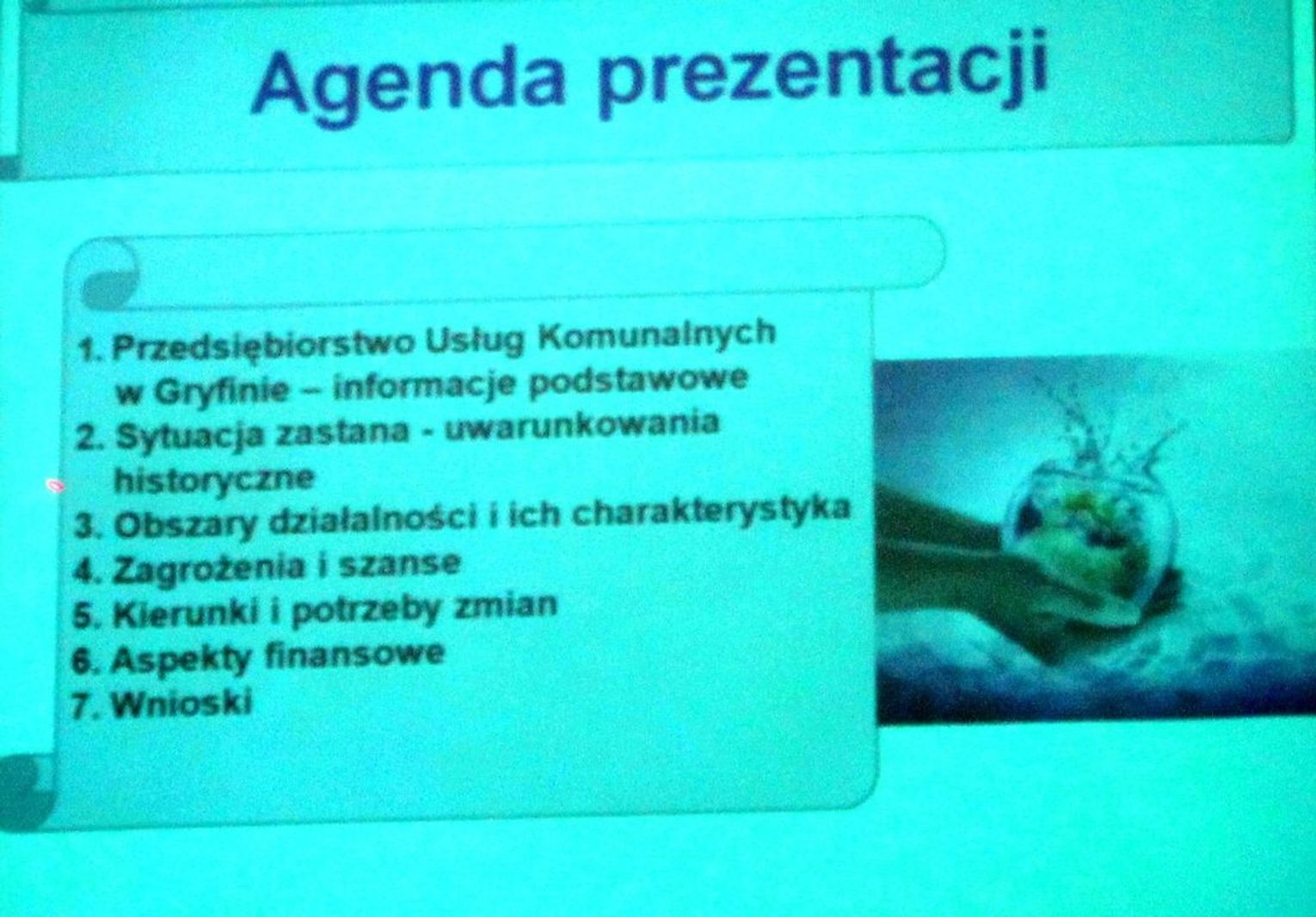 Przypomnę państwu motto Henry Forda – „Połączenie sił to początek, pozostanie razem to postęp, a wspólna praca to sukces”, dlatego bardzo byśmy chcieli, żeby od dzisiaj to była rzeczywiście wspólna praca. My nikogo nie prosimy o to, żeby pisał o nas dobrze, bo tak ma pisać. Niech tylko pisze prawdziwie, to zupełnie wystarcza. Taka jest agenda prezentacji: Przedsiębiorstwo Usług Komunalnych w Gryfinie, informacje podstawowe, sytuacja zastana, czyli uwarunkowania historyczne, w zasadzie uznaję, że w praktyce powiedziałem już o nich dostatecznie dużo, obszary działalności i charakterystyka, zagrożenia i szanse. Spółka jest dzisiaj w bardzo dobrej sytuacji finansowej, ale jest zagrożona i te zagrożenia pokażemy.