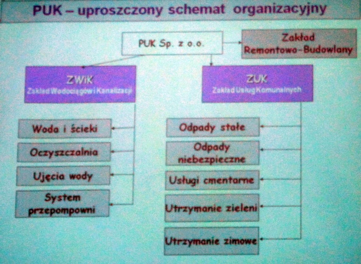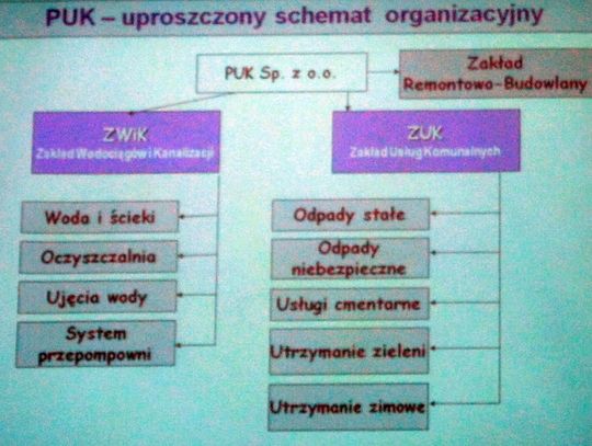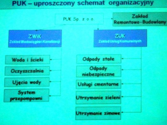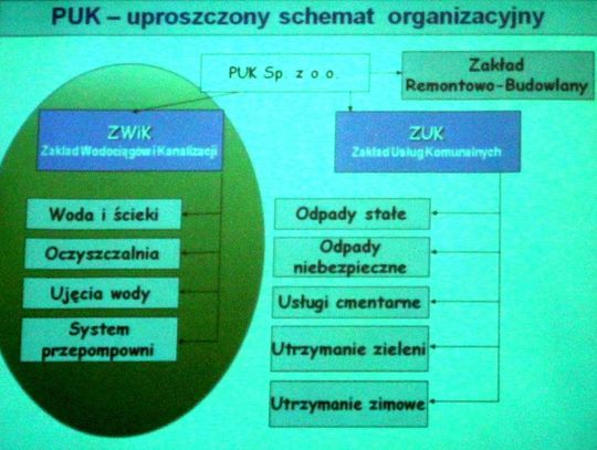 Tak ogólnie można powiedzieć, że mamy ZWiK, czyli Zakład Wodociągów i Kanalizacji oraz Zakład Usług Komunalnych, czyli ZUK, na boku jest zakład remontowo-budowlany, który uruchomiliśmy, bo jest potrzebny. Dzisiaj decydujemy się pokazać państwu ZWiK. Pozostała część, jeżeli będzie tylko taka potrzeba, ochota to jesteśmy w stanie, z tym, że przygotowanie takiej prezentacji trwa bardzo długo, bo trzeba naprawdę ogromnie dużo pracy, żeby można było państwu bez żadnych najmniejszych nawet wątpliwości przedstawiać wszystko co tu przedstawiamy.
