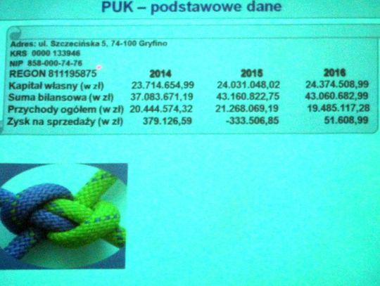 Oczywiście wszystkie jesteśmy w stanie spokojnie opanować, natomiast dzisiejsza sytuacja finansowa wbrew być może wielu wypowiedziom jest znakomita. Sprawdziłem to, wszystkie możliwe wskaźniki są w tej chwili na poziomie optymalnym i końcowe wnioski. Tak wygląda mniej więcej sytuacja PUK-u. W 2014 roku w kapitały własne są mniej więcej na równym poziomie około 24 mln zł, suma bilansowa rośnie ze względu na inwestycje, przychody – różnie to bywa, w 2016 roku za chwilę do tego wrócę, skąd się wzięło zmniejszenie przychodów, natomiast do 2014 roku wszystko było w porządku, w 2015 roku zawał jako efekt tejże inwestycji i 2016 rok już wracamy na normalne tory. Tu oczywiście powstaje bardzo istotne pytanie – pytanie o pozycję PUK-u jako spółki w gminie Gryfino i jej struktura gospodarcza. Są dwa modele, mówię oczywiście o spółce, która ma sto procent udziału gminy, jest model spółki, która jest spółką operacyjną, czyli która operuje na majątku gminy lub przekazanym majątku do tej spółki, czyli utrzymuje w miarę w porządku rurociągi, cmentarz i wszystkie inne rzeczy i jest to wtedy tylko i wyłącznie spółka operacyjna, ale również istnieje możliwość iżby to była spółka inwestycyjna również, czyli spółka, która operuje na majątku i która rozbudowuje ten majątek.
