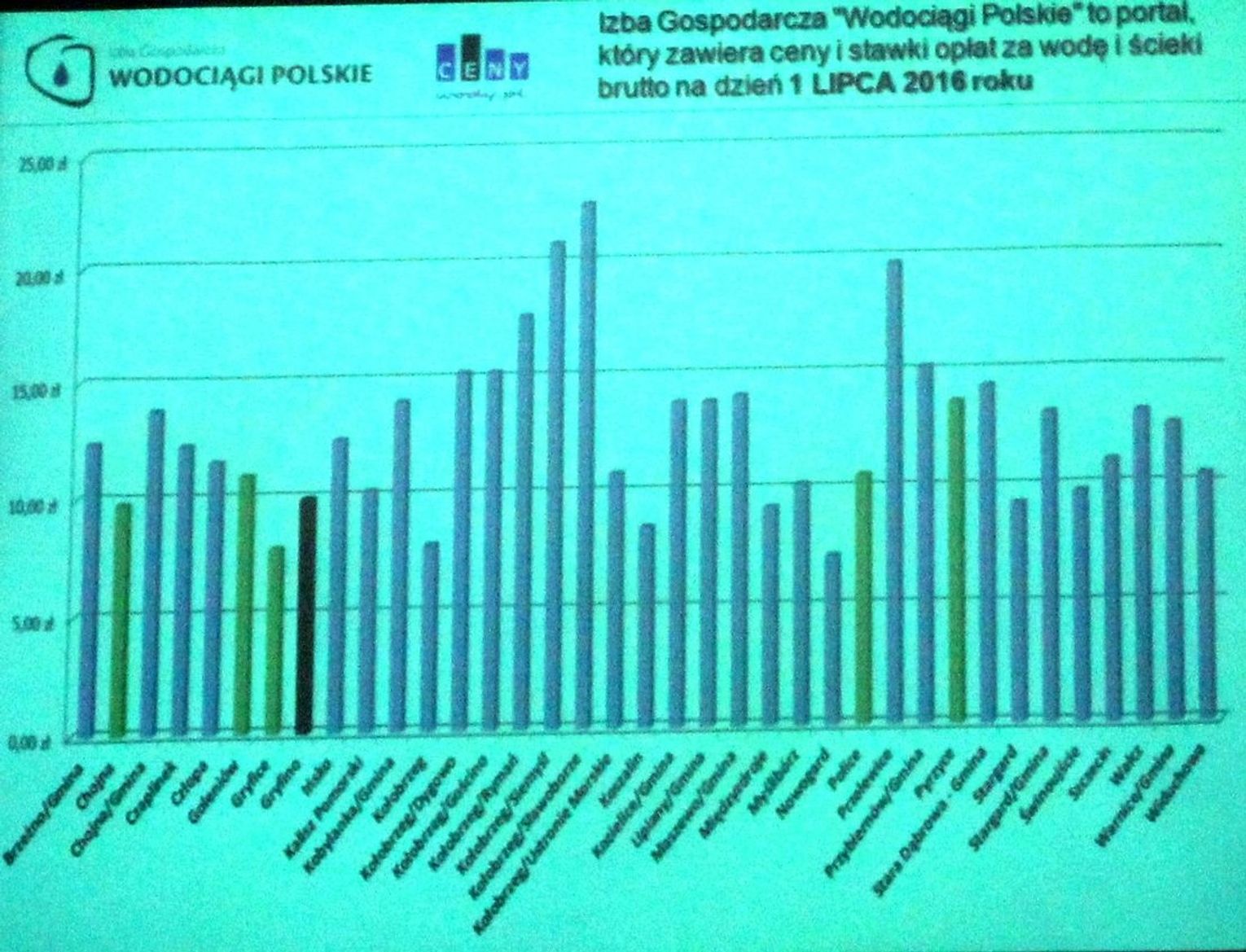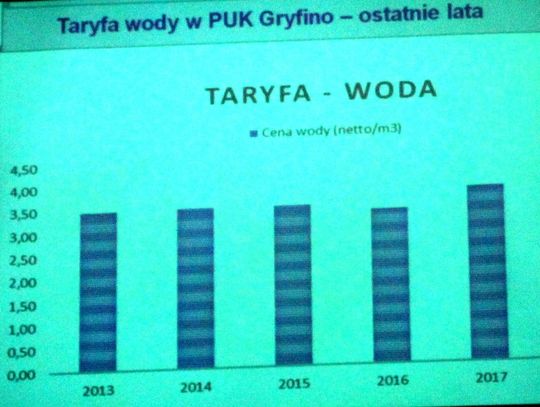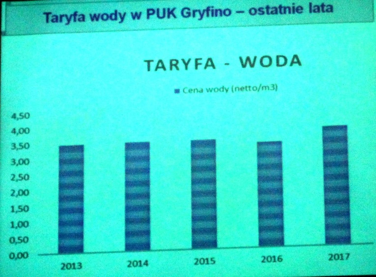 Gdzie znajdziecie państwo ceny wody? Www.cenywody.pl. To są ceny, które są w tej chwili dostępne, stan na 1 lipca 2016 roku w województwie zachodniopomorskim, Gryfino jest na czerwono, ceny są ułożone od najwyższych do najniższych, obok Gryfina jest Chojna, Świnoujście. Nasza taryfa brutto, która jest sumą opłat za odbiór ścieków i pobór wody plasuje nas w dolnej strefie stanów średnich. Nie ma zatem powodu, dla którego mianoby nam wytykać jakiś gwałtowny wzrost opłat. Tak wyglądają, dane, które możecie państwo oczywiście w każdej chwili zweryfikować, sprawdzić, tu nie ma żadnego problemu. Jak wyglądała taryfa wody netto od 2013 do 2017 roku? Zwracam tylko uwagę, że w 2014 roku spółka nie przygotowała wniosku taryfowego, natomiast przygotowała wniosek, zgodnie z prawem, o przedłużenie obowiązywania taryfy na pół roku. Co prawda złożyła go 18 grudnia, trochę późno, pytałem burmistrza Sawaryna, był wtedy drugi dzień w pracy, także na pewno miał pełny i dogłębny przegląd sytuacji, ale tak się stało. To jest zgodne z prawem, tu nie ma żadnych problemów, można prolongować to na rok, można na dwa lata, nie ma z tym żadnych problemów, ale jak państwo widzą nie jest tu nic przerażającego, od 2013 roku tak wyglądają ceny netto 1 m3 wody, do tego trzeba oczywiście dodać VAT. Jeżeli ktoś jest płatnikiem VAT-u, to ten VAT sobie oczywiście odbierze.