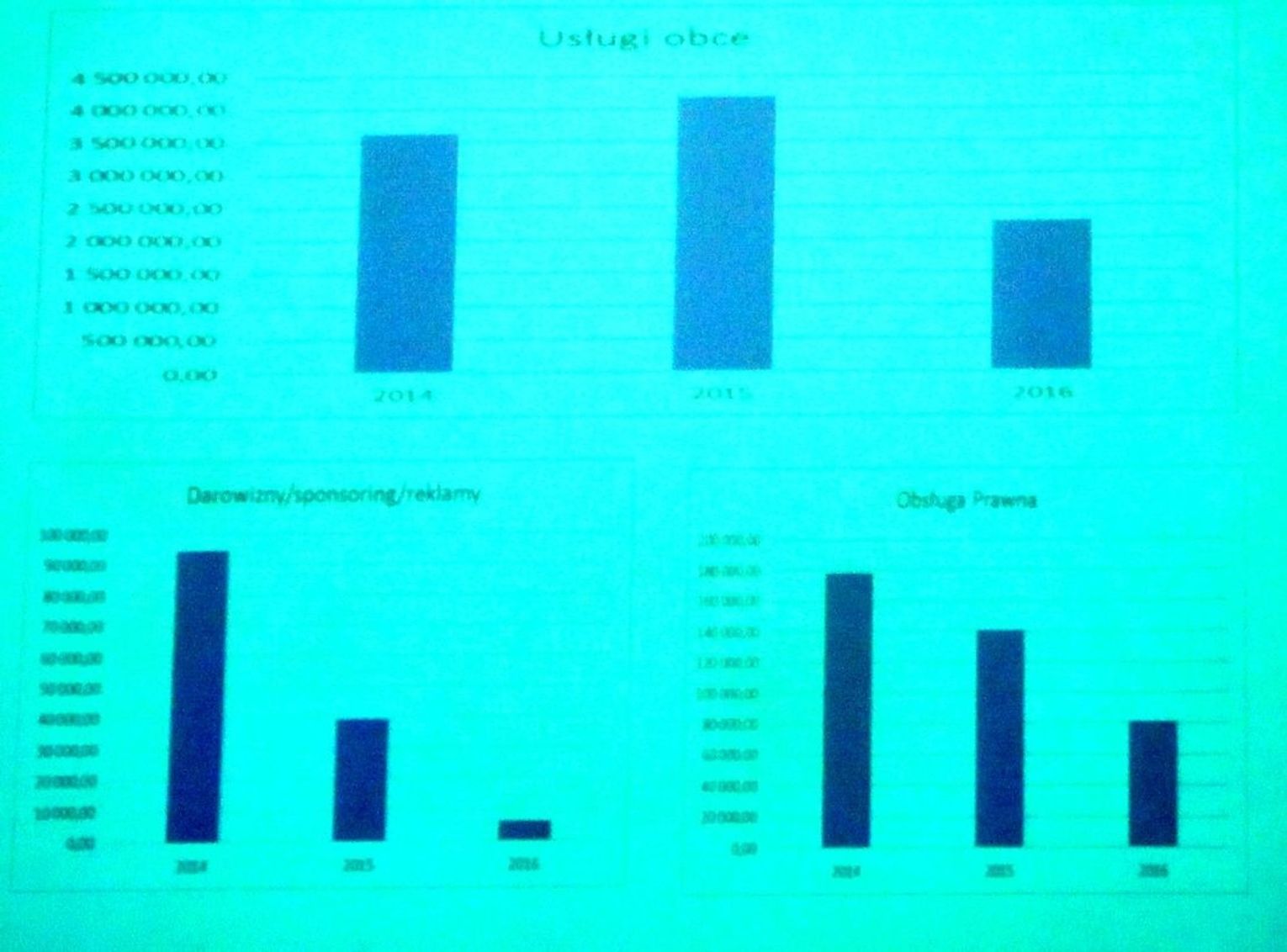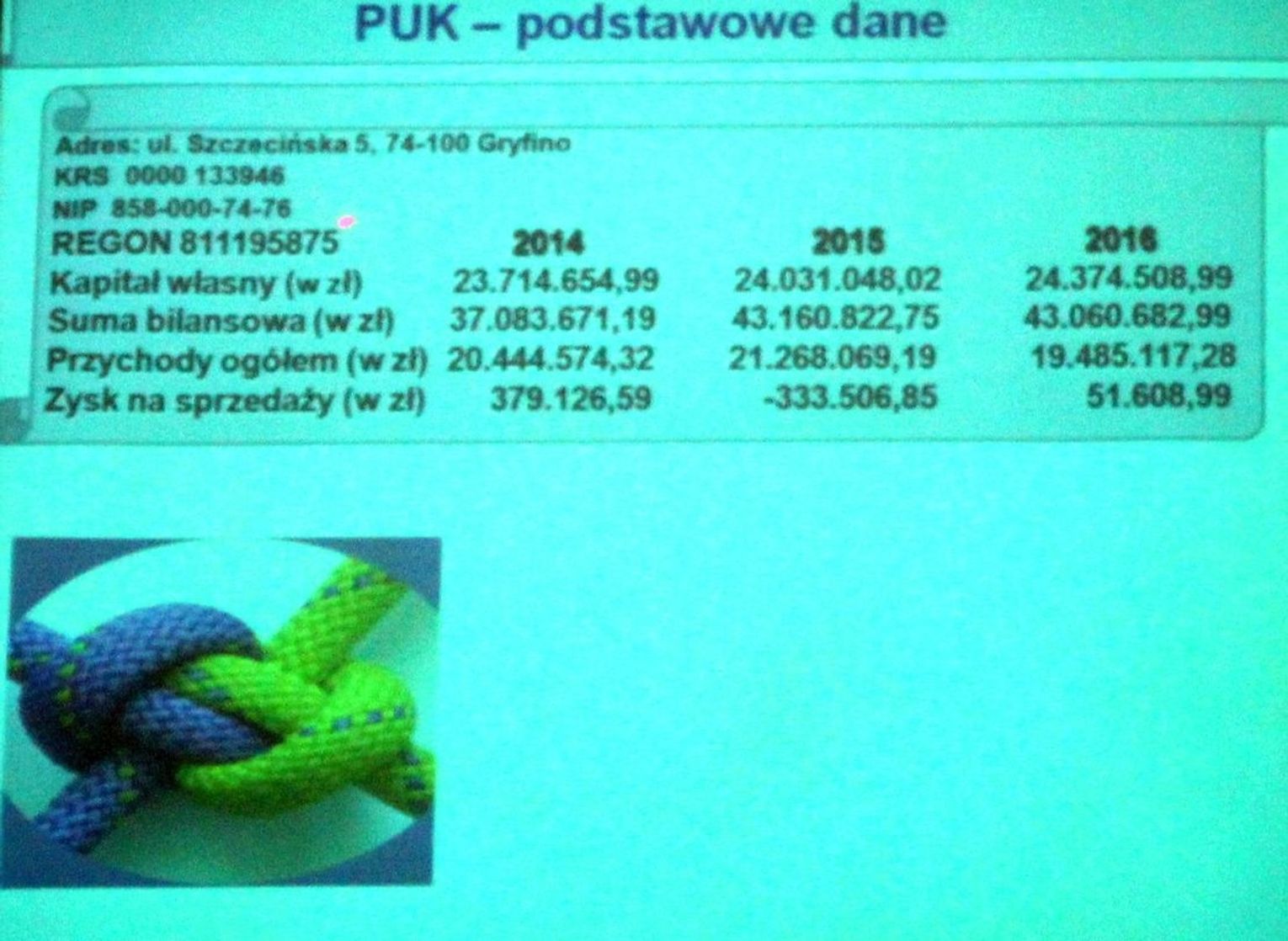 Ja jestem tylko skromnym specjalistą od finansów, ja się na polityce nie znam i nie zamierzam uczestniczyć w tym, ja mówię tylko i wyłącznie proste fakty. W tym momencie dla mnie osobiście jako finansisty to jest niezwykle trudne zadanie dla PUK-u i do roku 2014 ten PUK zupełnie dobrze chodził. Między rokiem 2014, a 2015 następuje rozliczenie, ten kontrakt rozpoczyna kłopoty w PUK-u i to kłopoty, które mogły, choć na szczęście nie zaowocowały problemami tej firmy, bo udało się tę firmę wyciągnąć. Usługi obce 2014, 2015, 2016 r. proszę zobaczyć jak je ograniczyliśmy. W 2015 roku były 4 mln zł, w 2016 roku nieco ponad 2,5 mln zł. Darowizny z około 100.000 zł to prawie nic, usługi prawne z ponad 100.000 zł, około 200.000 zł do 80.000 zł. To są podstawowe elementy, dzięki którym firma nie upadła. Następnie przeprowadziliśmy restrukturyzację zadłużenia, dzięki temu obniżyliśmy koszty tego zadłużenia i niestety przeciwstawiliśmy się gminie, bo gmina nas namawiała do kolejnych inwestycji i powiedzieliśmy jasno, że na razie nie mamy szans, ponieważ musimy się „wykaraskać” z tego co mamy i od tego miejsca proponuję, żebyśmy przeszli do miłych, sympatycznych i przyjemnych spraw. Otóż ten tytuł, który pozwoliłem sobie przygotować wspólnie z panem prezesem Stypą, kosztowało nas to mnóstwo czasu, bo musieliśmy wszystko zrozumieć, wszystko to, co państwu przedstawimy ma absolutnie i jednoznacznie pokrycie we wszystkich dokumentach. Wszystkimi tymi dokumentami dysponujemy i w każdej chwili jesteśmy w stanie je udostępnić, ale również wykorzystać w swoich celach.