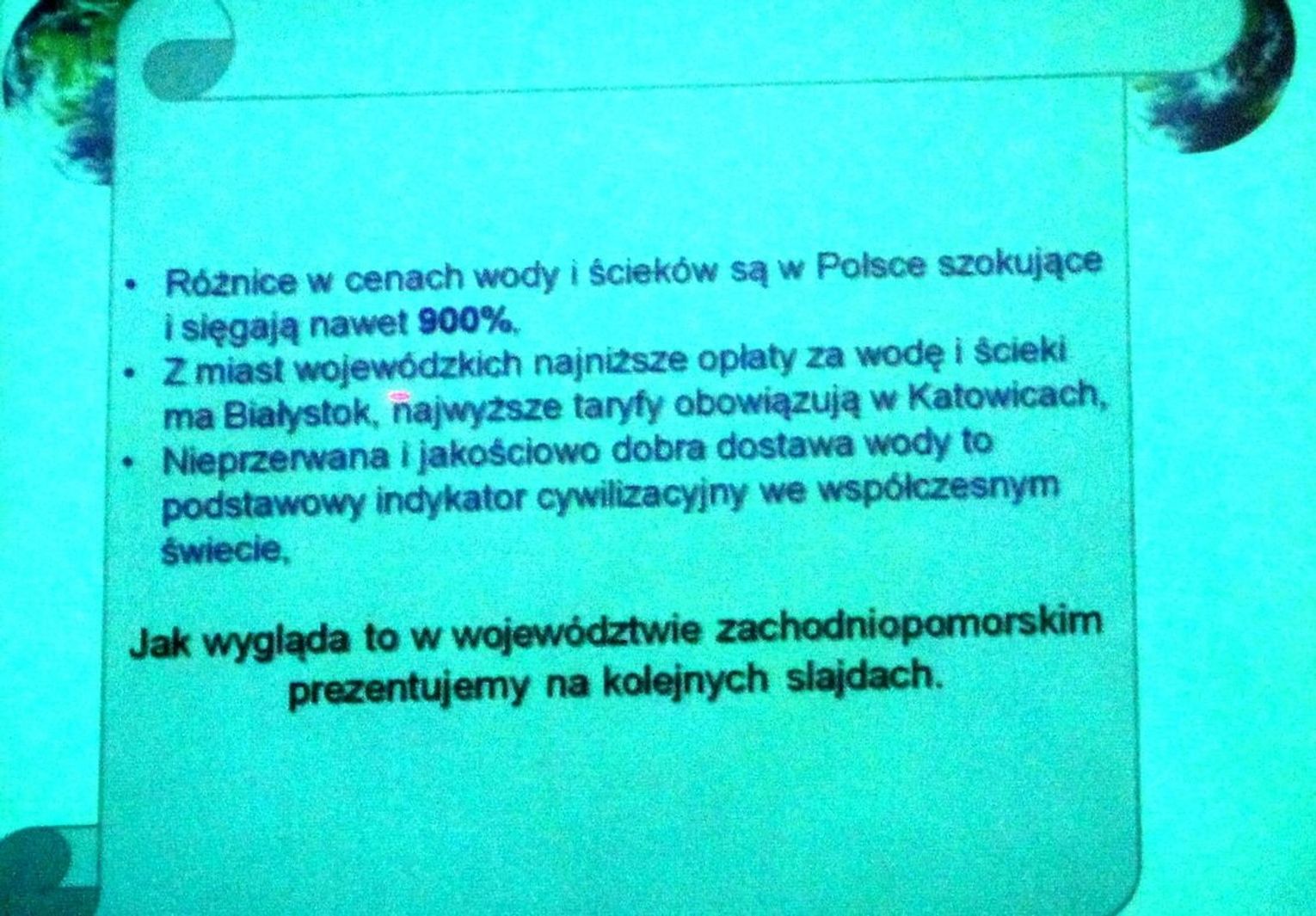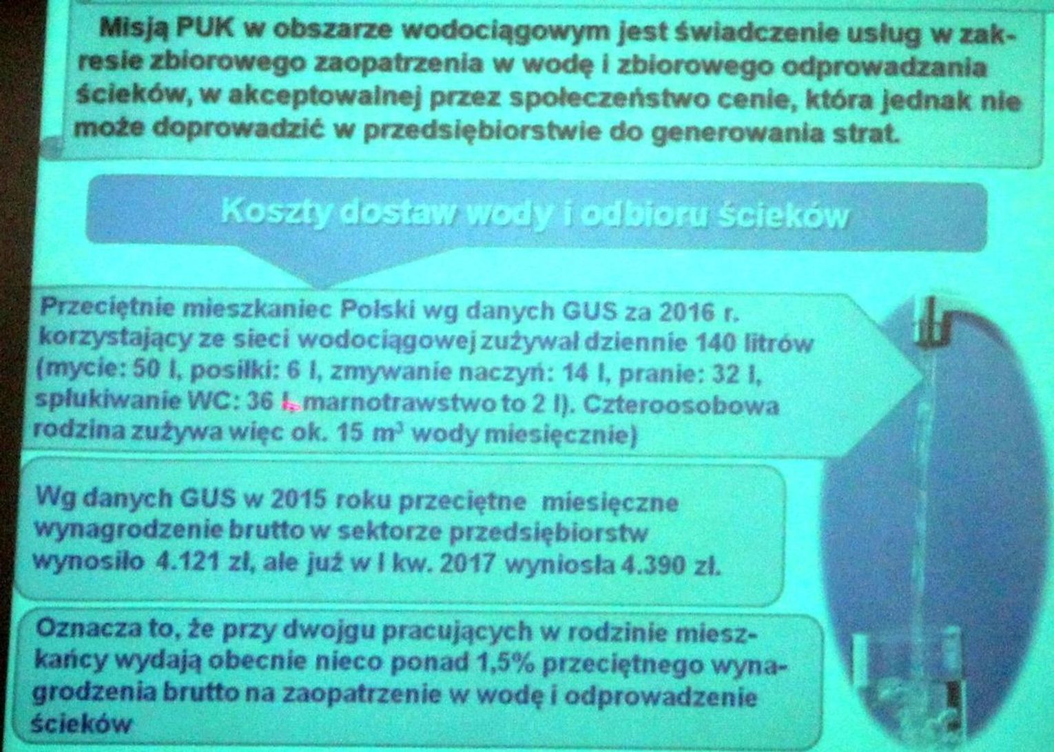 Sprawdziłem, za pierwszy kwartał 2017 roku średnia pensja w Polsce wynosiła 4.390 zł brutto, popatrzyłem ile wynosi średnia opłata dla naszego abonenta i zakładając, że w Gryfinie jest bardzo małe bezrobocie, czyli założyłem, że dwie osoby w rodzinie pracują na poziomie tej średniej, to opłata, którą dzisiaj mamy wynosi około 1,5% przeciętnego wynagrodzenia brutto za zaopatrzenie wody i odprowadzenie ścieków. Unia Europejska traktuje próg 3,5% jako społecznie akceptowalny, powyżej jako nieakceptowany. Z czego wynikają taryfy? Po pierwsze chciałem powiedzieć, że nie może być mowy o dowolnym kształtowaniu cen. Za moment powiem państwu również jakie przysługują państwu prawa jako radnym.