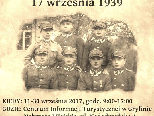 Gmina Gryfino i Ośrodek Sportu i Rekreacji w Gryfinie zapraszają od poniedziałku 11 września 2017 do małej galerii Centrum Informacji Turystycznej w Gryfinie na Nabrzeżu Miejskim na wystawę zatytułowaną "Agresja sowiecka na Polskę 17 września 1939". Na ekspozycji pokazane zostaną mundury (m.in. polowy żołnierza piechoty, garnizonowy kawalerii 12 Pułku Ułanów Podolskich), broń (m.in. karabin Mauser, karabin przeciwpancerny UR, CKM Maxim OPL), podstawowe wyposażenie żołnierza (m.in. oryginalne tytoń i papierosy z 1939, żyletki, zapałki, znaczki pocztowe, maszynka do ostrzenia żyletek).