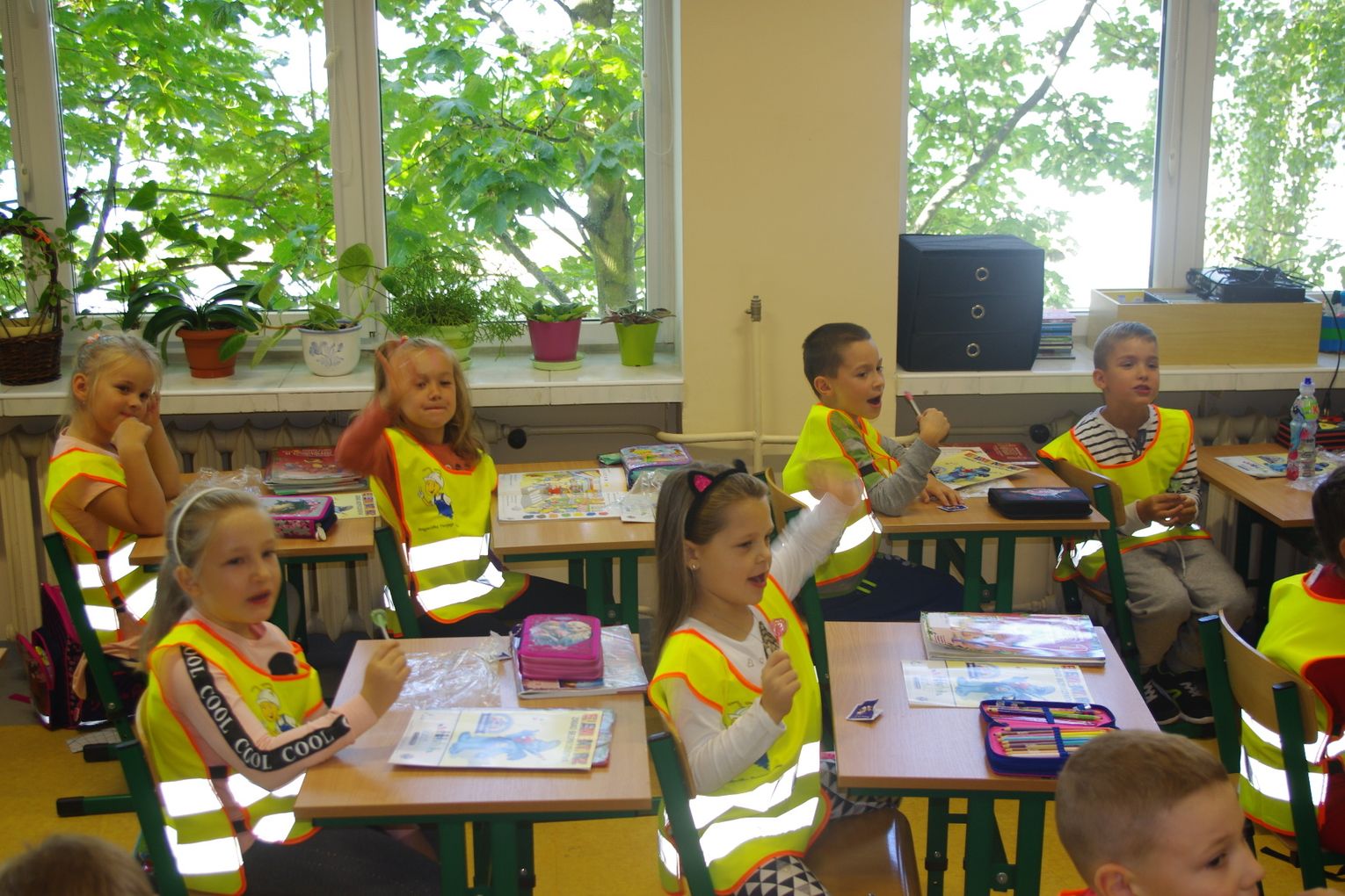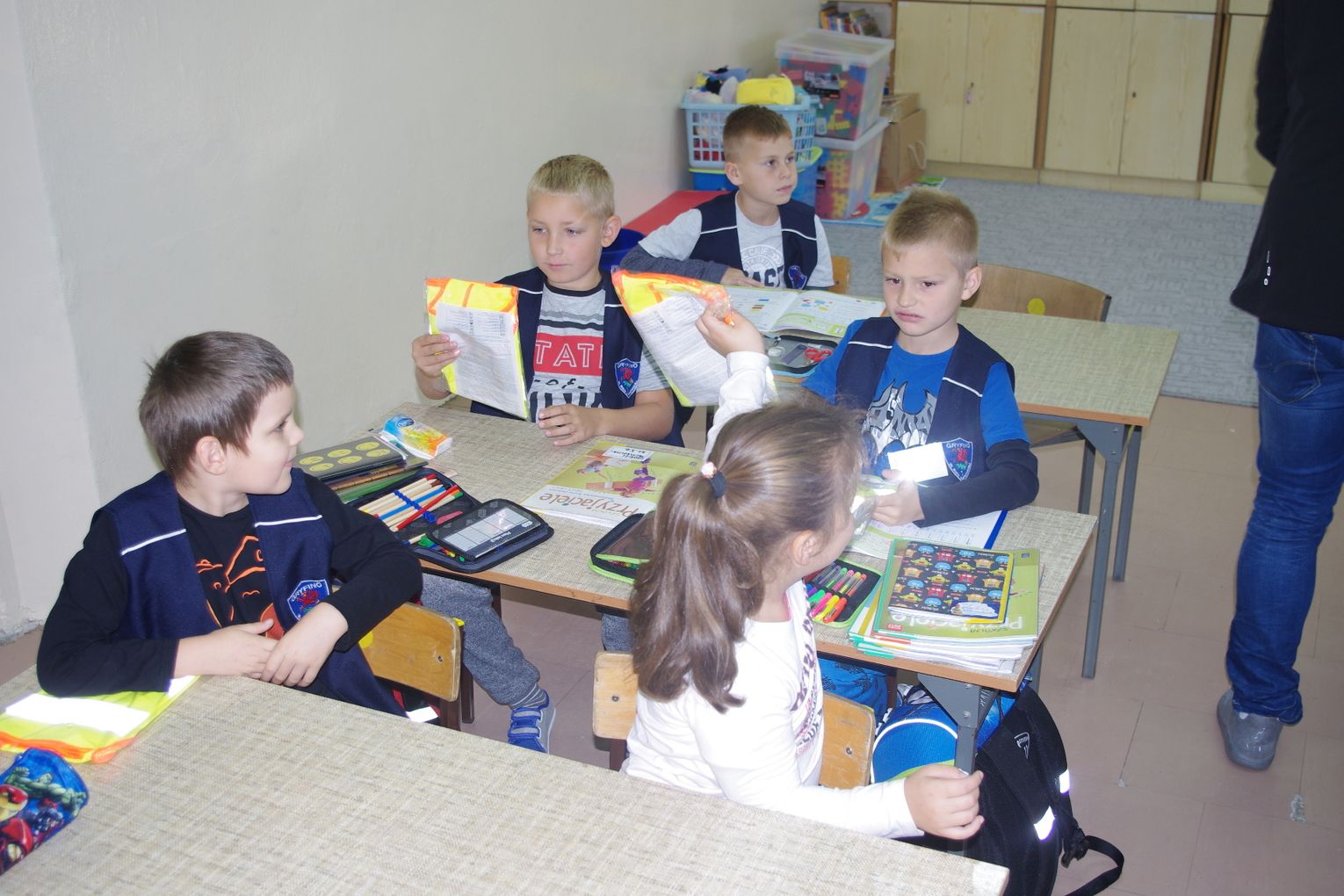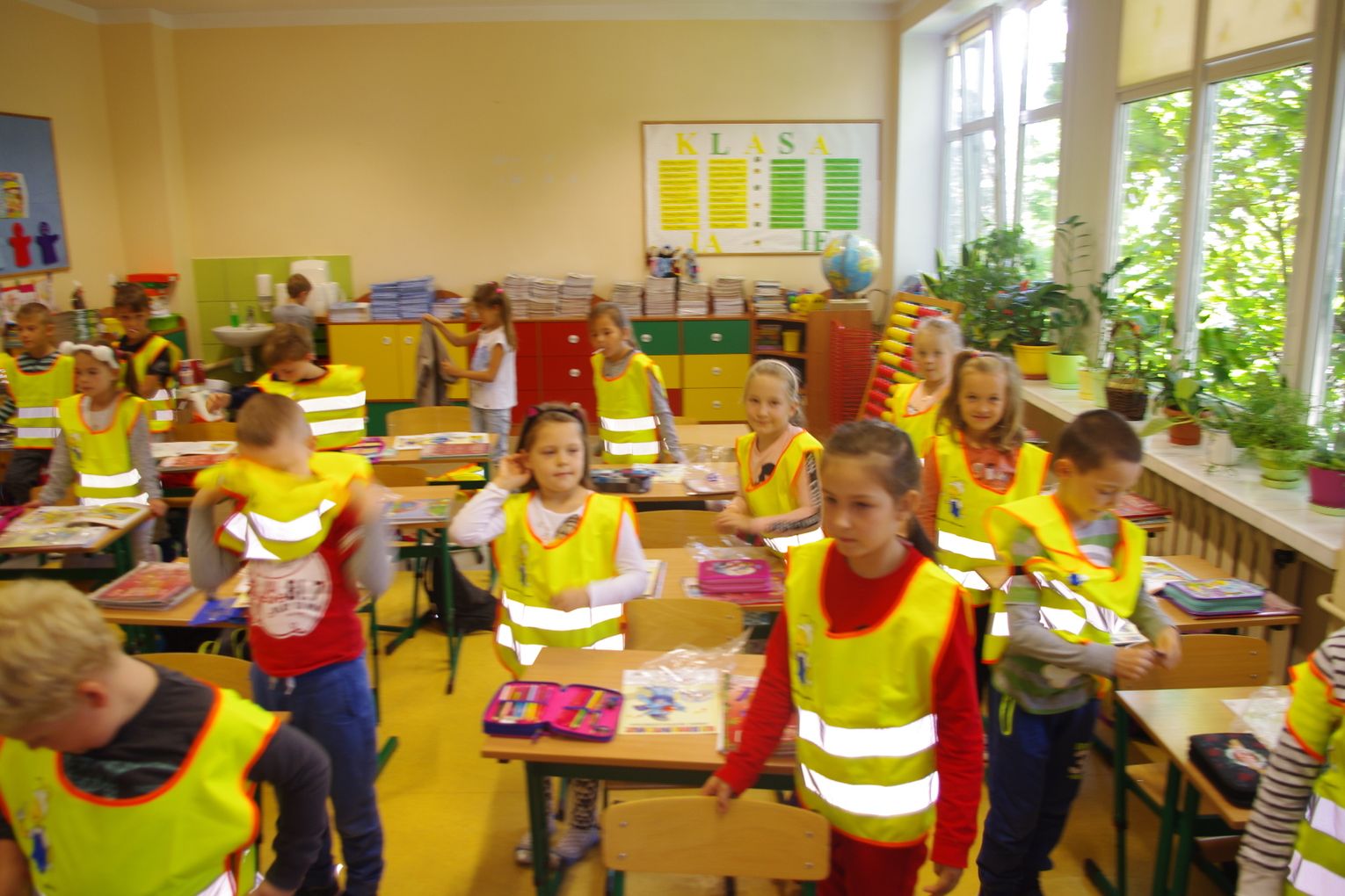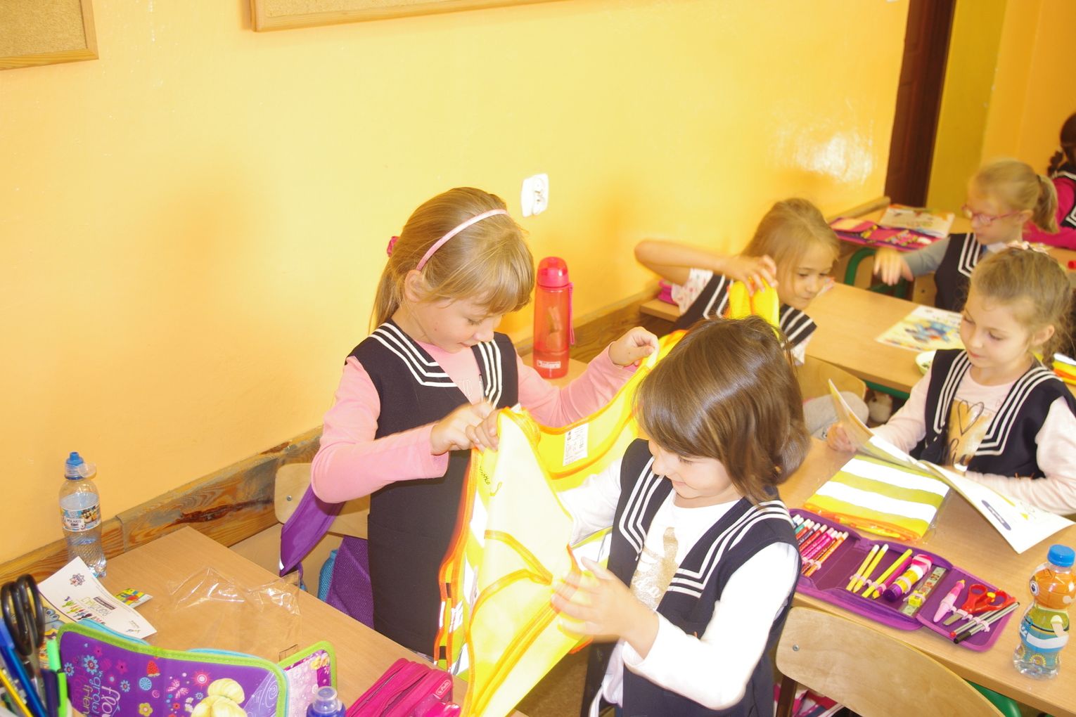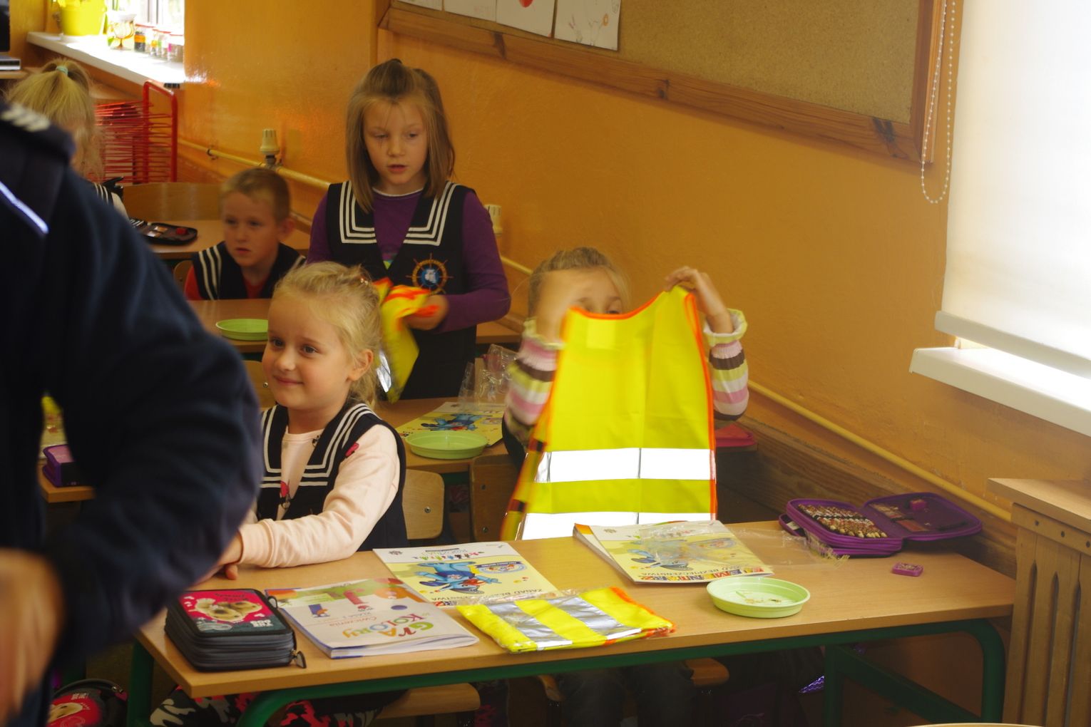 Dzięki wsparciu i zaangażowaniu jednego z lokalnych przedsiębiorców w tym roku każdy uczeń otrzymał również kamizelkę odblaskową, dzięki której będzie bardziej widoczny w drodze do szkoły i nie tylko, szczególnie podczas zbliżającego się okresu jesienno – zimowego, kiedy wcześniej zapada zmrok.