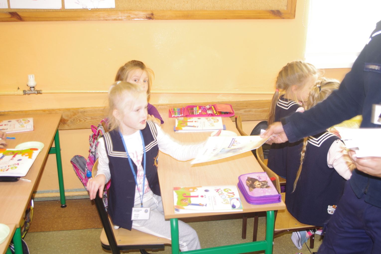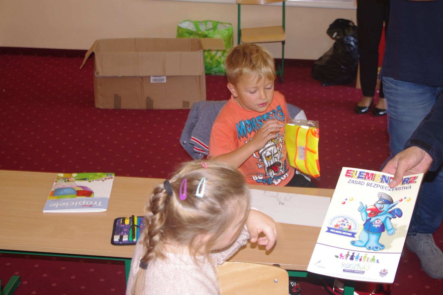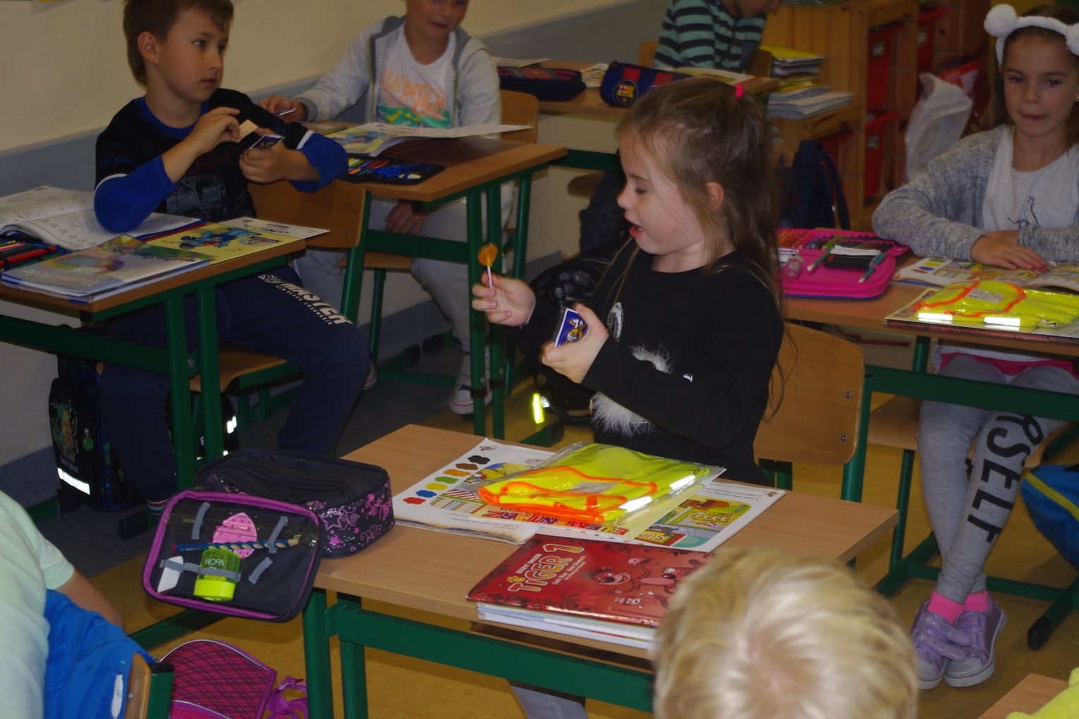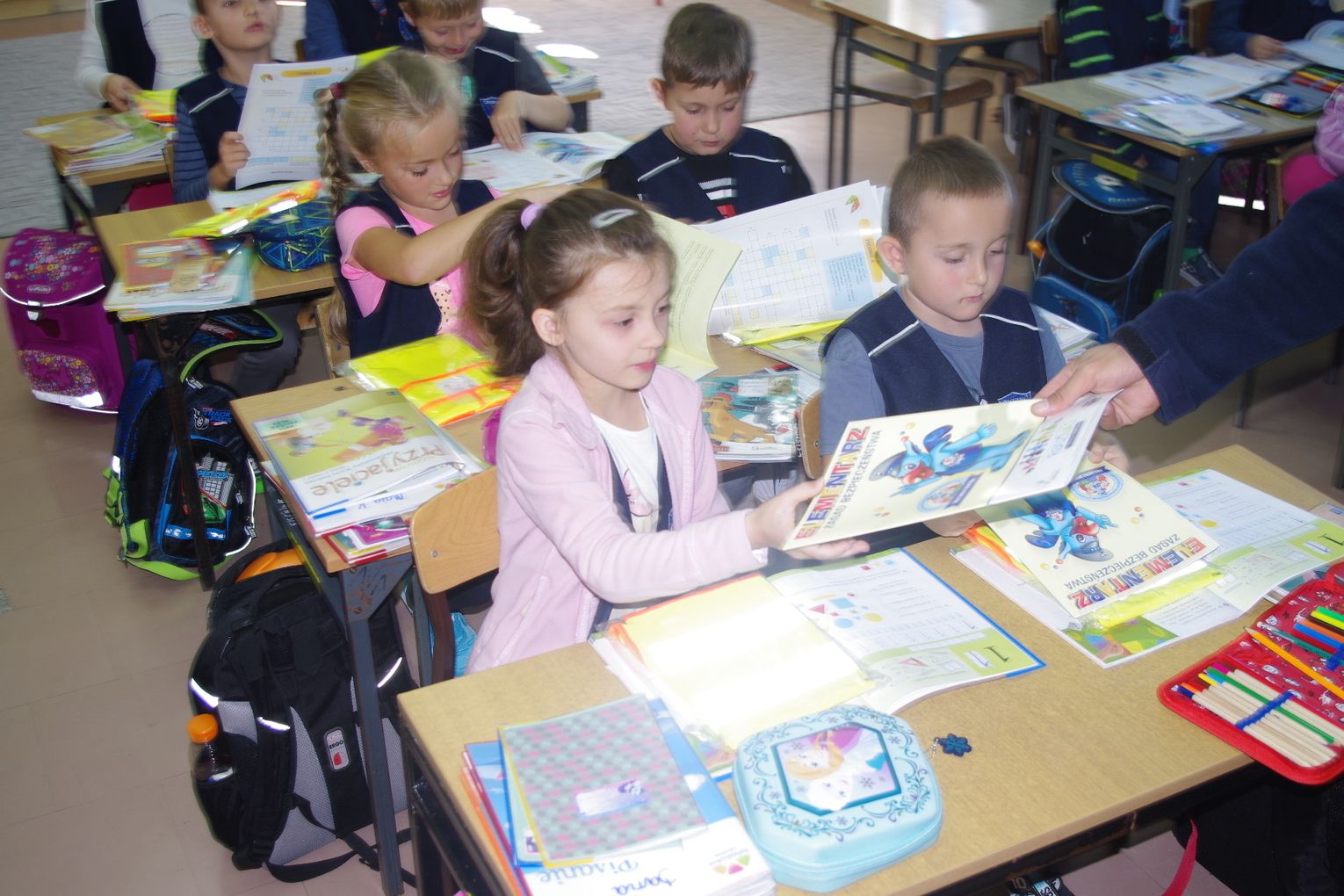 Dzięki wsparciu i zaangażowaniu jednego z lokalnych przedsiębiorców w tym roku każdy uczeń otrzymał również kamizelkę odblaskową, dzięki której będzie bardziej widoczny w drodze do szkoły i nie tylko, szczególnie podczas zbliżającego się okresu jesienno – zimowego, kiedy wcześniej zapada zmrok.