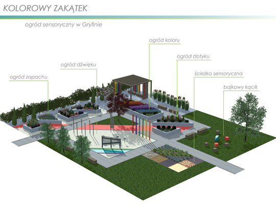 · ogród dźwięku – główną atrakcją miałby być plac z instalacją muzyczną - instrumentami zewnętrznymi tj. bębenki czy cymbałki. Dodatkowym wzmocnieniem walorów akustycznych ogrodu będzie wprowadzenie rabat z szumiącymi trawami, chrzęst żwiru pod stopami czy szum wiatru wśród koron drzew. Nie sposób również pominąć odgłosów ptaków, które dzięki otoczeniu drzew chętniej będą przebywać na danym terenie.