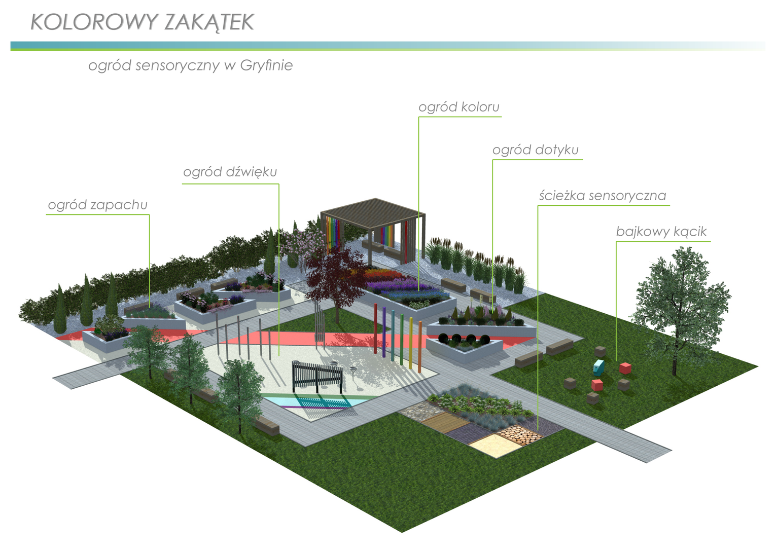 · ogród zapachu – z podwyższonymi rabatami wypełnionymi kwiatami, bylinami i krzewami uwalniającymi olejki eteryczne. Aby zintensyfikować zapach planuje się stworzenie przesłony od wiatru w postaci żywopłotu np. z ligustru.