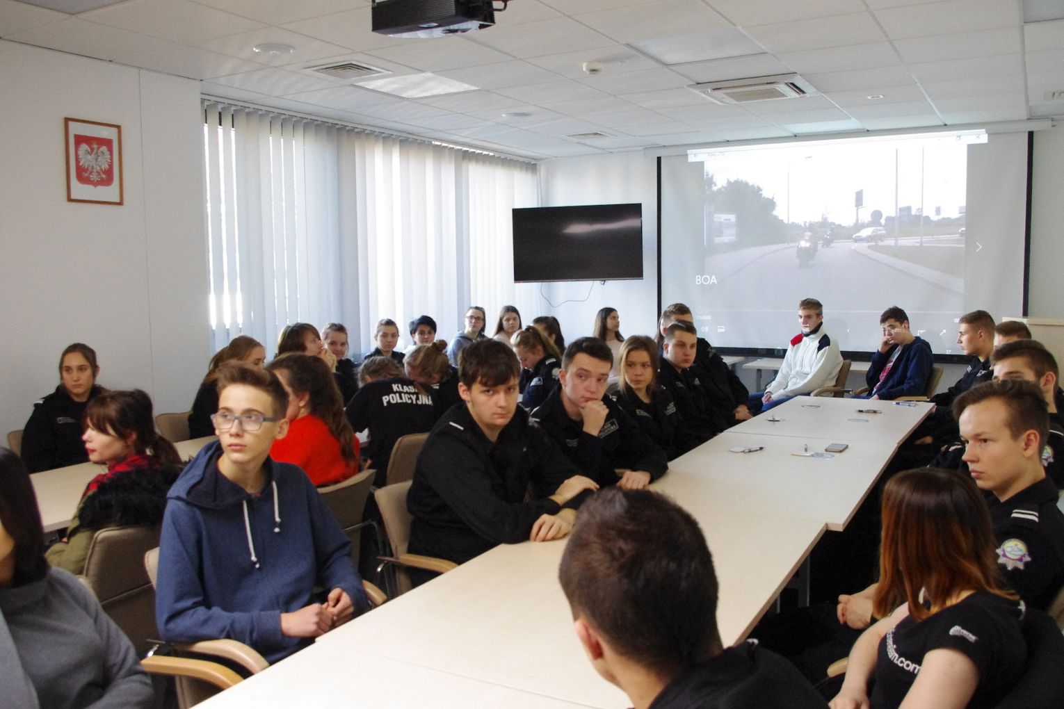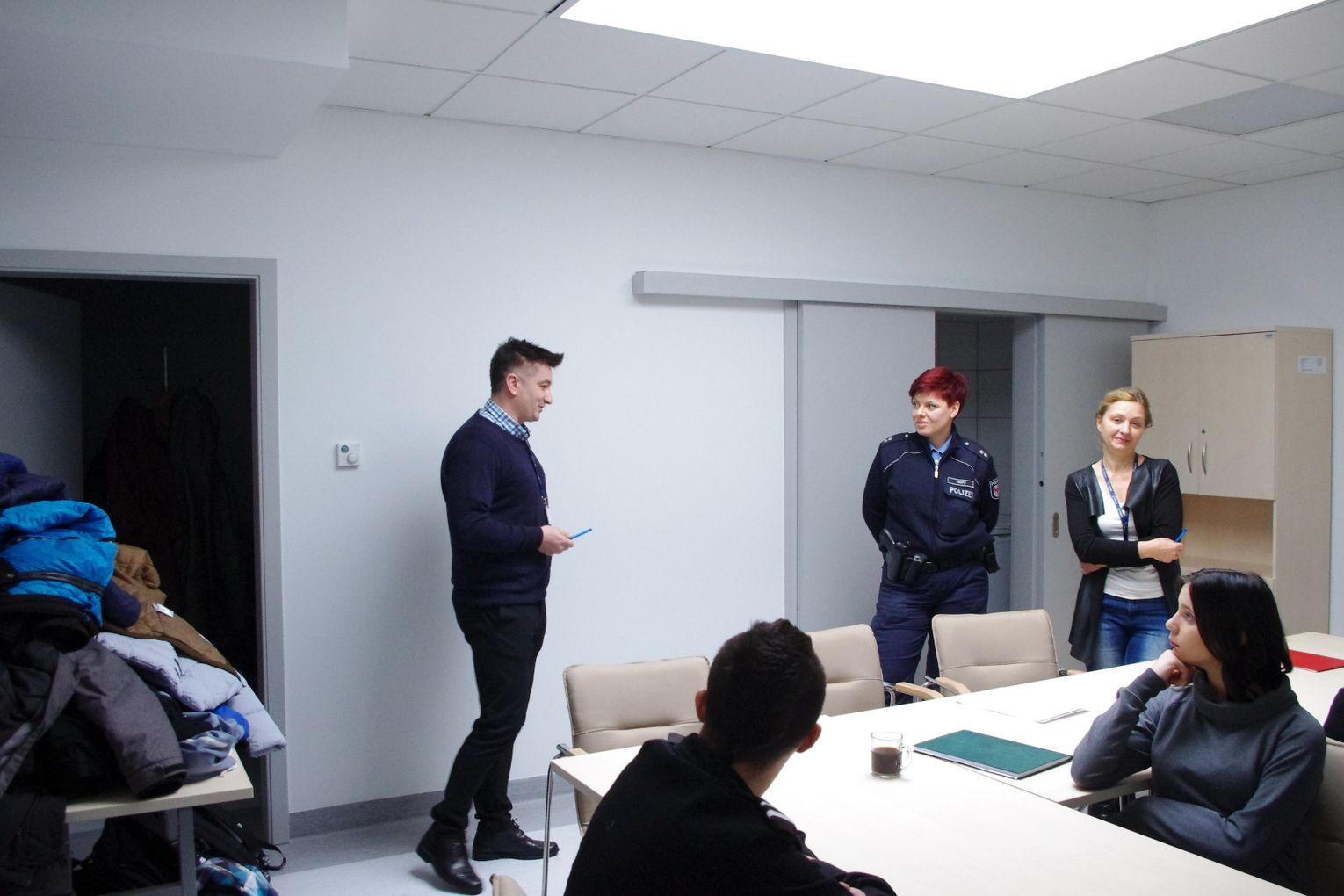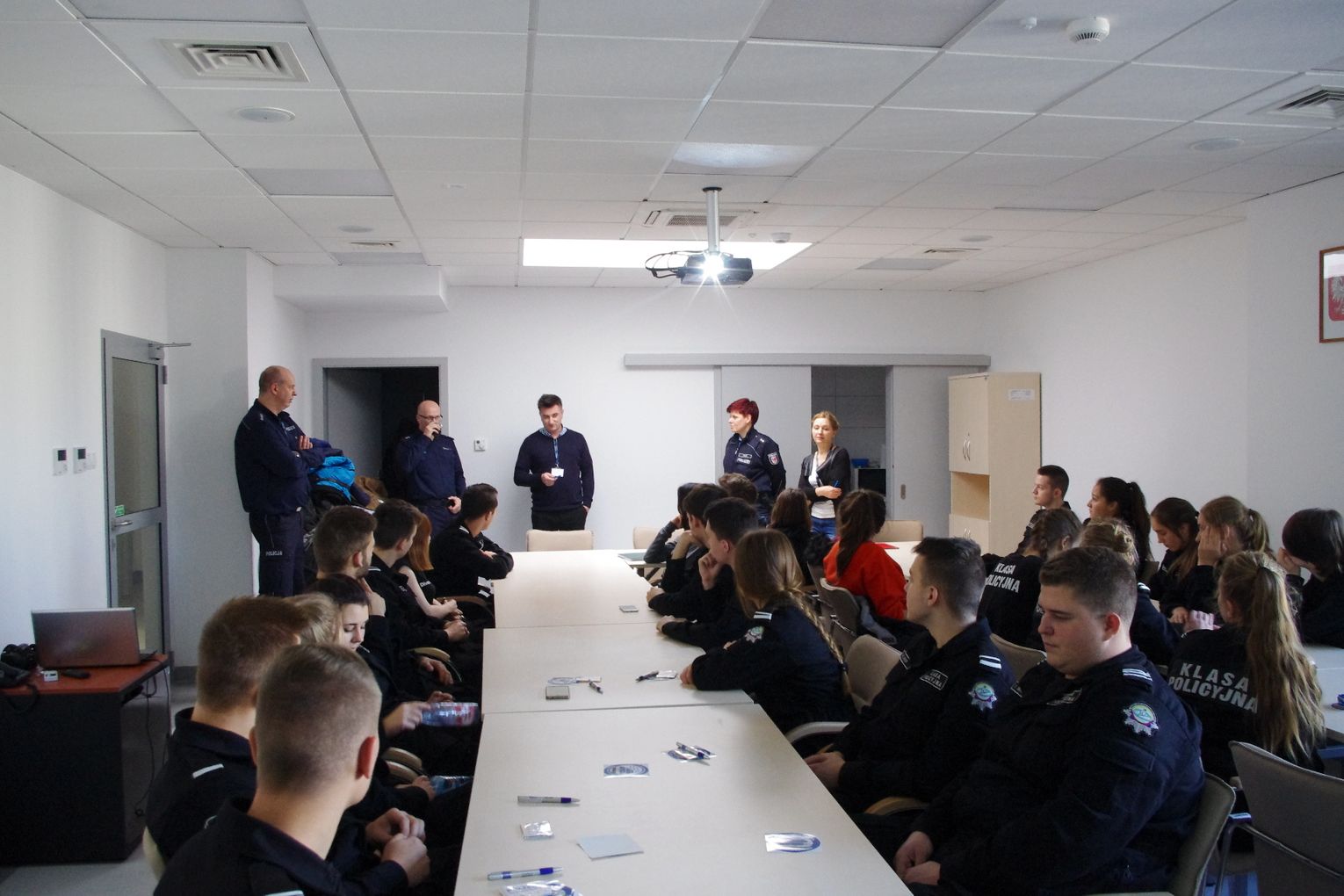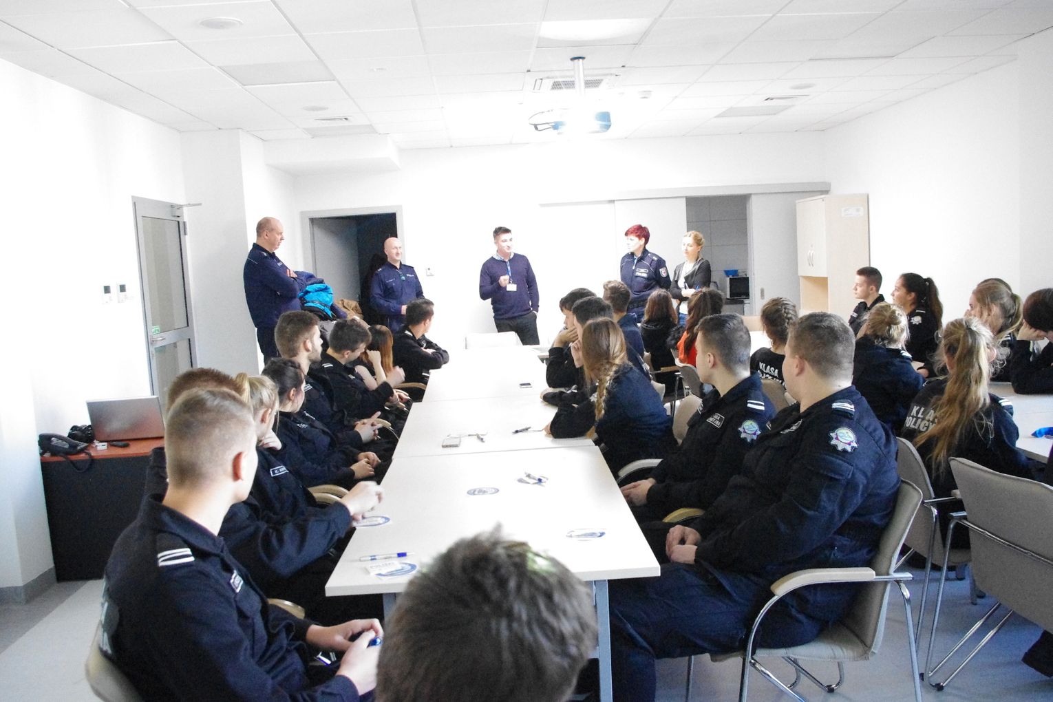 Spotkanie rozpoczął oraz oficjalnie przywitał gości zastępca komendanta Powiatowego Policji w Gryfinie kom. Radosław Purtak. Ponadto w spotkaniu udział wzięli: naczelnik Wydziału Prewencji i Ruchu Drogowego KPP w Gryfinie asp.sztab. Grzegorz Klimek, naczelnik Wydziału Prewencji KP w Chojnie podkom. Robert Panna, nadkom. Thea Trapp z niemieckiej policji w Schwedt, asystent ds. profilaktyki w KPP Gryfino sierż.sztab. Michał Zaniewski, technik Zespołu Kadr i szkolenia KPP w Gryfinie oraz młodzież z klasy policyjnej.