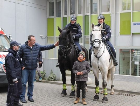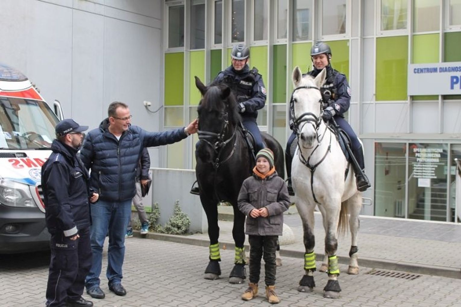 Przed oknami szpitala, punkt o godzinie 12.00, pojawiło się dwóch jeźdźców z sekcji konnej Komendy Wojewódzkiej Policji w Szczecinie. Karmel i Vir – czworonożni funkcjonariusze sprawili ogromną radość małym bohaterom ( pacjentom kliniki ). Ci którzy mieli możliwość, zeszli na dół aby się z nimi przywitać, pozostałe dzieci cierpliwie stały przy oknach i machały rękoma na powitanie, zapraszając jednocześnie funkcjonariuszy na oddziały.