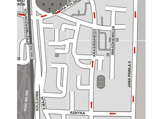 - ruch tranzytowy przekierowany na ul. Kolejową (ulica będzie tymczasowo dwukierunkowa)
