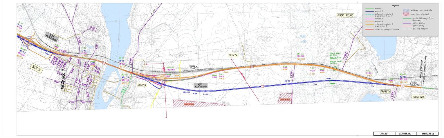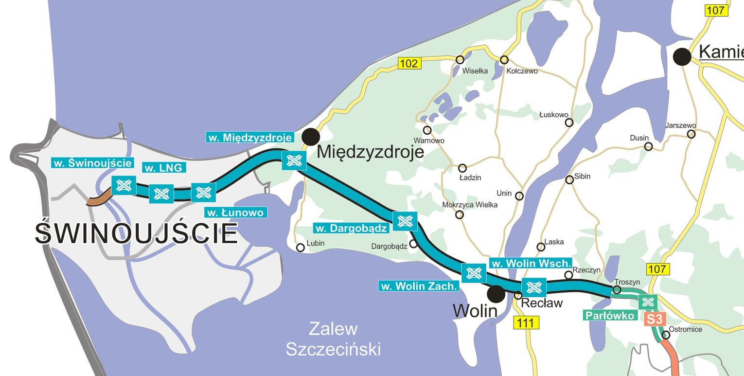 Początkiem odcinka Świnoujście - Troszyn będzie skrzyżowanie ulic Fińskiej, Duńskiej i Wolińskiej w Świnoujściu, które znajduje się przy terminalu promów morskich, w miejscu tym niniejsza inwestycja będzie się łączyła z wlotem do tunelu łączącym wyspy Uznam i Wolin. Trasa będzie przebiegała w dużej mierze z wykorzystaniem istniejącego korytarza drogi krajowej nr 3. Droga będzie miała dwie jezdnie po dwa pasy ruchu w każdą stronę wraz z pasami awaryjnymi. Zaplanowano 7 węzłów drogowych, z tego 3 na terenie Miasta Świnoujście. Trasa zakończy się na włączeniu w istniejącą obwodnicę Troszyna, Parłówka i Ostromic.