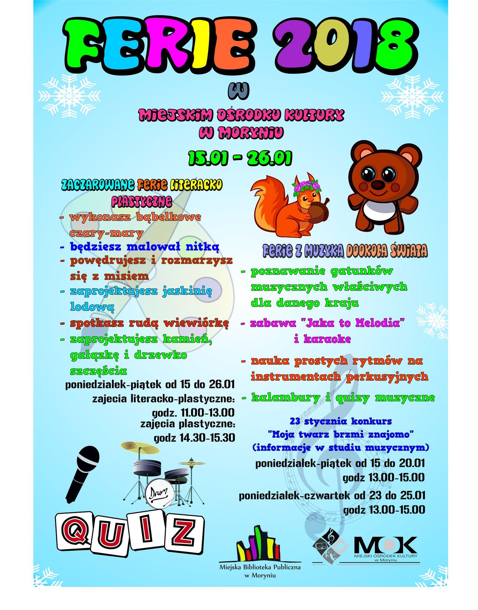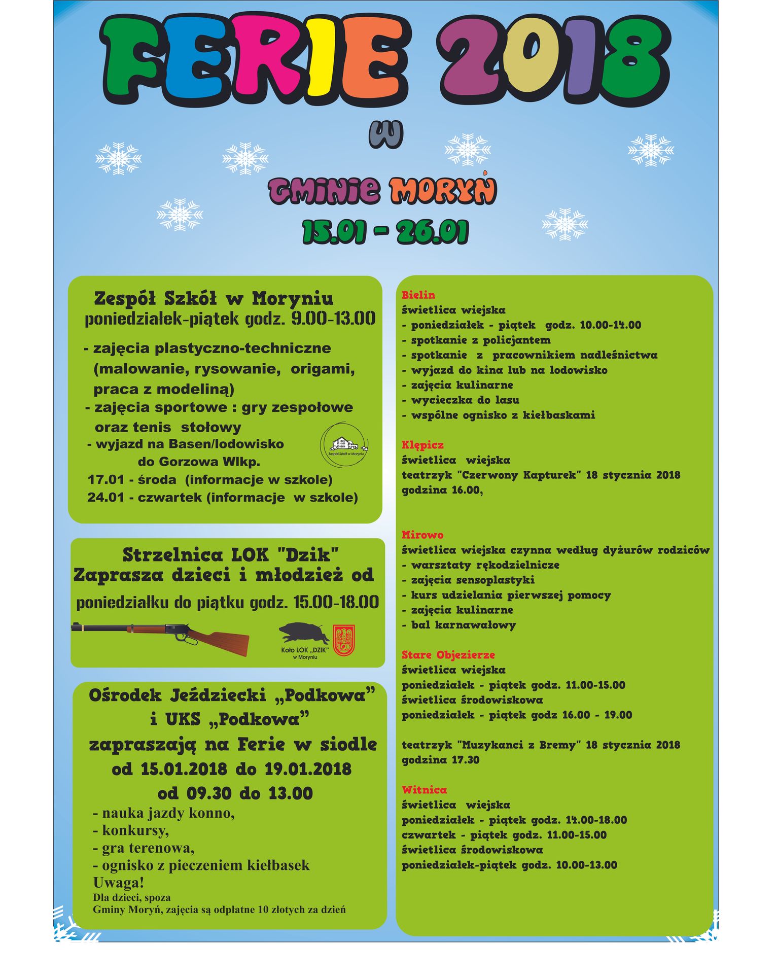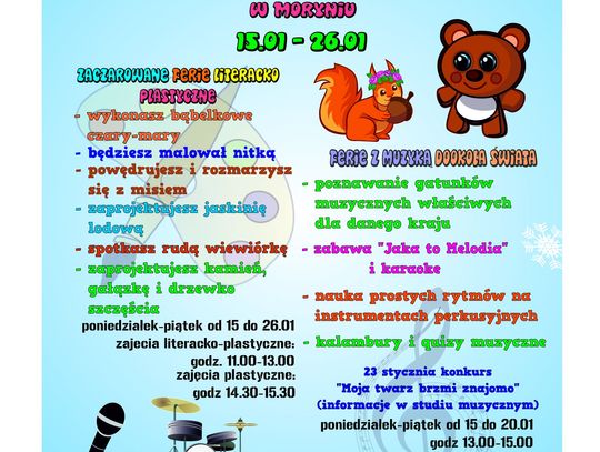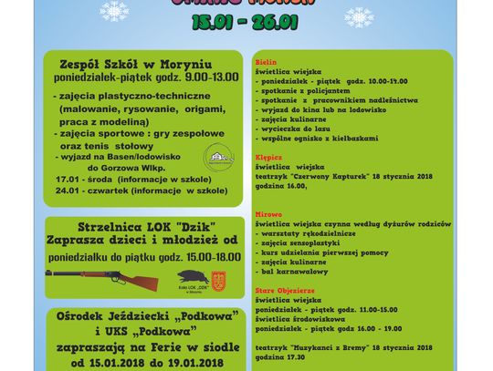 Poniżej prezentujemy harmonogram zajęć organizowanych podczas tegorocznych ferii zimowych, które formalnie zaczynają się od poniedziałku 156 stycznia 2018 r.