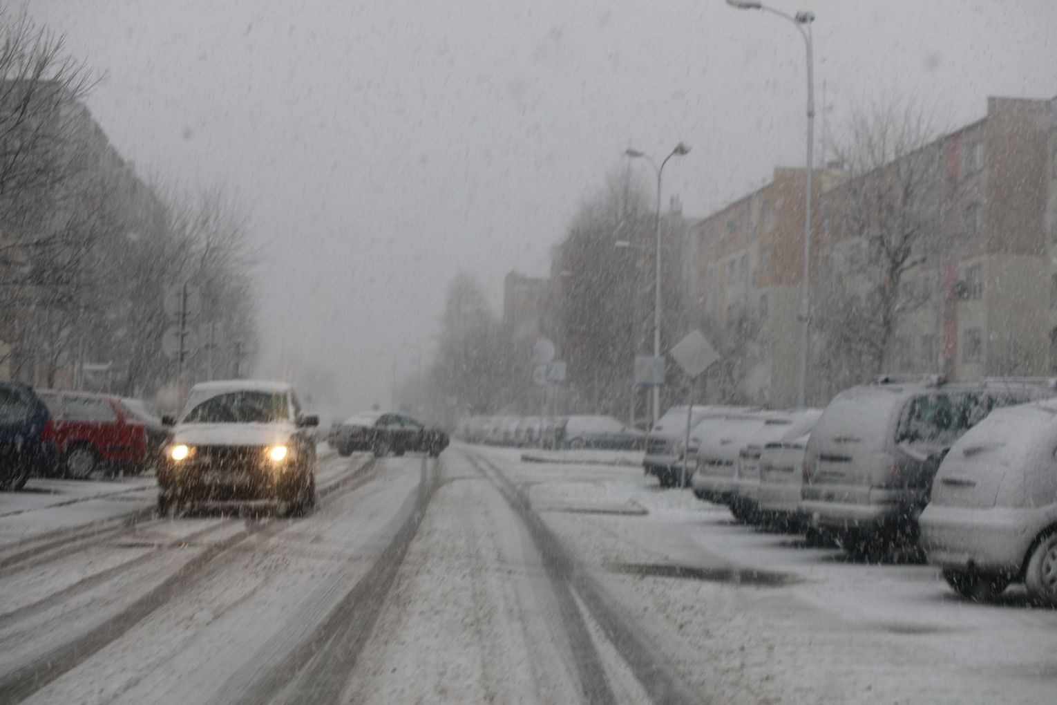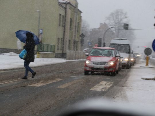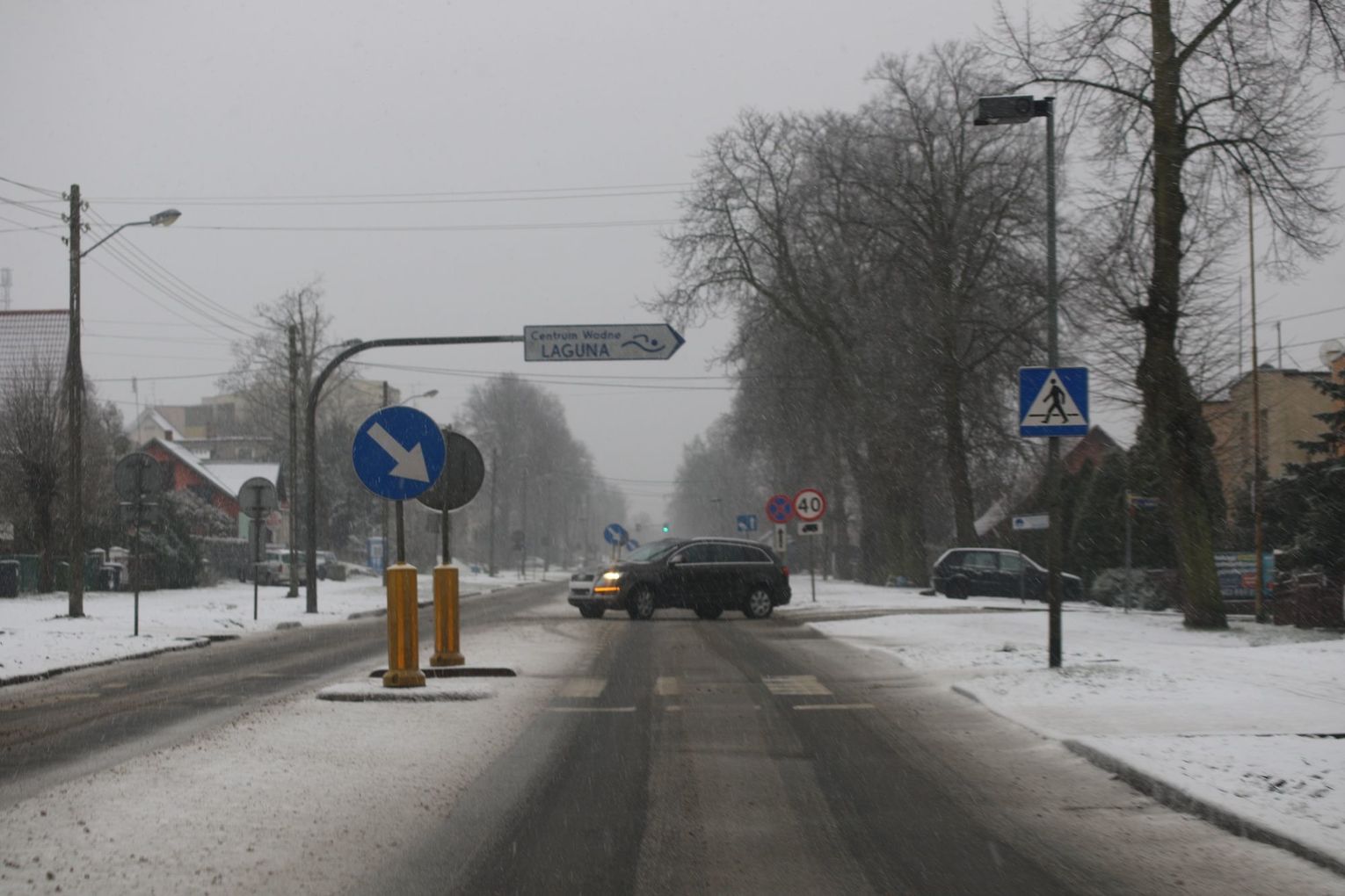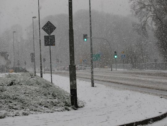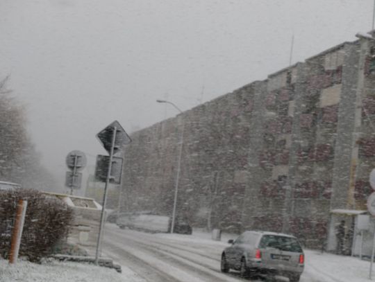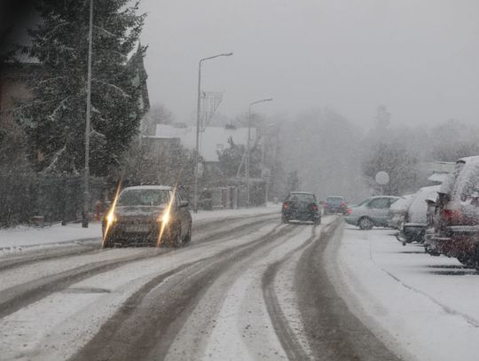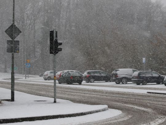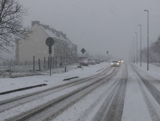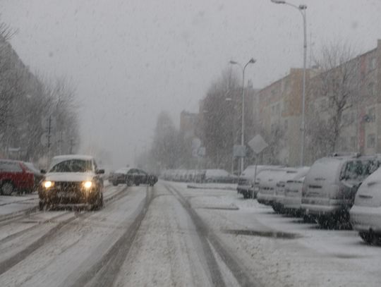 Znaki poziome i pionowe na ulicach przysypane są śniegiem. Samochody ślizgają się na drodze, zwłaszcza na zakrętach.