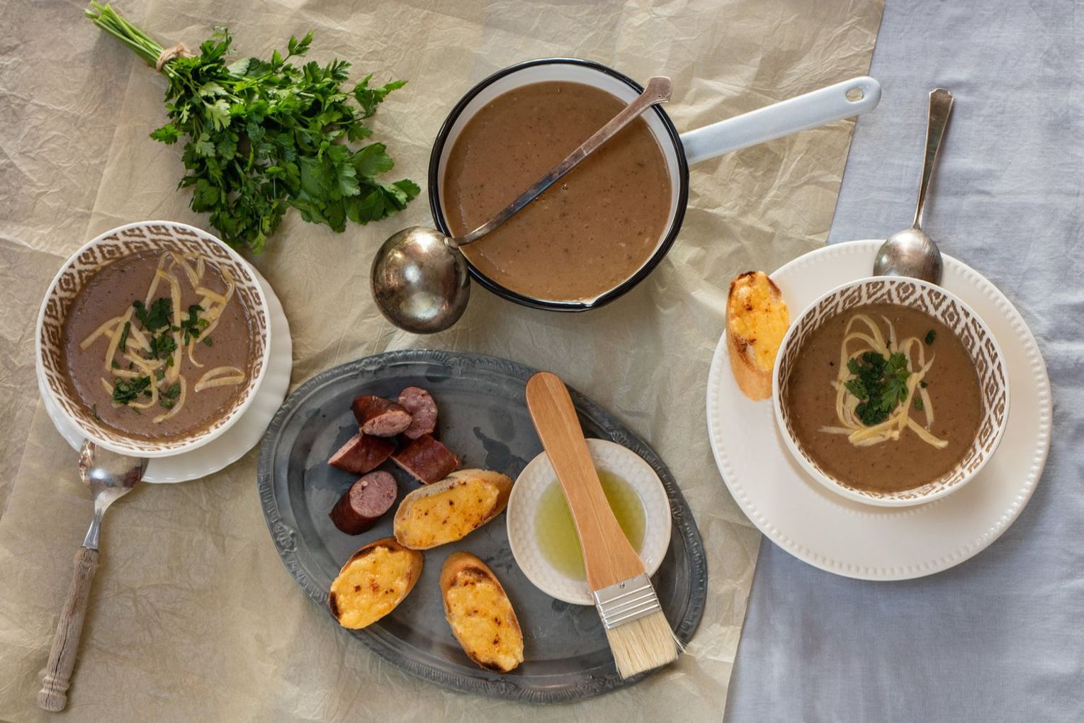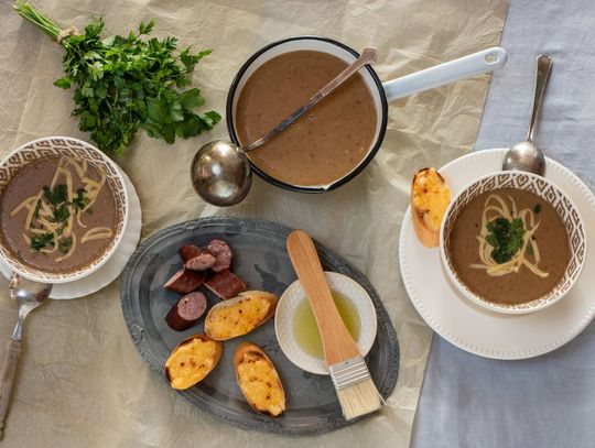 Zupa chlebowa z czosnkiem, serem i wędzoną kiełbaską