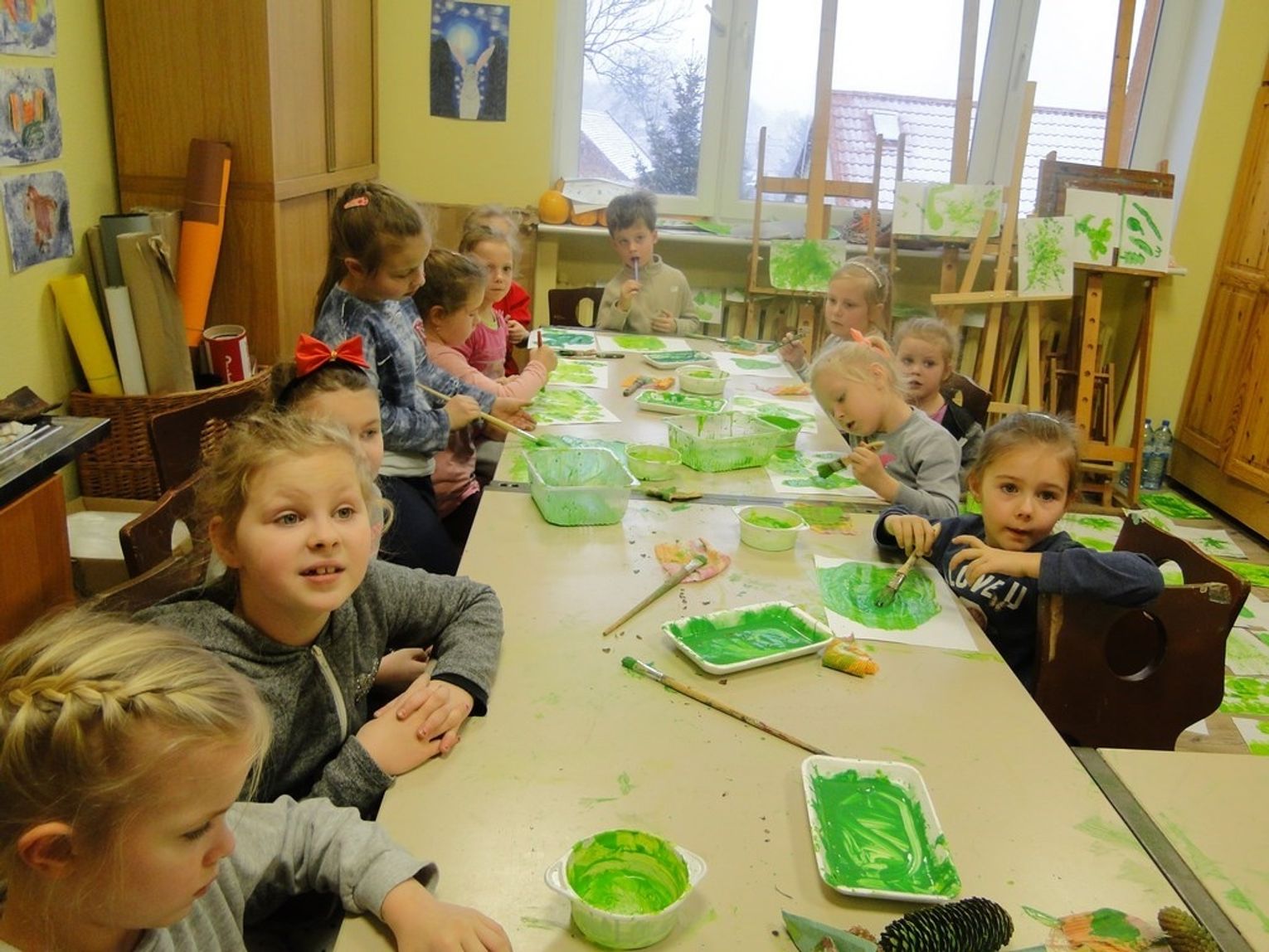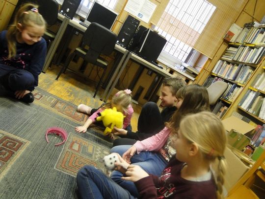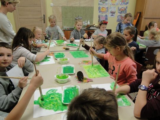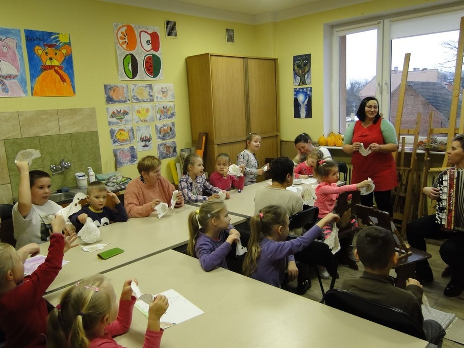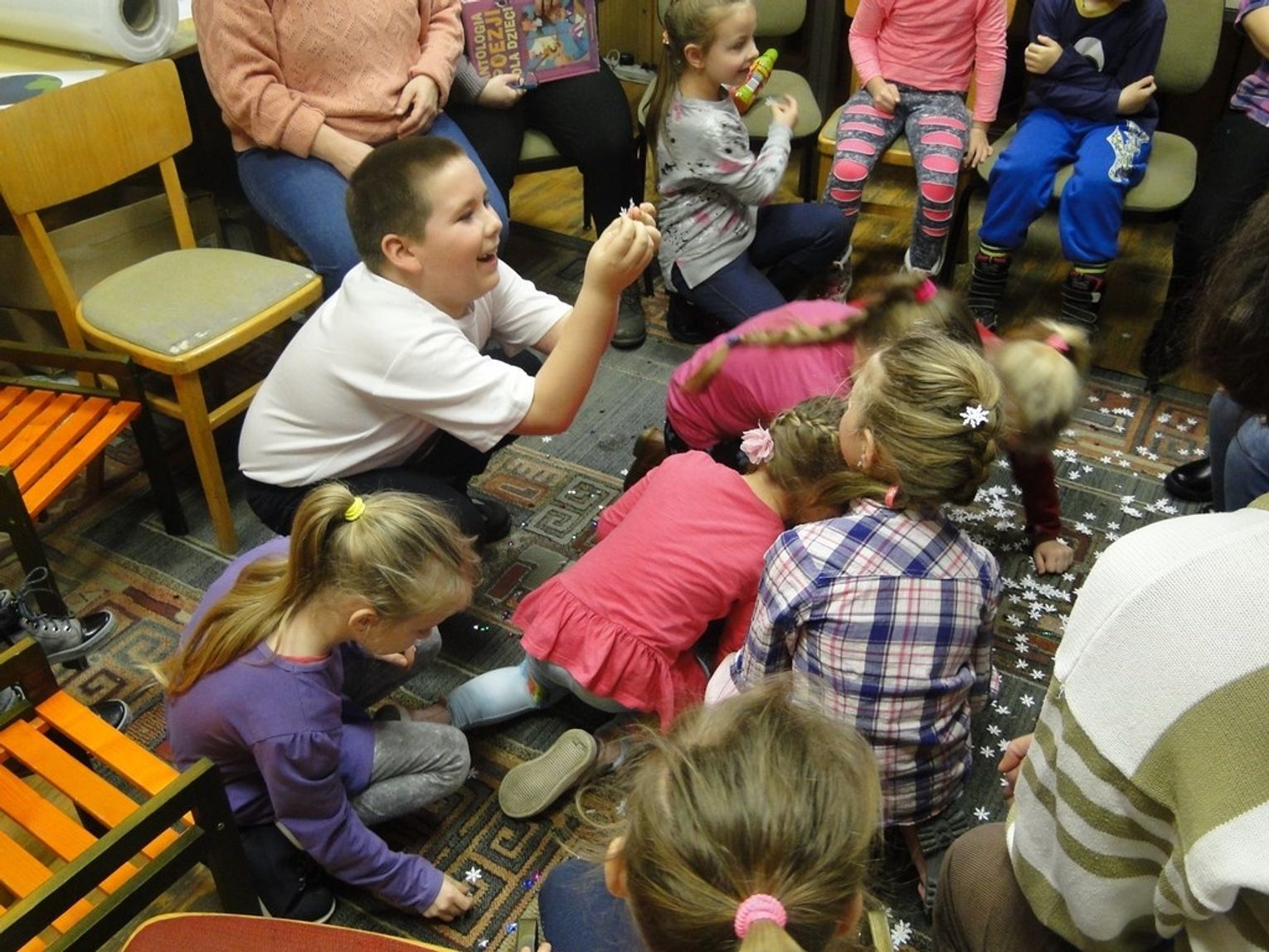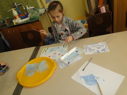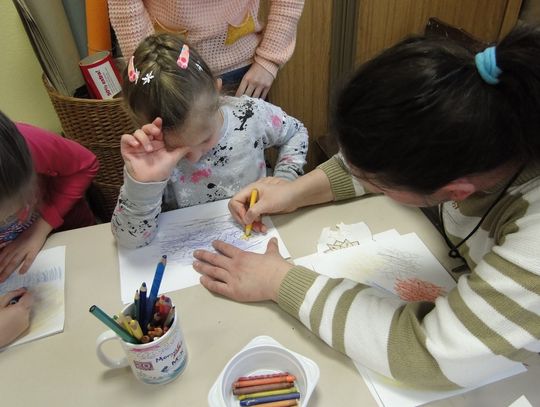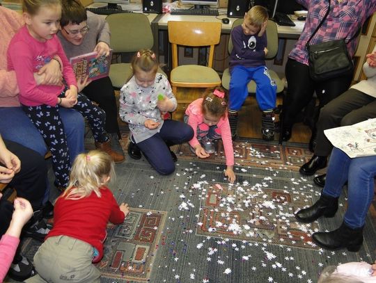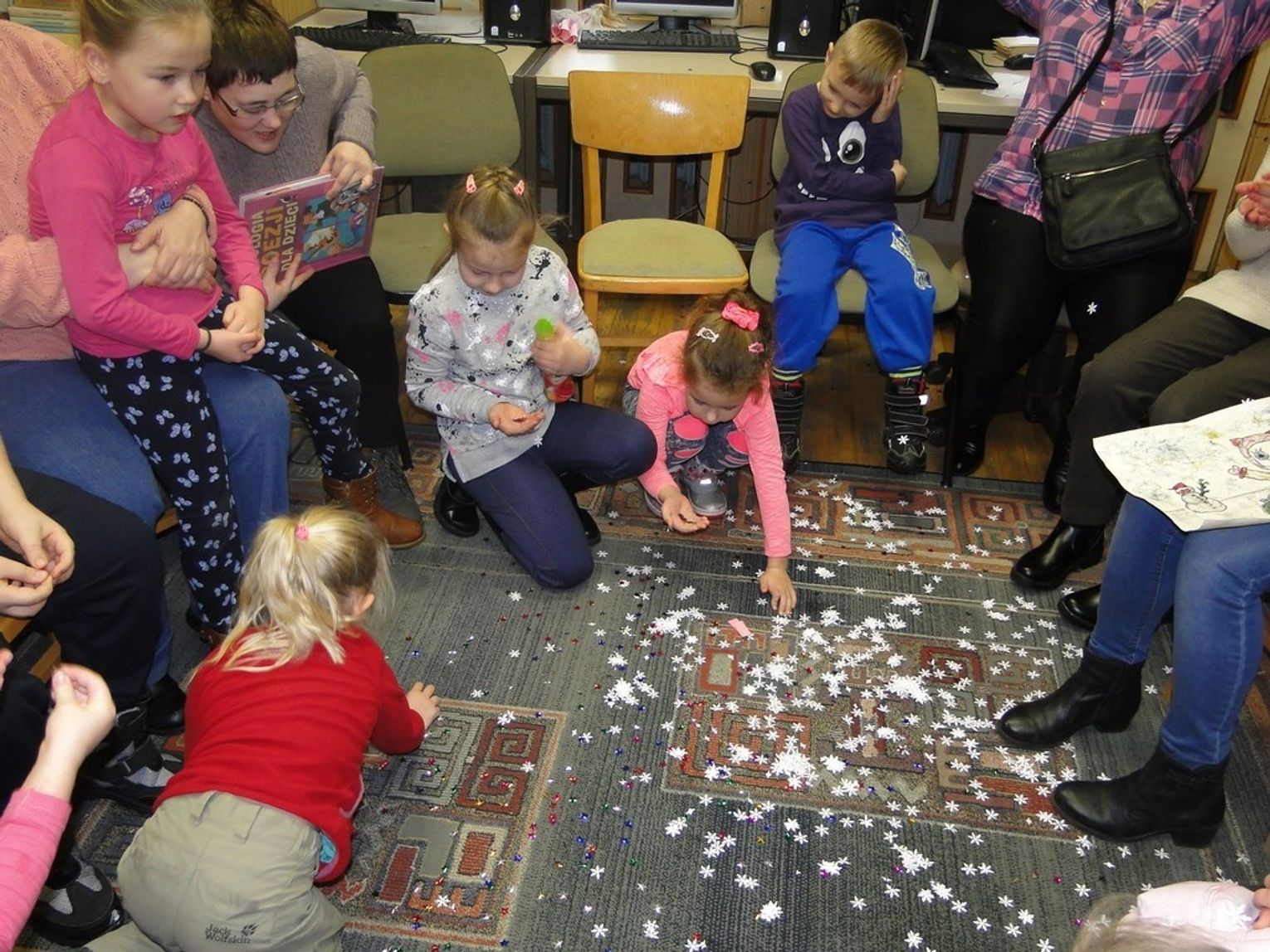 Codzienne literacko – plastyczno – muzyczne spotkania rozpoczynały się w bibliotece, gdzie dzieci zapoznawały się z tematem dnia, m.in.: „Wędrówki, podróże, wycieczki z zimowym misiem”, „Zatrzymujemy zimę na kamykach” - tajemnice prehistorii, „Czarujemy zimowy pejzaż” - spotkanie integracyjne z mieszkańcami Domu Pomocy Społecznej w Moryniu, „Igliczki-śnieżyczki” - rozpoznawanie różnych gatunków drzew iglastych, „Dzielimy się szczęściem” - tematem zajęć był dziadek i babcia, „Zima solą malowana” - legenda o Wieliczce, „Spotkanie z rudą wiewiórką” - portret wiewiórki z szyszką, „Bąbelkowe czary-mary” - wykonanie pracy plastycznej przy pomocy folii bąbelkowej czy wreszcie „Jaskinia lodowa” - spotkanie z p. Urszulą Kaczmarek – pasjonatką skamielin, kamieni i skał oraz zaprojektowanie własnej jaskini przy wykorzystaniu różnych technik.