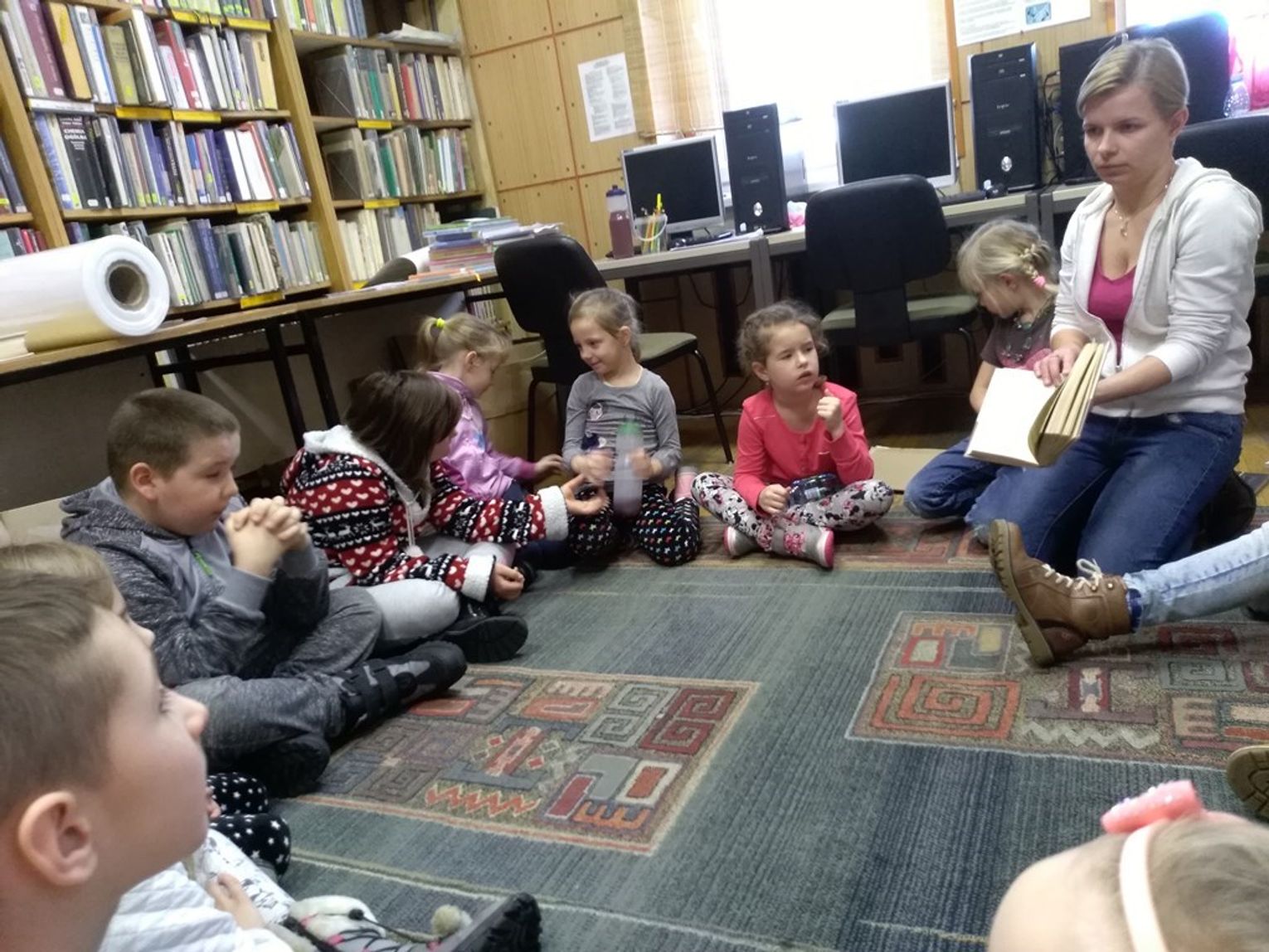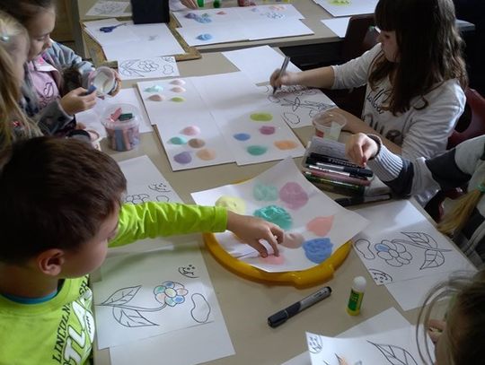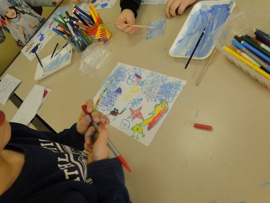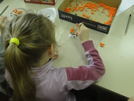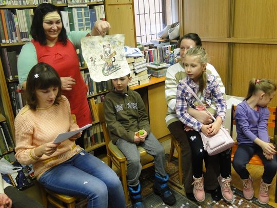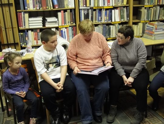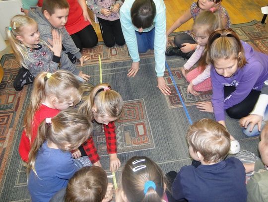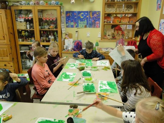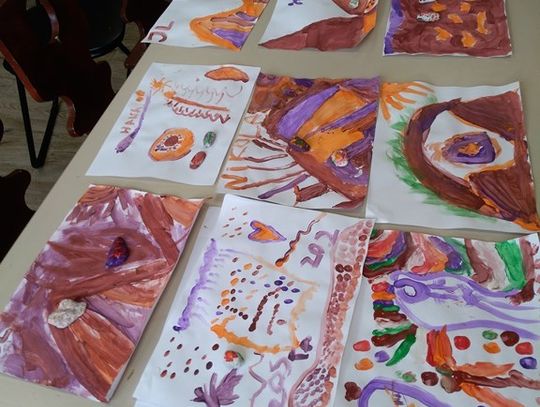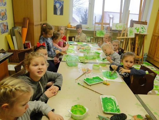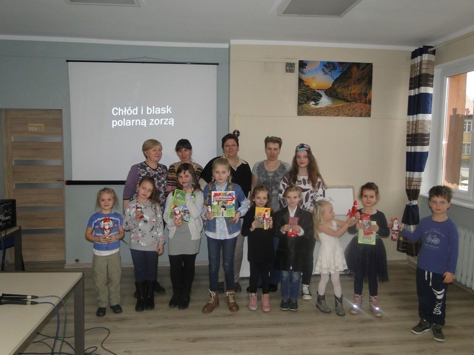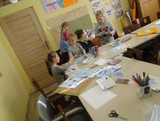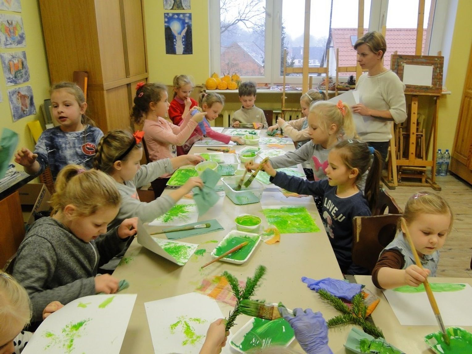 Codzienne literacko – plastyczno – muzyczne spotkania rozpoczynały się w bibliotece, gdzie dzieci zapoznawały się z tematem dnia, m.in.: „Wędrówki, podróże, wycieczki z zimowym misiem”, „Zatrzymujemy zimę na kamykach” - tajemnice prehistorii, „Czarujemy zimowy pejzaż” - spotkanie integracyjne z mieszkańcami Domu Pomocy Społecznej w Moryniu, „Igliczki-śnieżyczki” - rozpoznawanie różnych gatunków drzew iglastych, „Dzielimy się szczęściem” - tematem zajęć był dziadek i babcia, „Zima solą malowana” - legenda o Wieliczce, „Spotkanie z rudą wiewiórką” - portret wiewiórki z szyszką, „Bąbelkowe czary-mary” - wykonanie pracy plastycznej przy pomocy folii bąbelkowej czy wreszcie „Jaskinia lodowa” - spotkanie z p. Urszulą Kaczmarek – pasjonatką skamielin, kamieni i skał oraz zaprojektowanie własnej jaskini przy wykorzystaniu różnych technik.