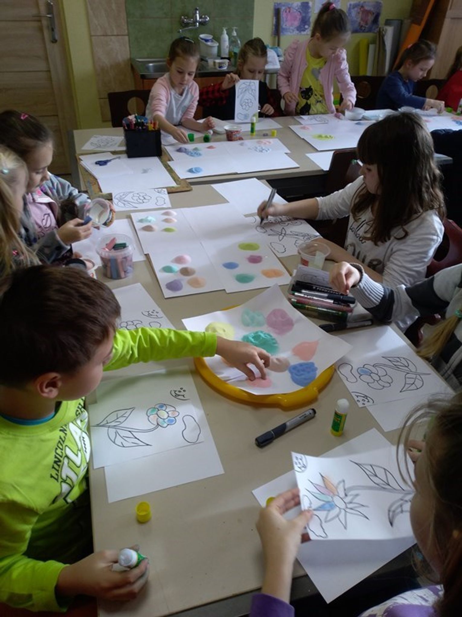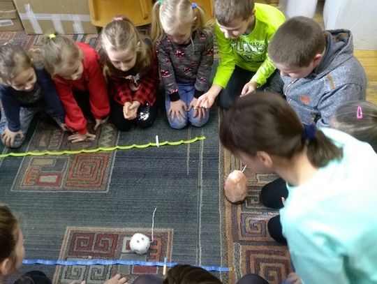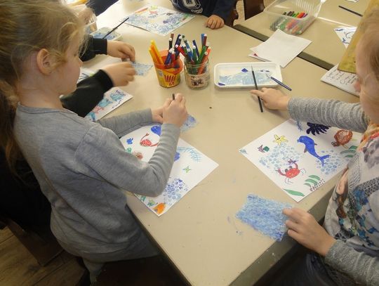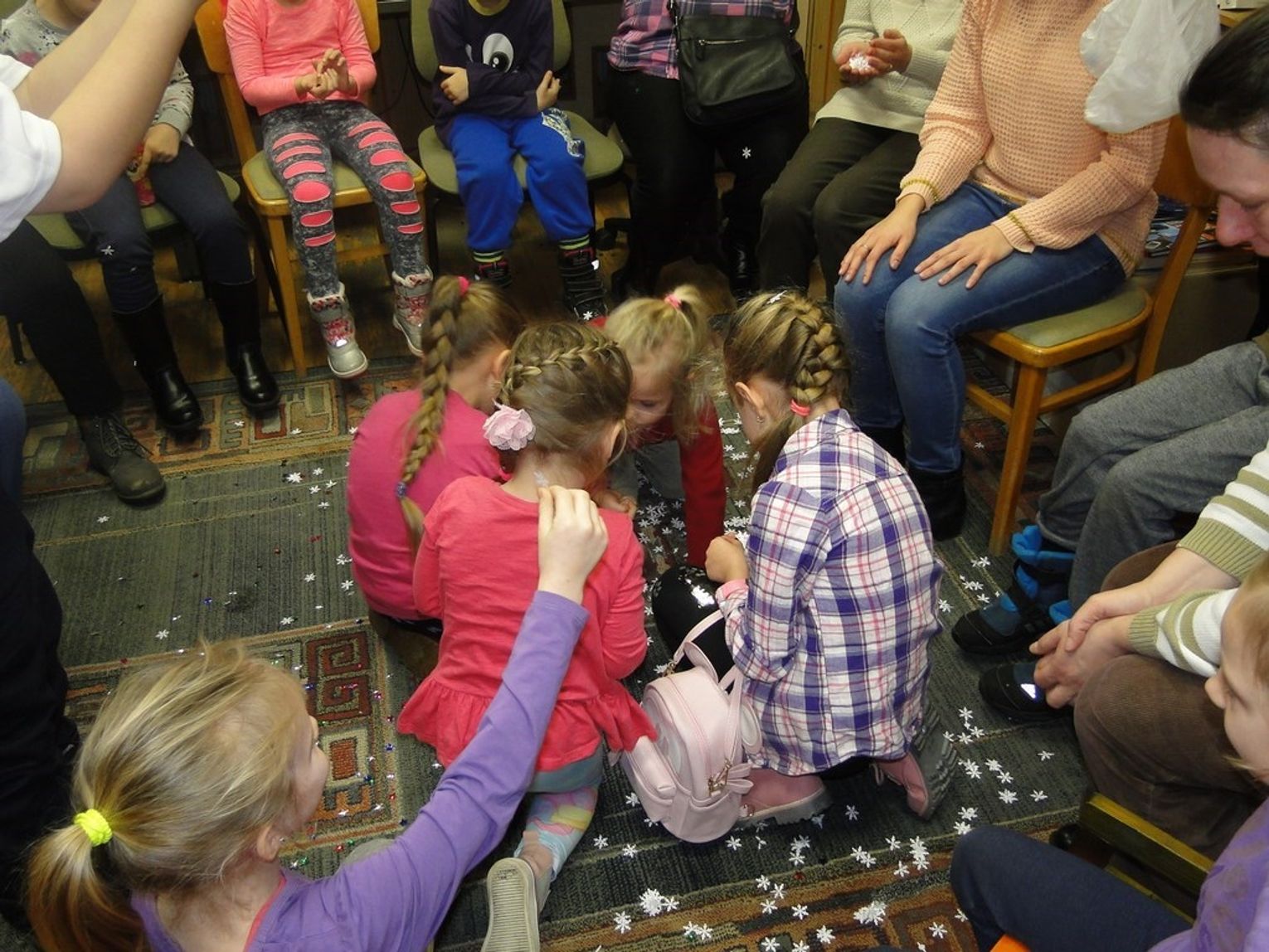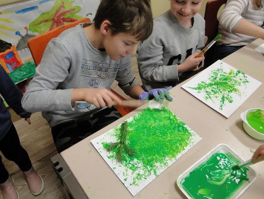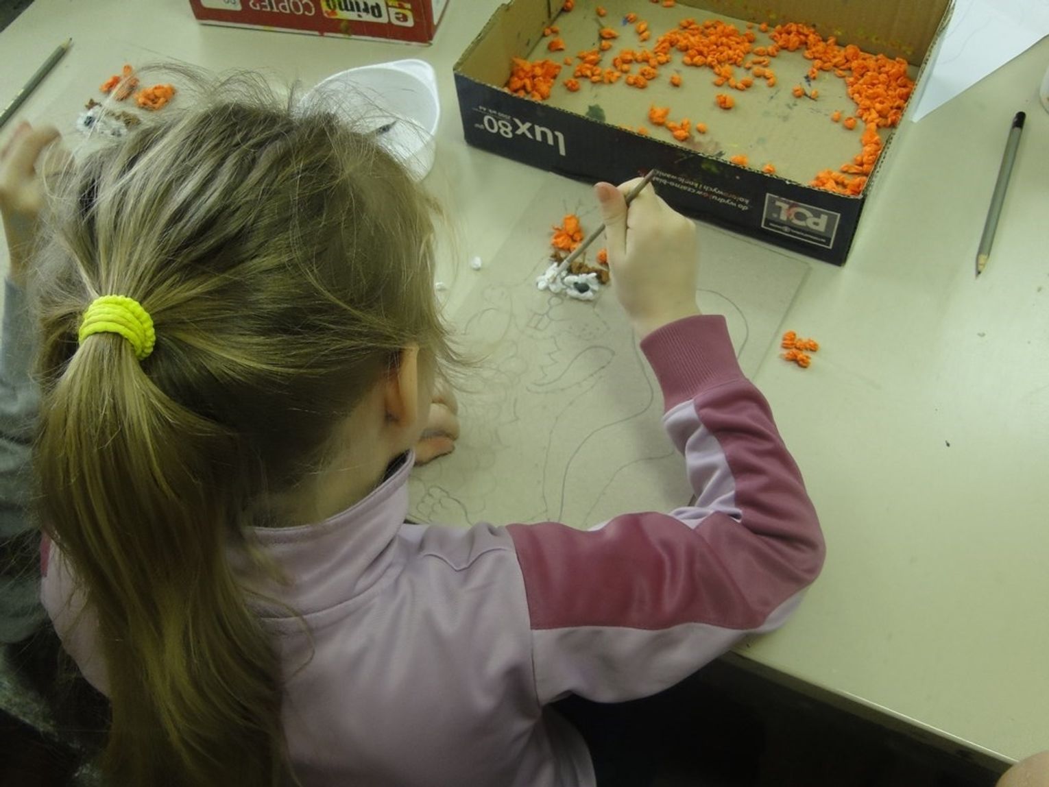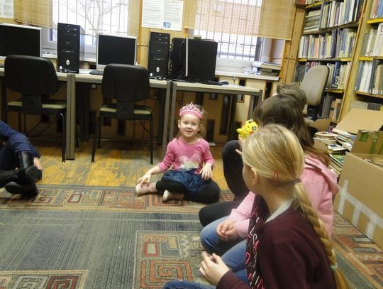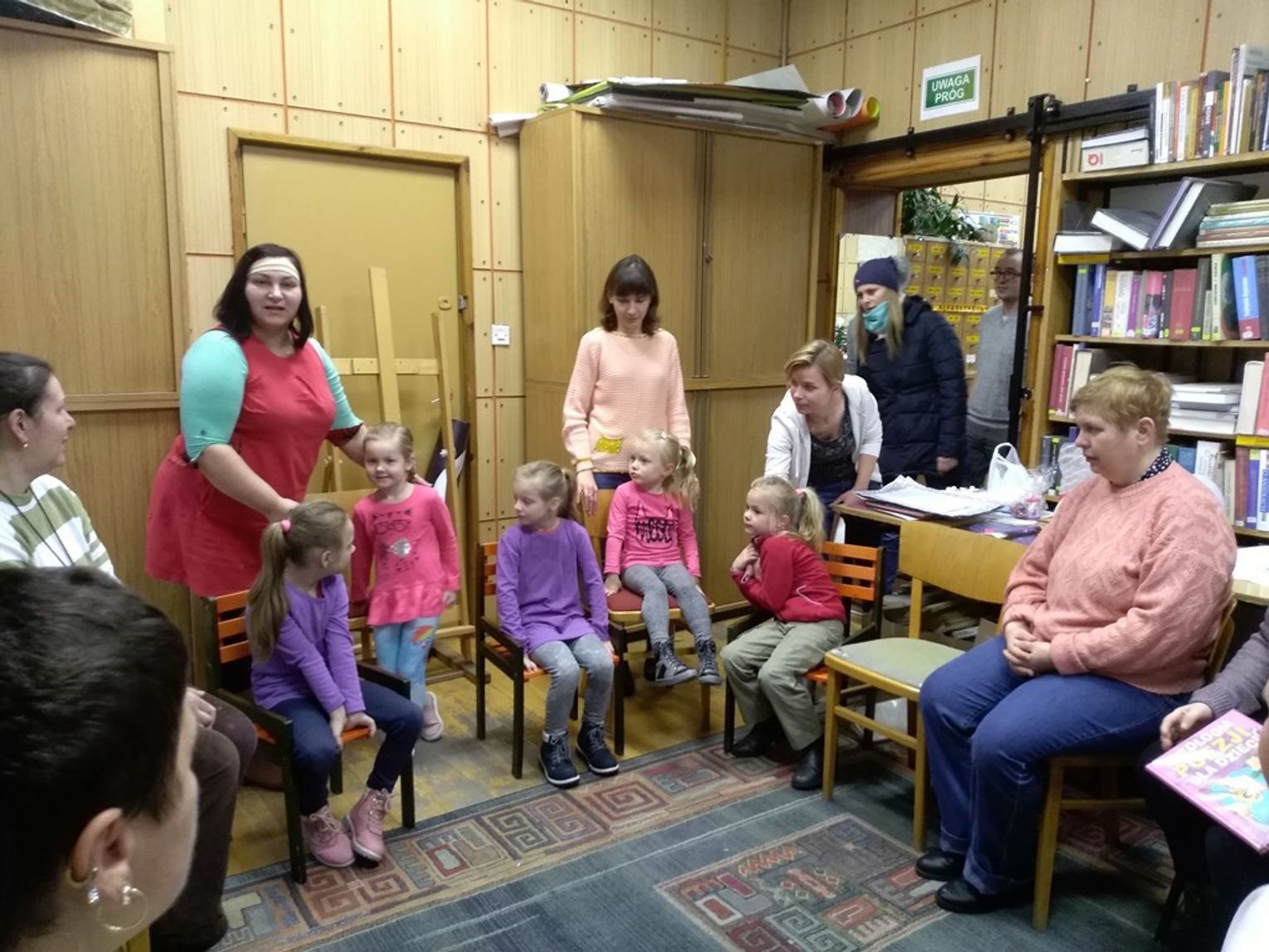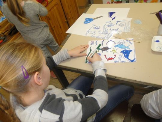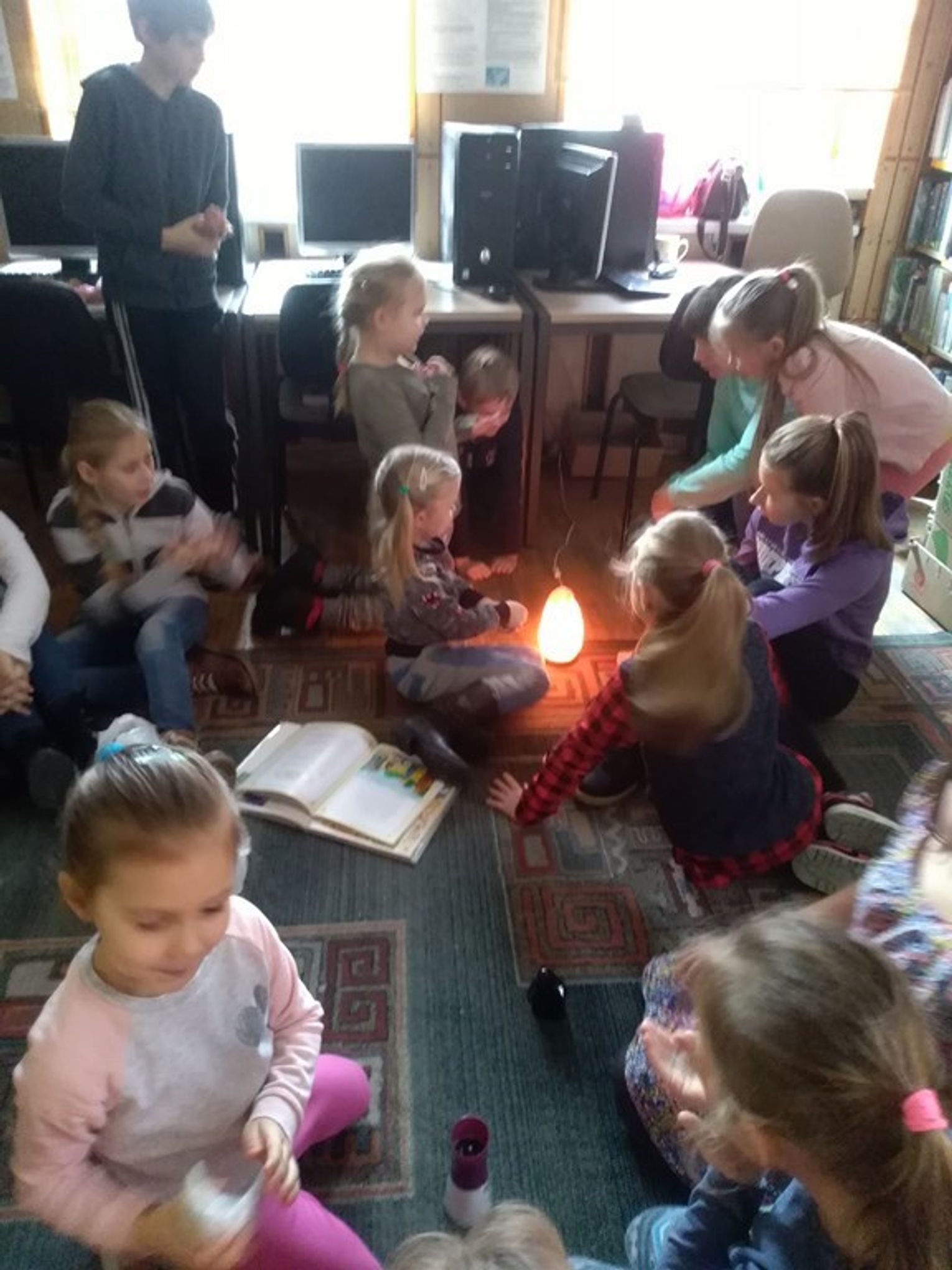 Codzienne literacko – plastyczno – muzyczne spotkania rozpoczynały się w bibliotece, gdzie dzieci zapoznawały się z tematem dnia, m.in.: „Wędrówki, podróże, wycieczki z zimowym misiem”, „Zatrzymujemy zimę na kamykach” - tajemnice prehistorii, „Czarujemy zimowy pejzaż” - spotkanie integracyjne z mieszkańcami Domu Pomocy Społecznej w Moryniu, „Igliczki-śnieżyczki” - rozpoznawanie różnych gatunków drzew iglastych, „Dzielimy się szczęściem” - tematem zajęć był dziadek i babcia, „Zima solą malowana” - legenda o Wieliczce, „Spotkanie z rudą wiewiórką” - portret wiewiórki z szyszką, „Bąbelkowe czary-mary” - wykonanie pracy plastycznej przy pomocy folii bąbelkowej czy wreszcie „Jaskinia lodowa” - spotkanie z p. Urszulą Kaczmarek – pasjonatką skamielin, kamieni i skał oraz zaprojektowanie własnej jaskini przy wykorzystaniu różnych technik.