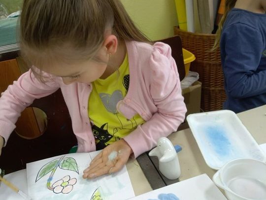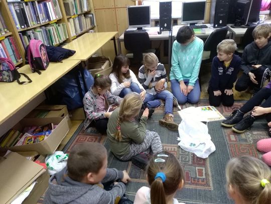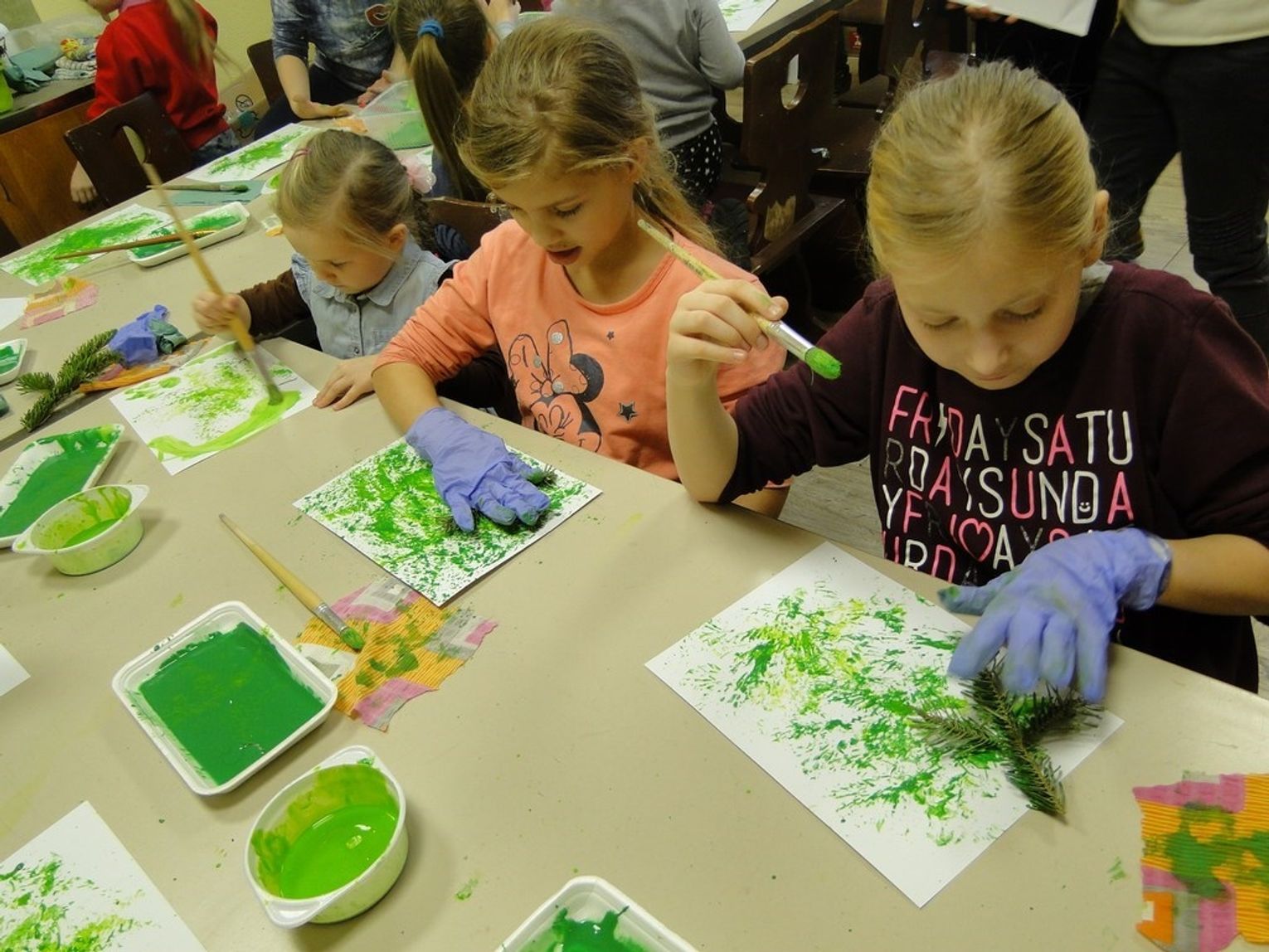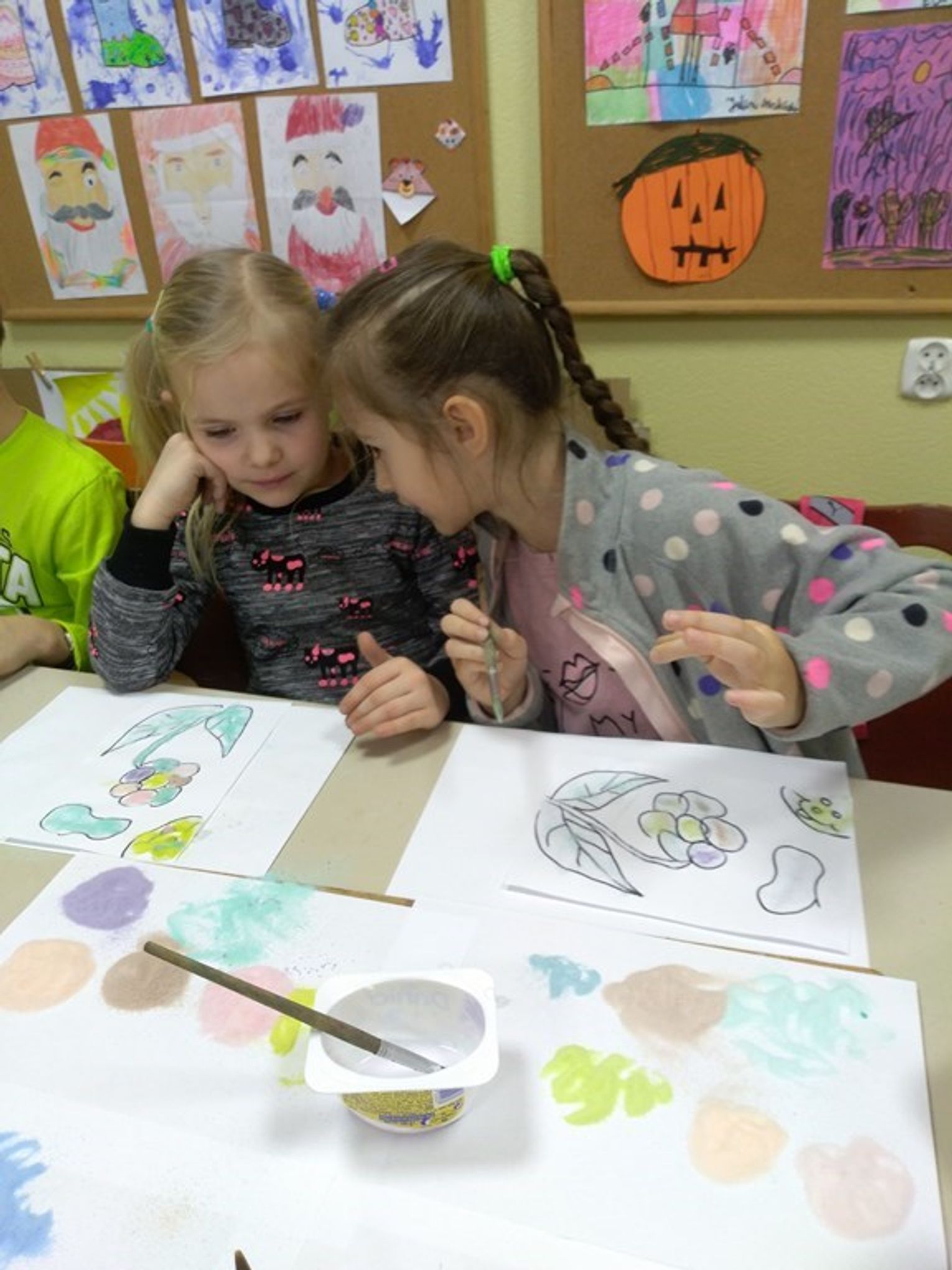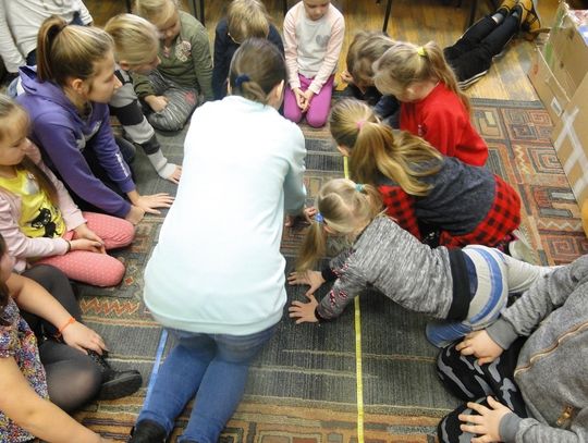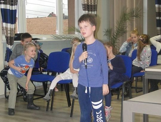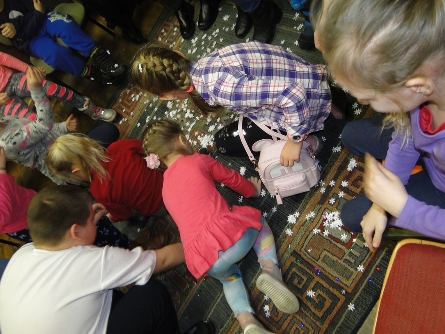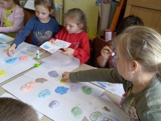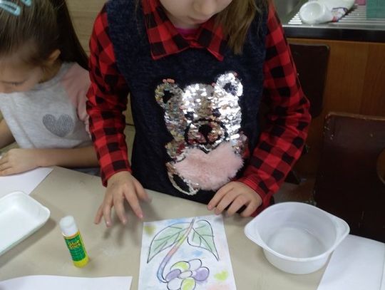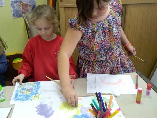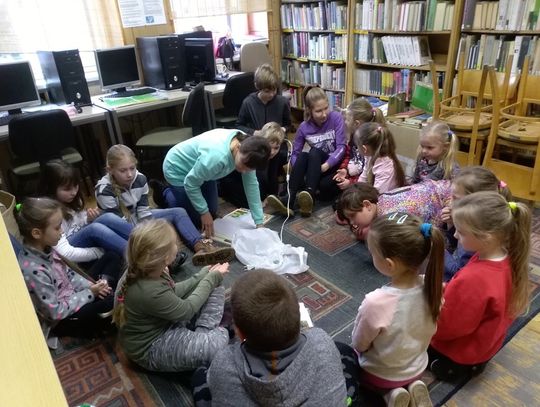 Codzienne literacko – plastyczno – muzyczne spotkania rozpoczynały się w bibliotece, gdzie dzieci zapoznawały się z tematem dnia, m.in.: „Wędrówki, podróże, wycieczki z zimowym misiem”, „Zatrzymujemy zimę na kamykach” - tajemnice prehistorii, „Czarujemy zimowy pejzaż” - spotkanie integracyjne z mieszkańcami Domu Pomocy Społecznej w Moryniu, „Igliczki-śnieżyczki” - rozpoznawanie różnych gatunków drzew iglastych, „Dzielimy się szczęściem” - tematem zajęć był dziadek i babcia, „Zima solą malowana” - legenda o Wieliczce, „Spotkanie z rudą wiewiórką” - portret wiewiórki z szyszką, „Bąbelkowe czary-mary” - wykonanie pracy plastycznej przy pomocy folii bąbelkowej czy wreszcie „Jaskinia lodowa” - spotkanie z p. Urszulą Kaczmarek – pasjonatką skamielin, kamieni i skał oraz zaprojektowanie własnej jaskini przy wykorzystaniu różnych technik.